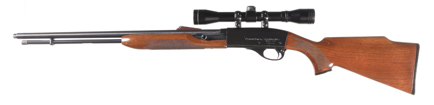 .22 sllr Serial # B1446103 Remington Tube fed .22 rimfire 552 Speedmaster with 22" Bbl and tube magazine. Varnished walnut stock and mounted with 4 power scope. Condition. Very good with most finish remaining with sights absent. Optics clear and stocks having a few impressions. Mechanically fine. Barrel 22" 1970 C&R