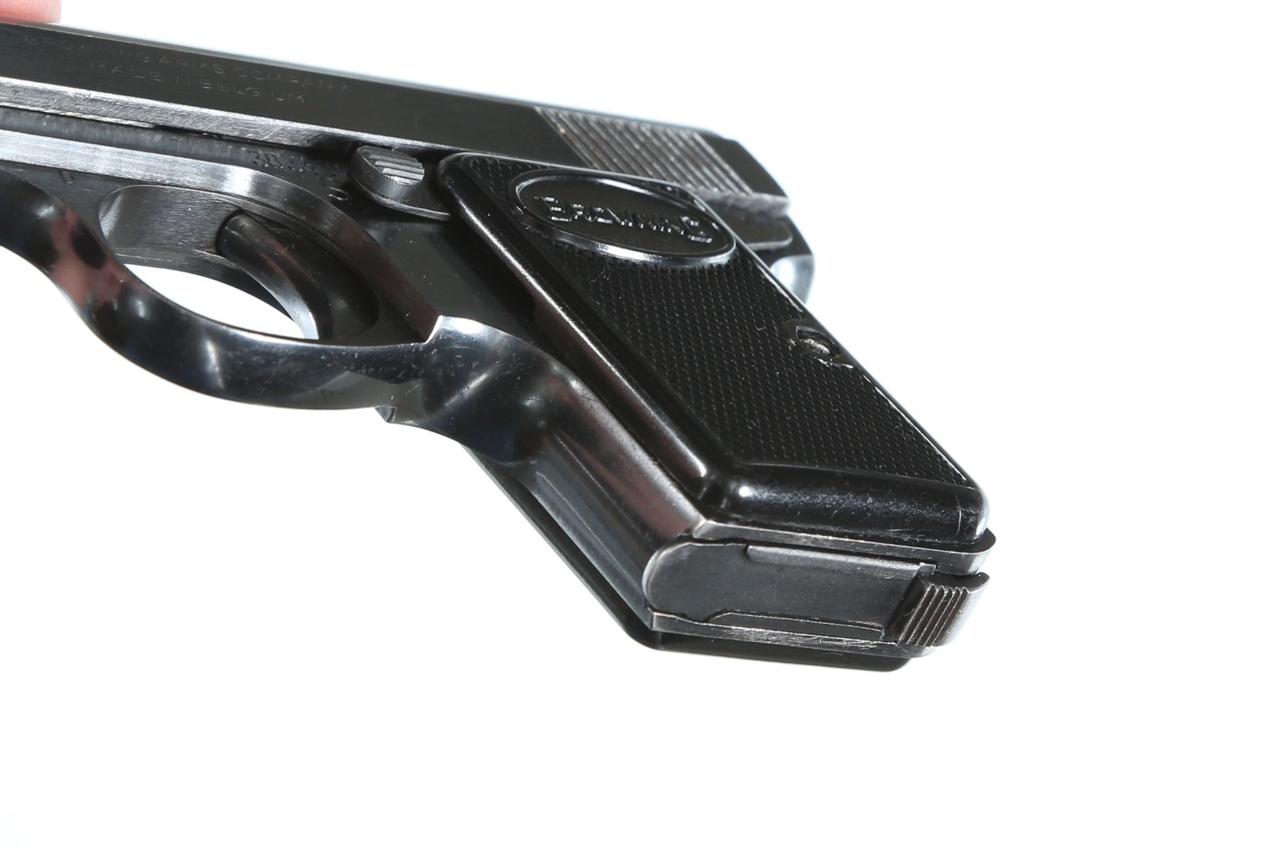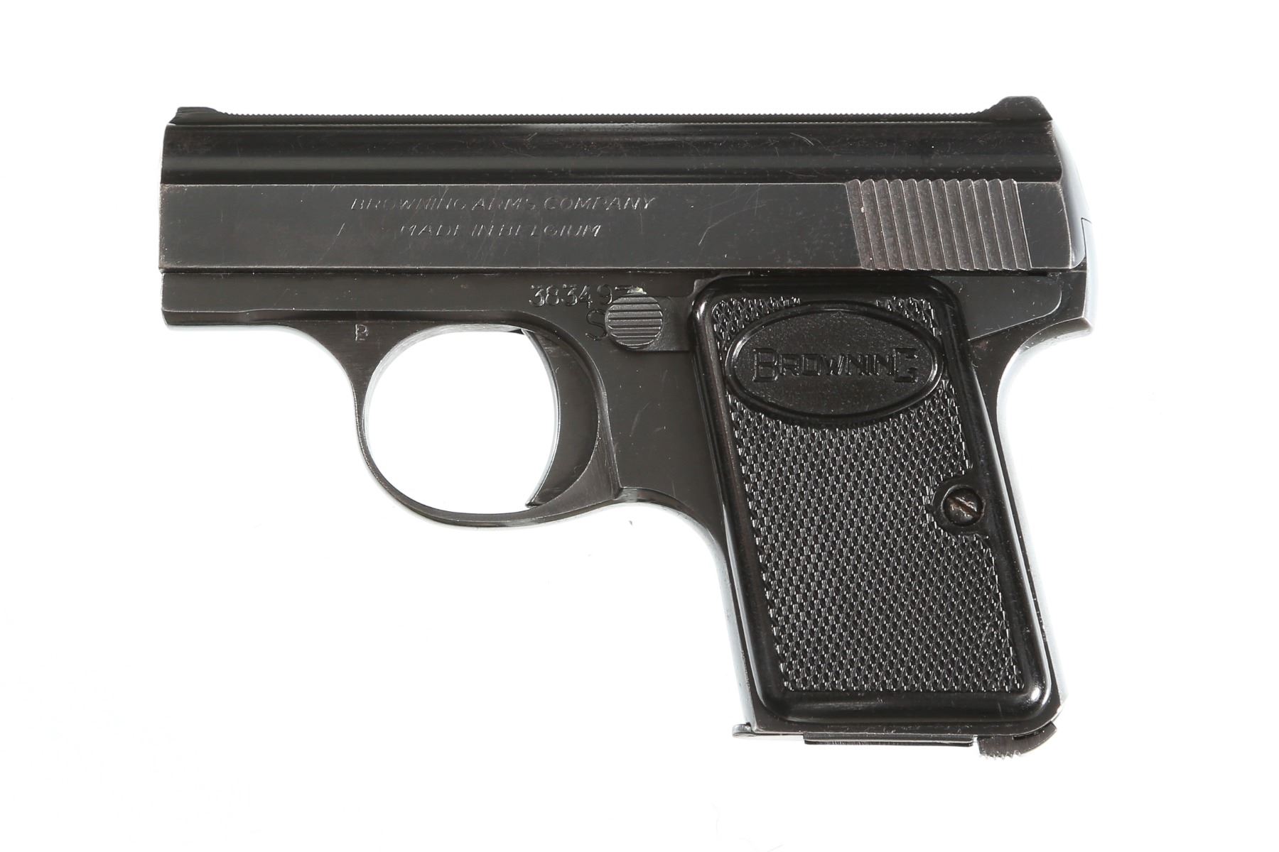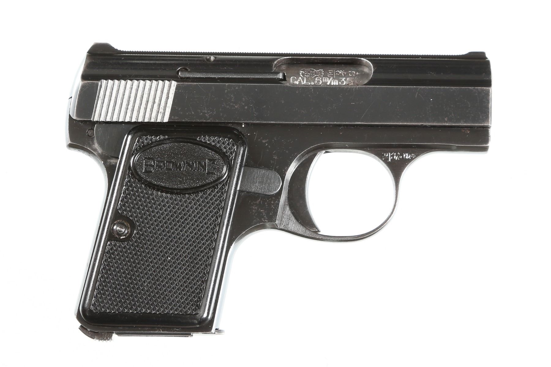 6.35mm Serial # 383497 Belgian Browning Baby Pocket 25 pistol in original zipper case mfg. 1967. Blue finished with black plastic grips with Browning monogram. Condition, Very fine with over 95% blue with slight edge wear, Bore is good and mechanically fine. Zipper case is very good. Barrel 2" C&R