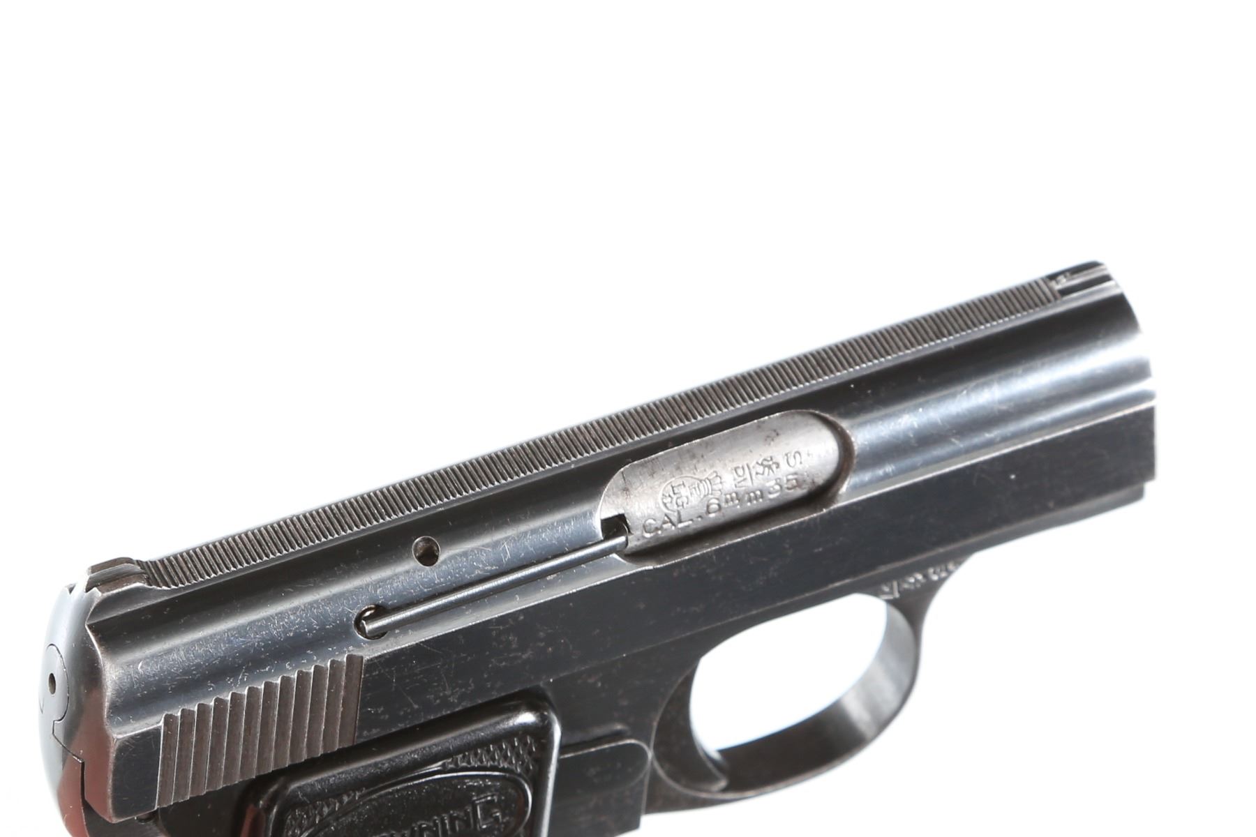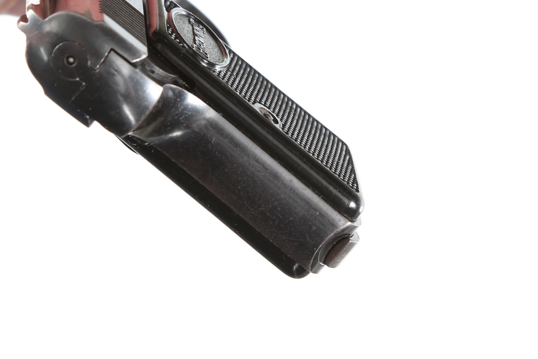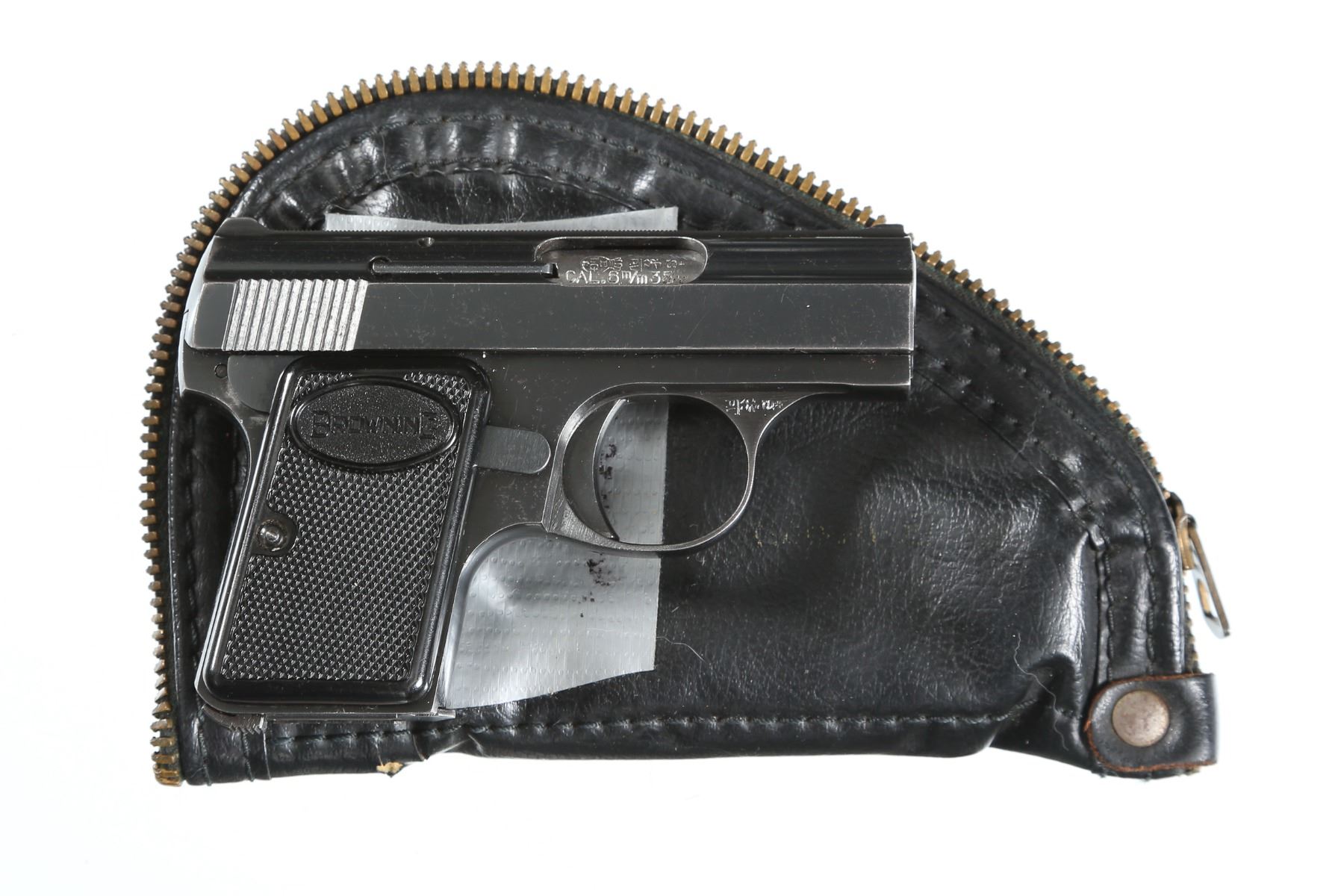 6.35mm Serial # 383497 Belgian Browning Baby Pocket 25 pistol in original zipper case mfg. 1967. Blue finished with black plastic grips with Browning monogram. Condition, Very fine with over 95% blue with slight edge wear, Bore is good and mechanically fine. Zipper case is very good. Barrel 2" C&R