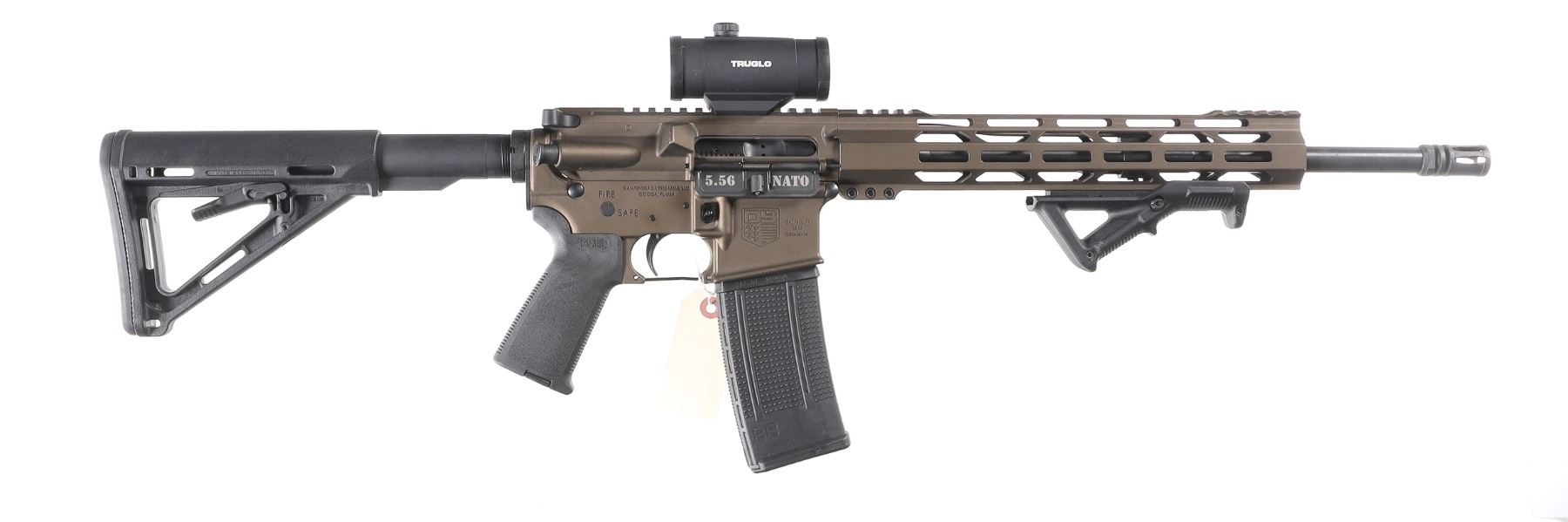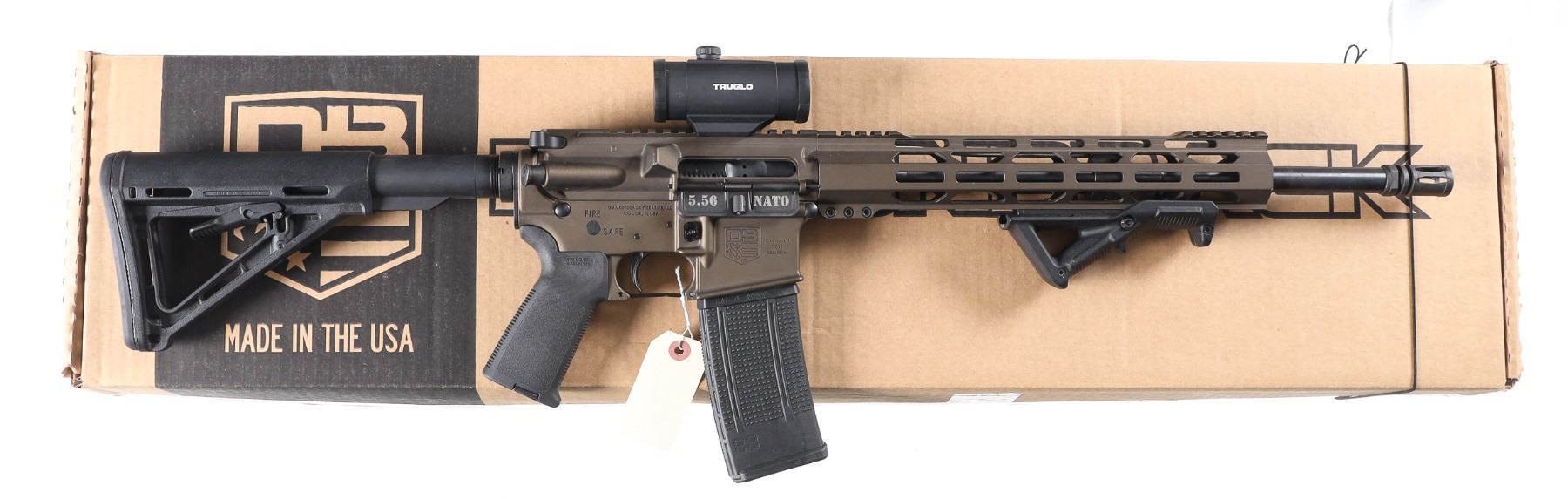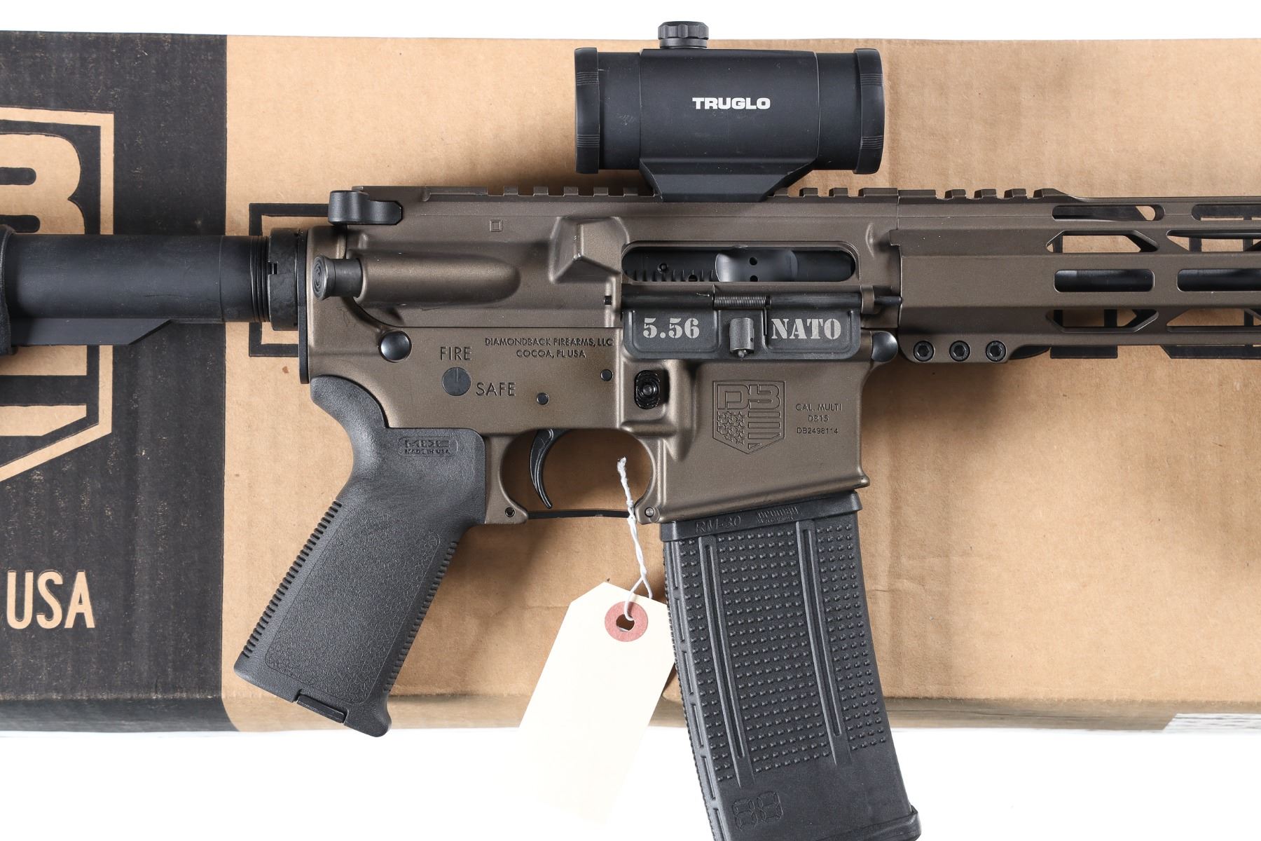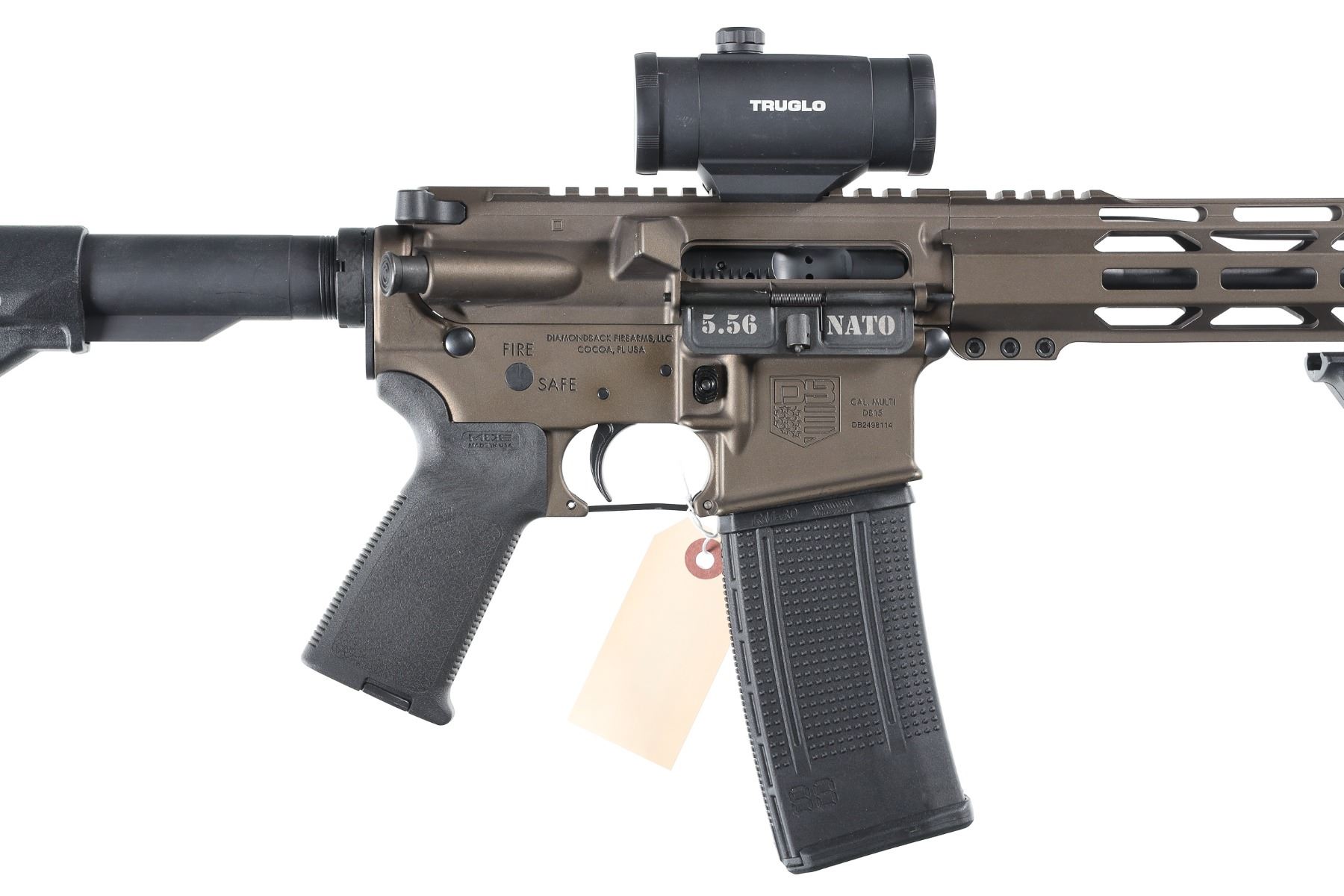 5.56 Nato Serial # DB2498114 Diamondback Arms DB-15 with 16" A2 weight 1-8 twist Bbl and A2 flash hider. 12" M-Lock Rail. Midnight Bronze finish with Mag Pull collapsible stock and pistol grip. 30 round Pro-mag polymer magazine. TrU Glo Red-Dot optic. Comes in Numbers matching box with instructions. Condition. Excellent with little use evident. Barrel 16" Modern