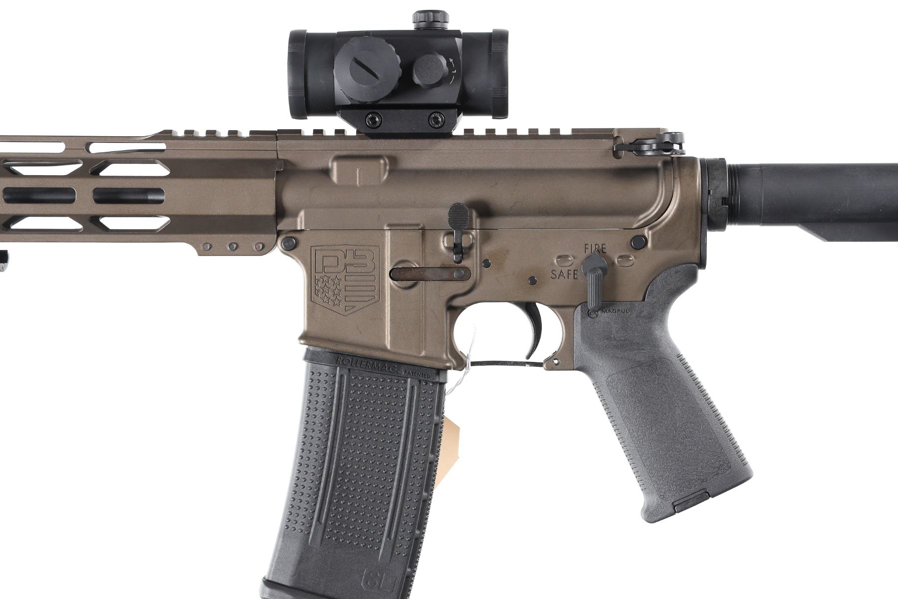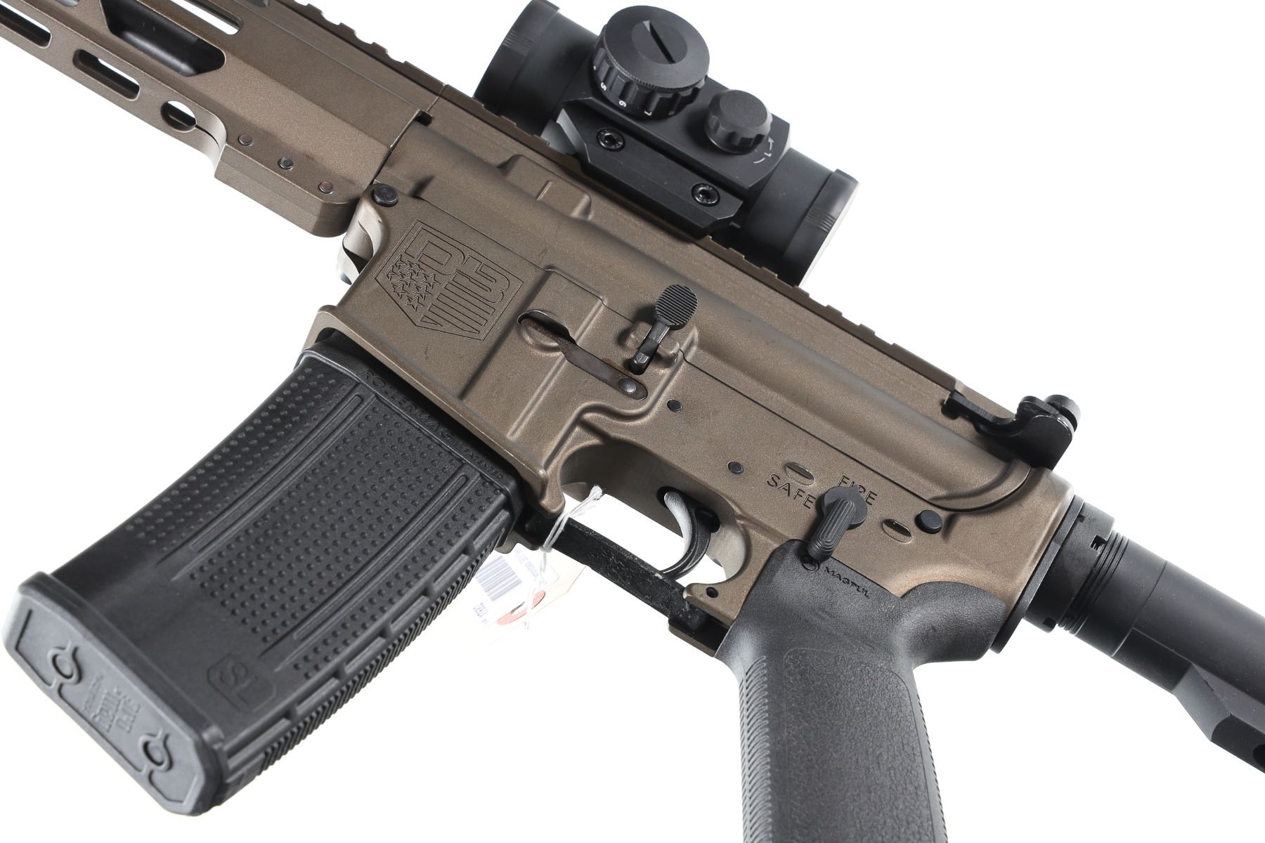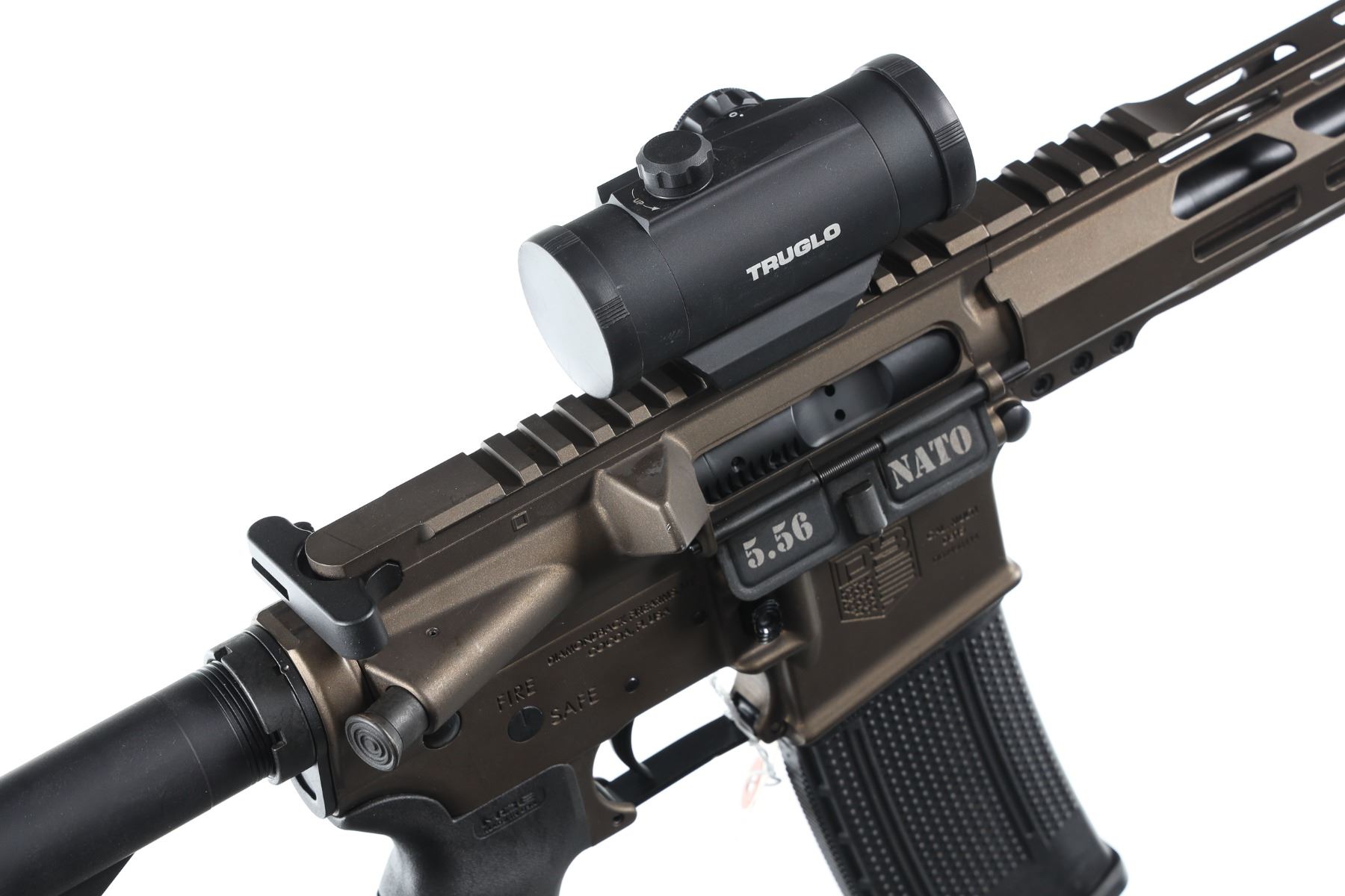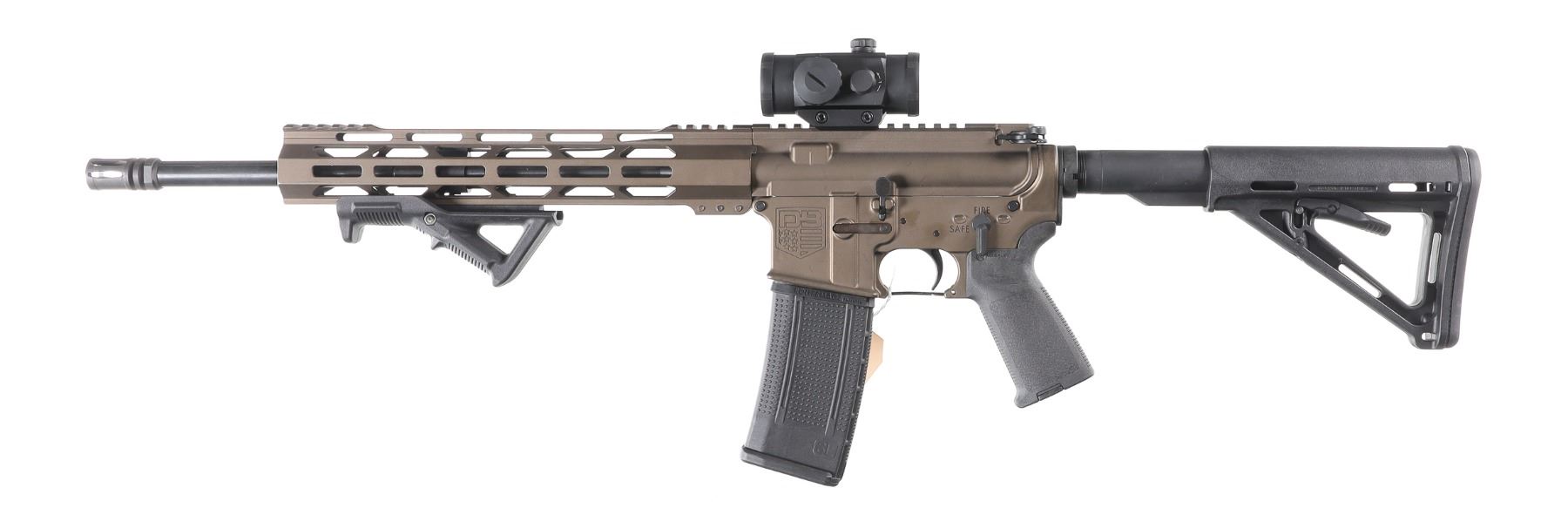 5.56 Nato Serial # DB2498114 Diamondback Arms DB-15 with 16" A2 weight 1-8 twist Bbl and A2 flash hider. 12" M-Lock Rail. Midnight Bronze finish with Mag Pull collapsible stock and pistol grip. 30 round Pro-mag polymer magazine. TrU Glo Red-Dot optic. Comes in Numbers matching box with instructions. Condition. Excellent with little use evident. Barrel 16" Modern