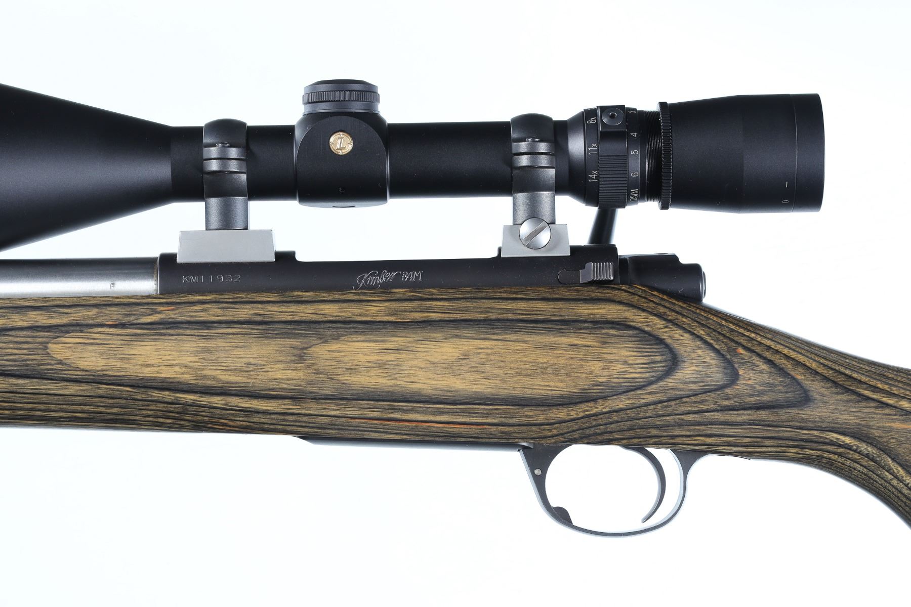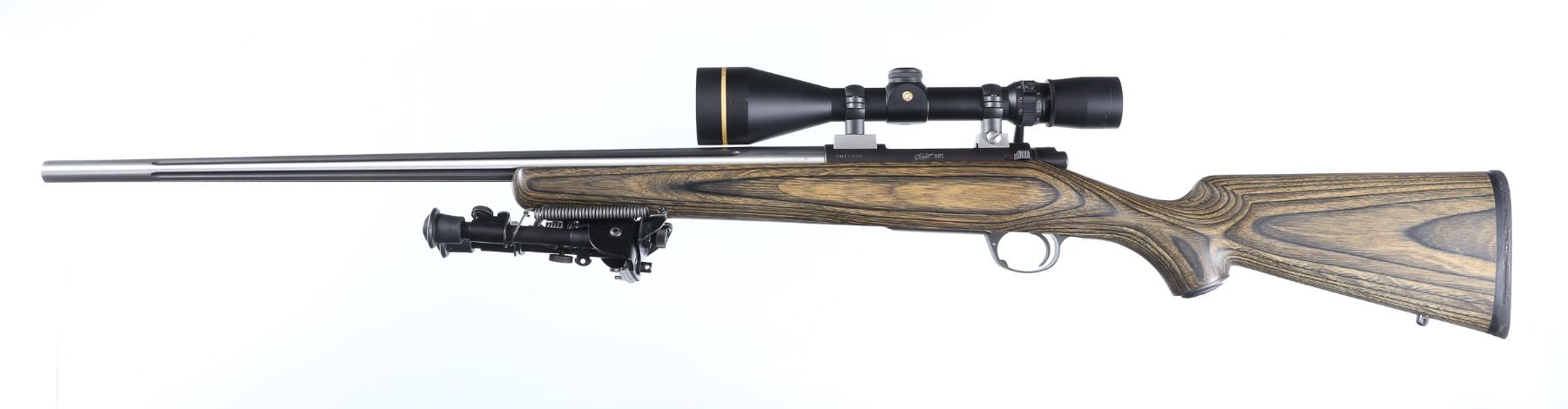 .22-250 rem Serial # KM11932 Kimber Model 84M with Fluted stainless Bbl chambered for 22-250 Rem and mounted with factory green toned laminated stock. Mfg in Yonkers. Excellent overall condition. Harris style bipod, Leupold VX-3 4.5-14x50mm scoped. Stainless steel fluted barrel. Barrel 24" Modern