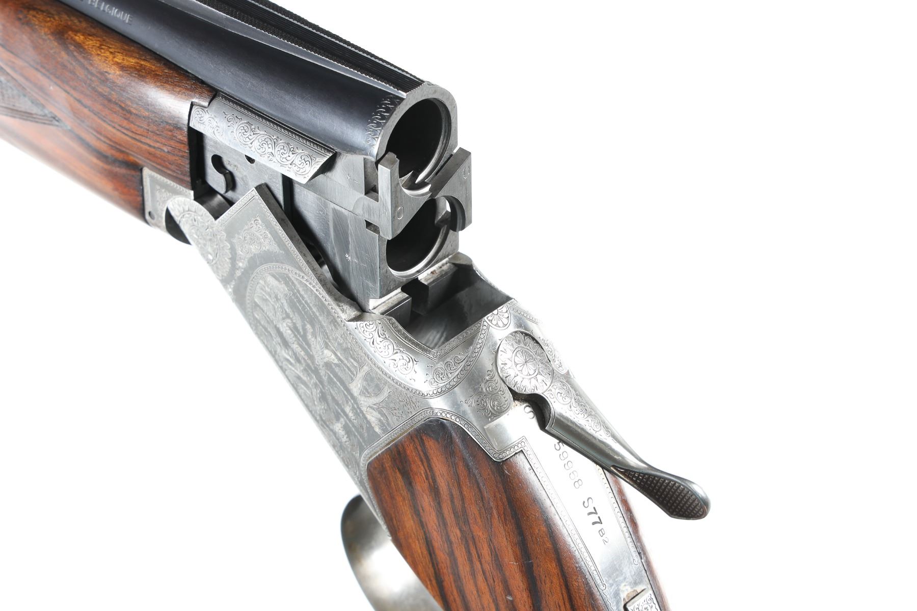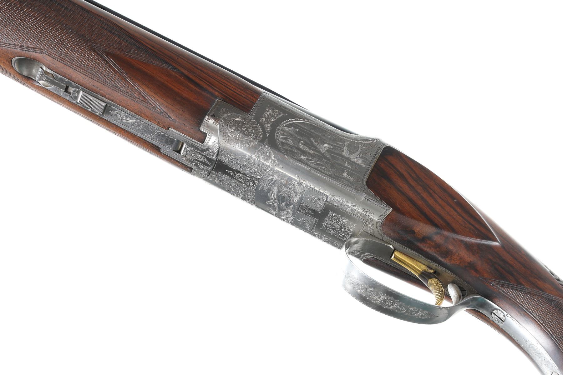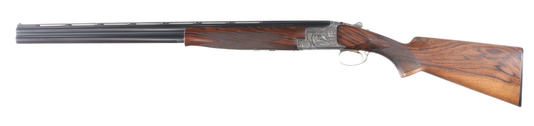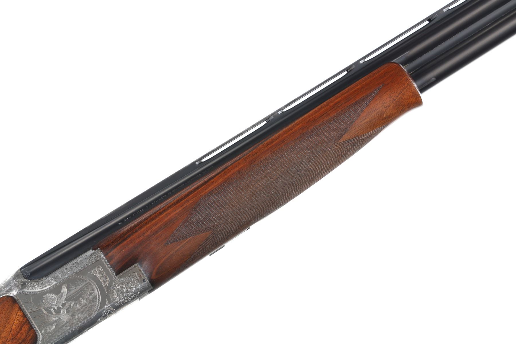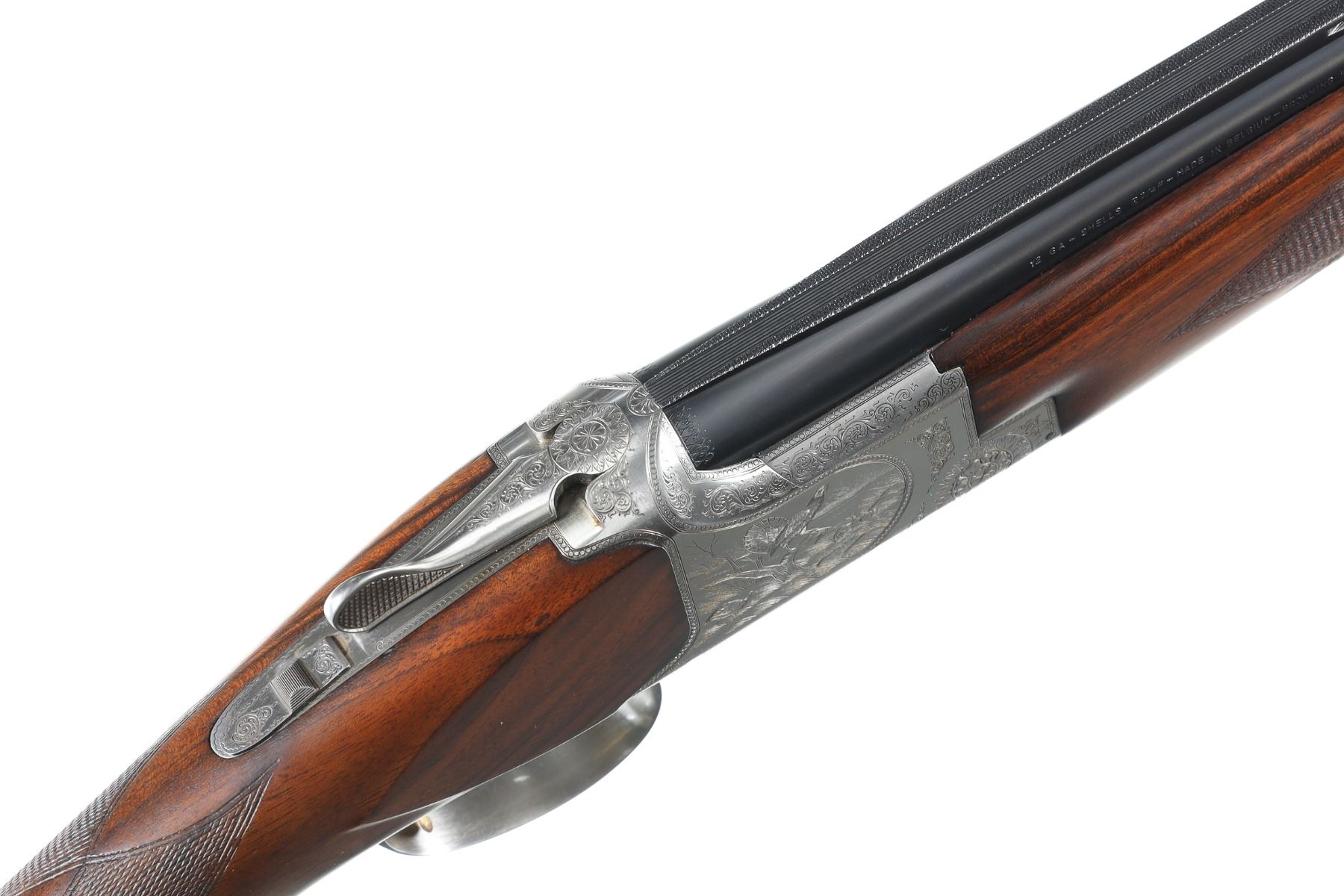 12ga Serial # 59968S77 Browning game scene engraved B2 with vignettes of pheasants, grouse and quail, double engraver signed by J.M. Boulanger. Oil finished, checkered, pistol grip walnut stocks with schabel forend and factory BROWNING buttplate. Choked imp cyl & modified. Condition: Very fine with only a trace of finish loss at muzzle Bores are bright and stocks are excellent. 14" LOP. Mechanically excellent. Mfg in 1977.