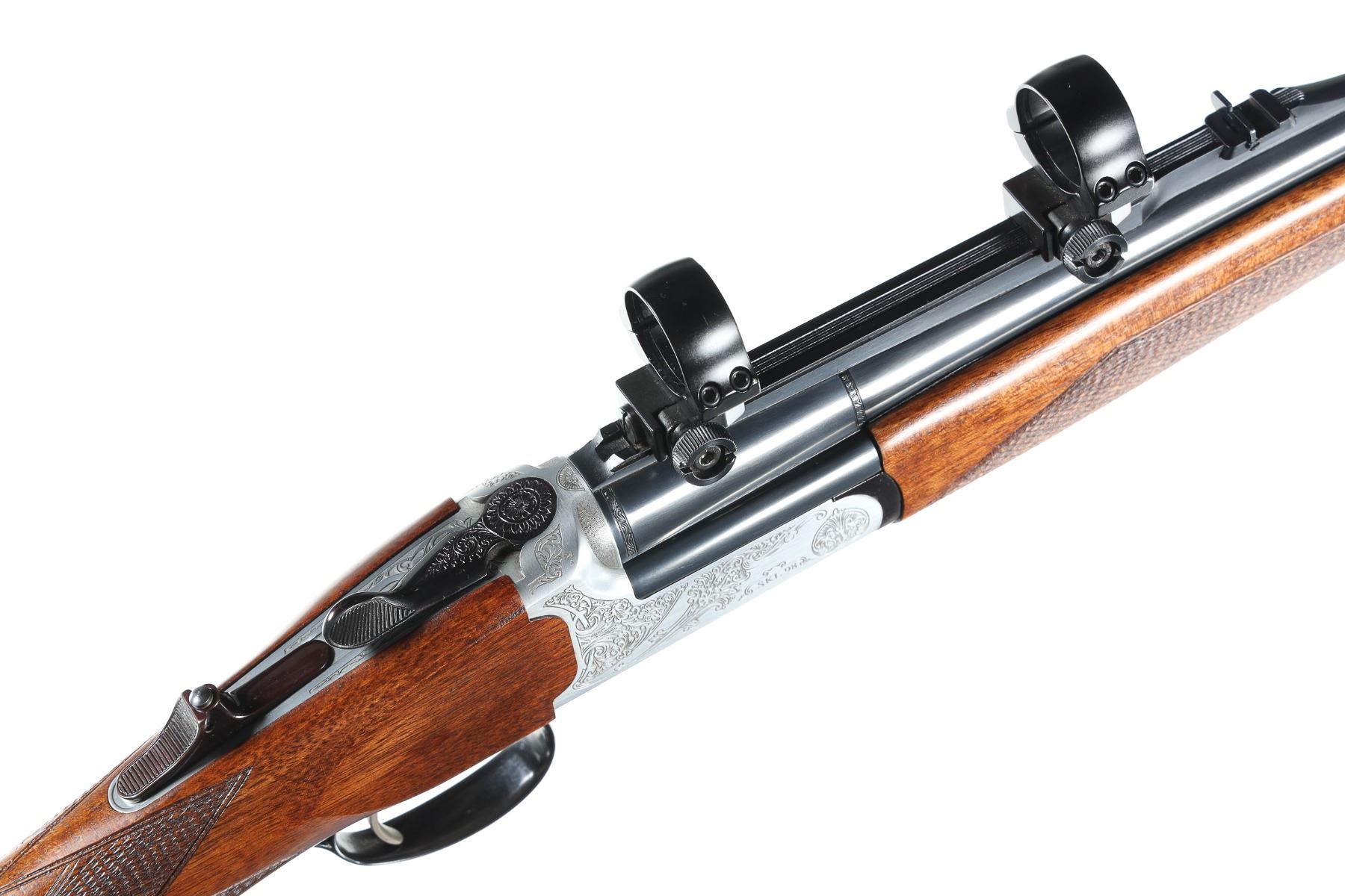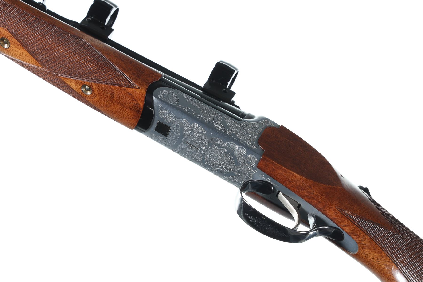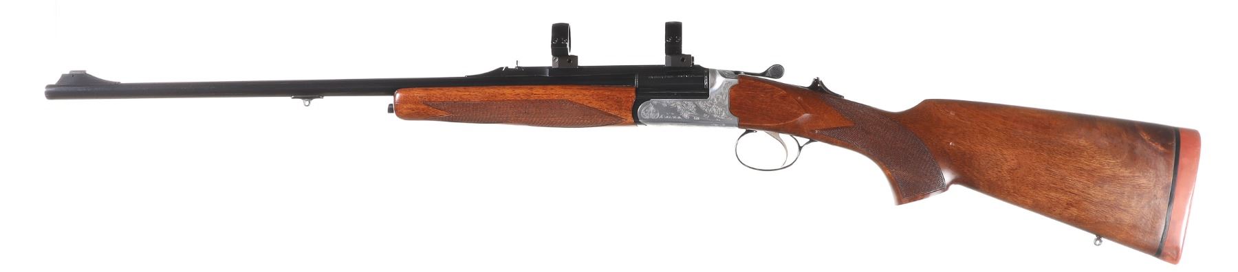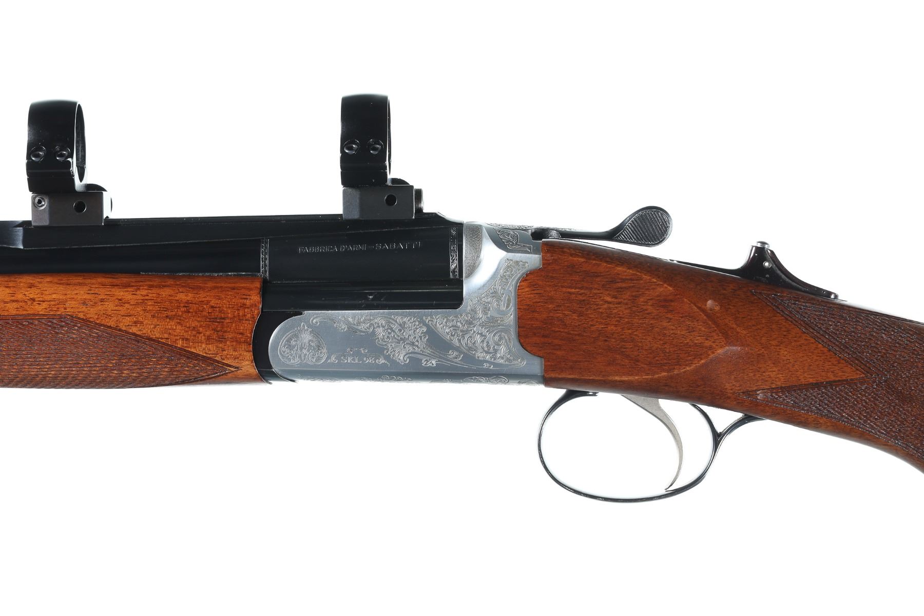 .270 Win Serial # 118724 Sabatti SKL 98 Deluxe single shot rifle chamber 270 Winchester with tapered 23 1/2" Bbl with ramped blade front sight and folding single leaf express sight. Quarter rib with 1" quick detachable rings. French grey finished single shot receiver with scroll and Foliate engraving. Very attractive straight grain oil finished walnut stocks with checkered pistol grip and recoil pad. Condition. Excellent with brilliant bore. Crisp operating action and solid lock-up. Metal retail 99% of finishes. Stock has a couple light impressions from storage. Mechanically excellent. 14 LOP 6 pnd 10 oz. Barrel 23 1/2" 1999 Modern