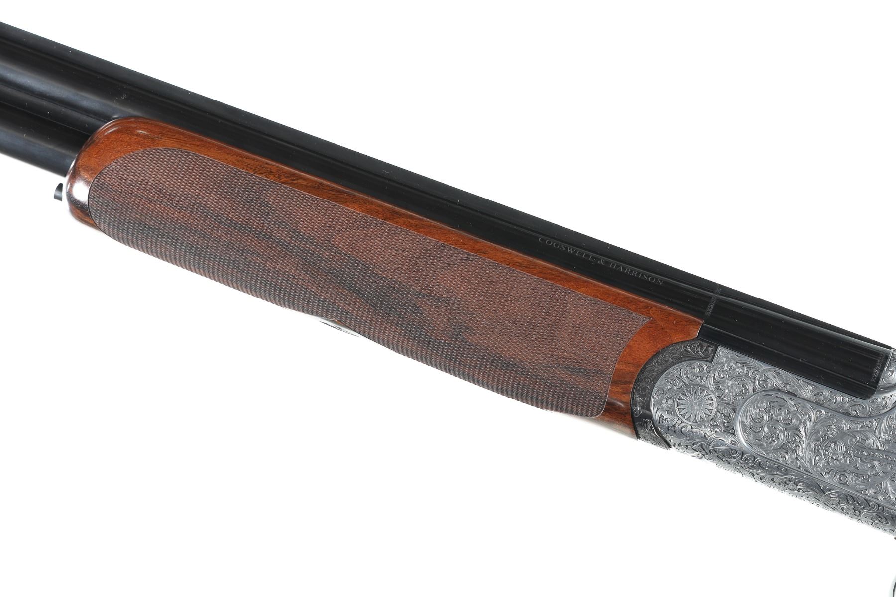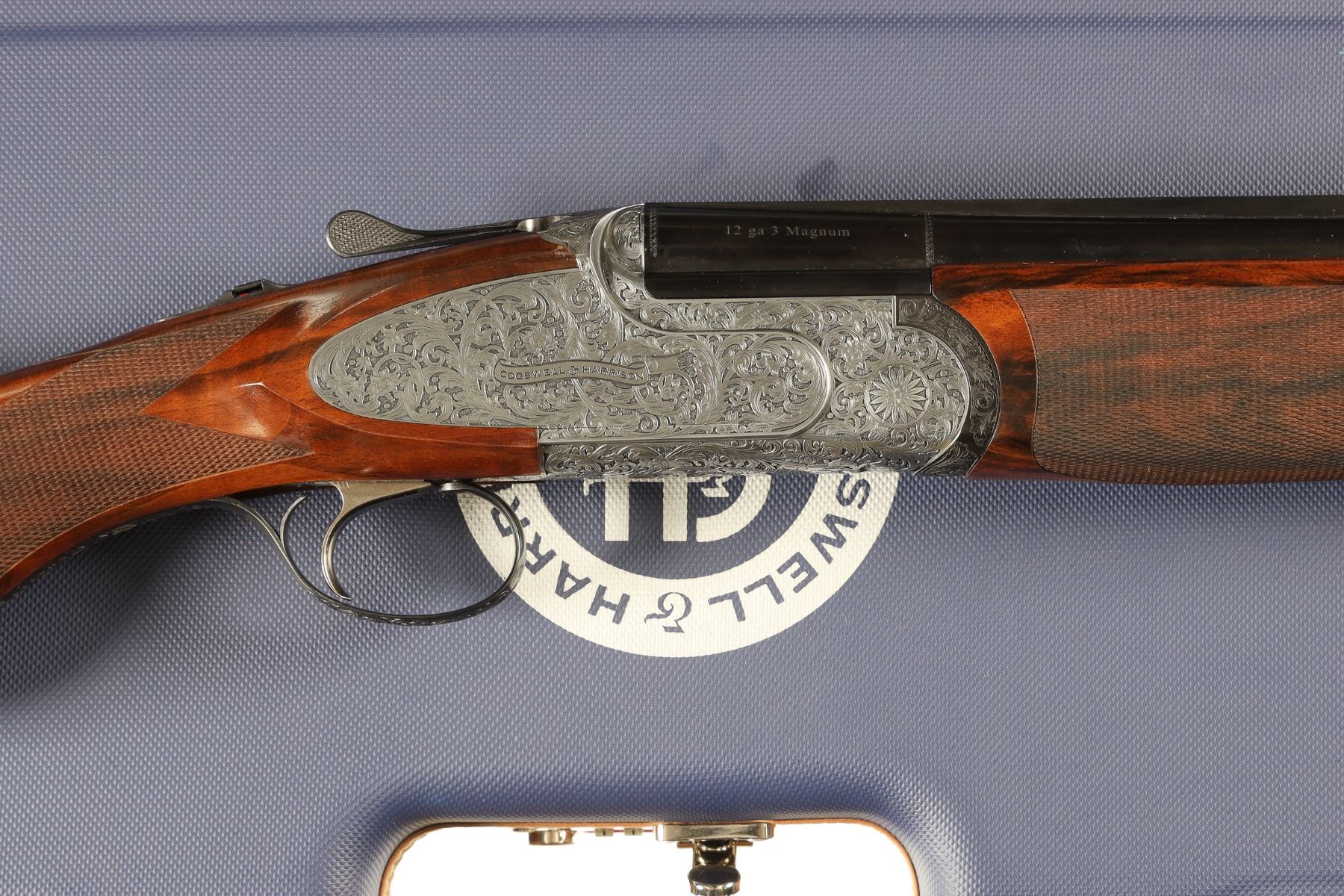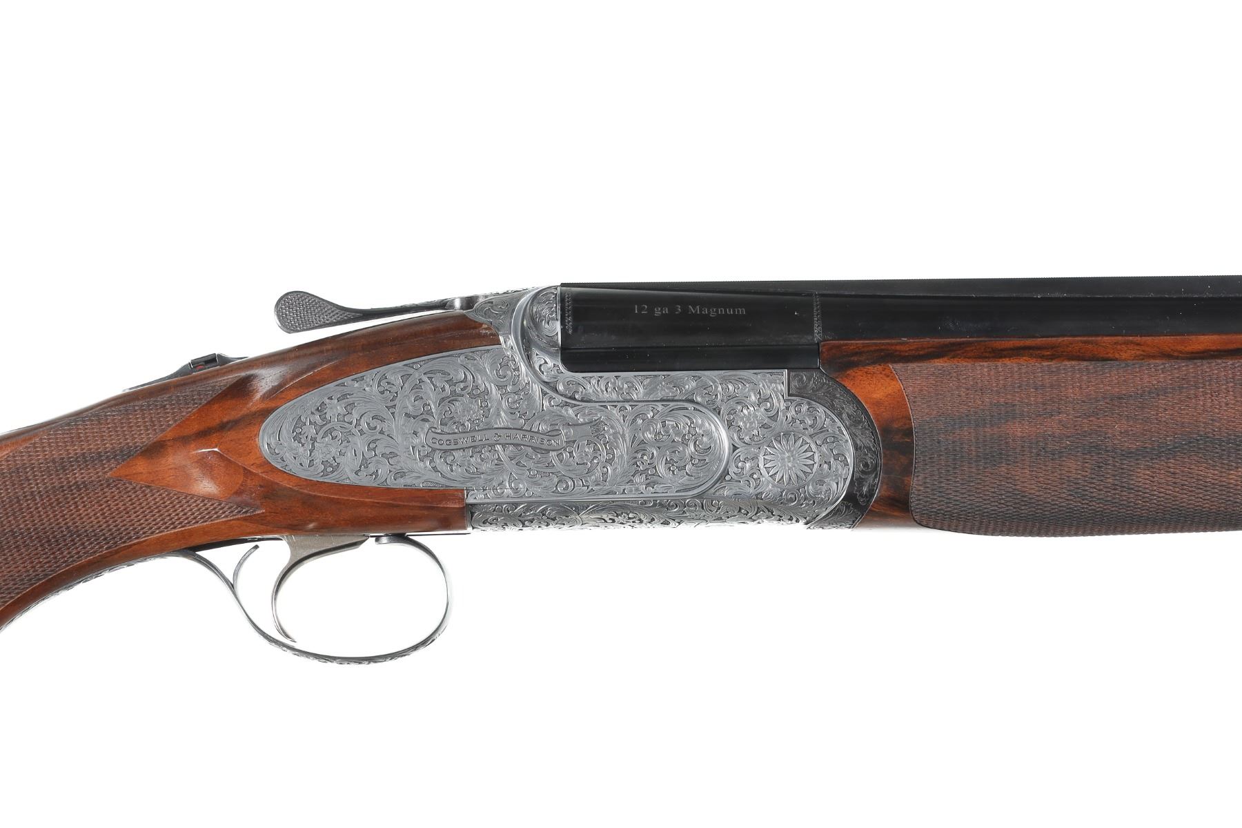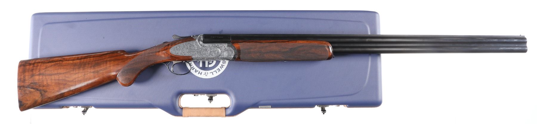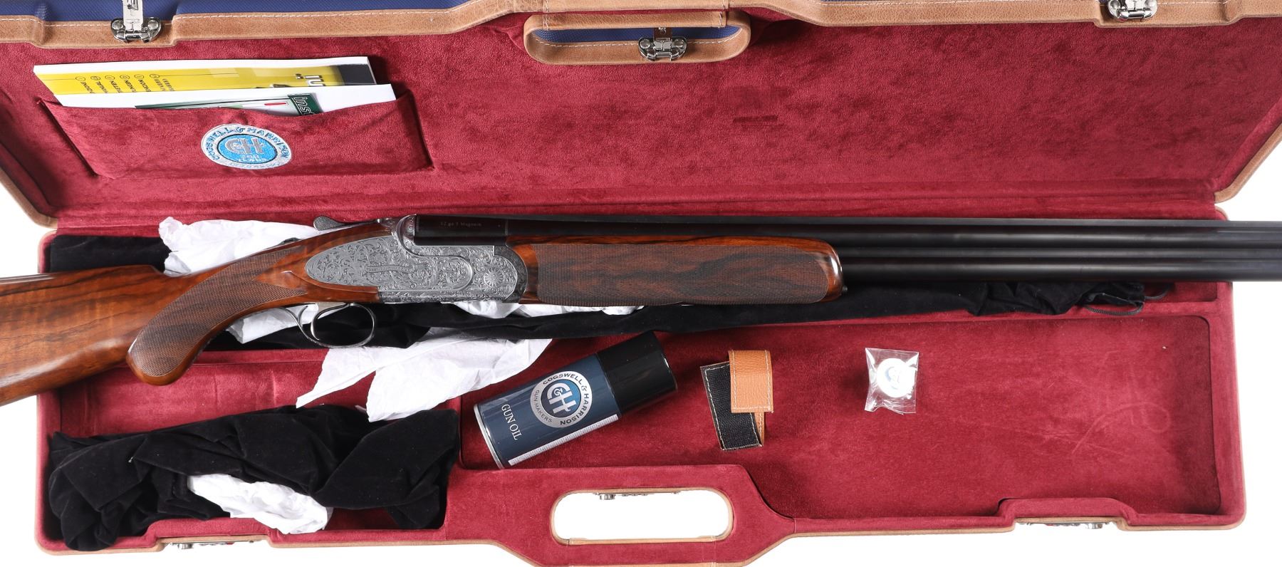12ga Serial # CH81181 Cogswell & Harrison Optimum 12 bore over under game gun with exhibition oil finished, checkered pistol grip stock. Single selective trigger and ejectors. Full coverage relief engraved french grey receiver. 31-3/4" vent rib bbls choked Full / Imp-Modified with 3" chambers. Gun is housed in a factory luggage case with travel sleeves. Condition is as new and appears to be as new with a trace of handling. LOP 14 3/4", DAC1-1/2" DAH 2 3/8", chamber 3". Barrel 31 3/4" Modern
