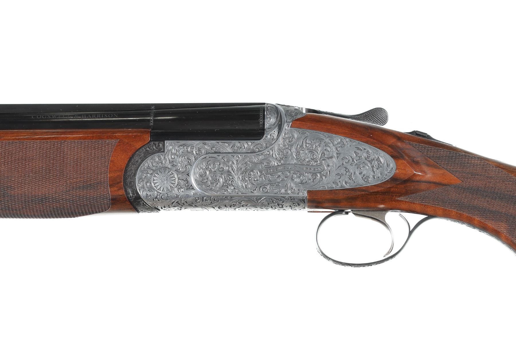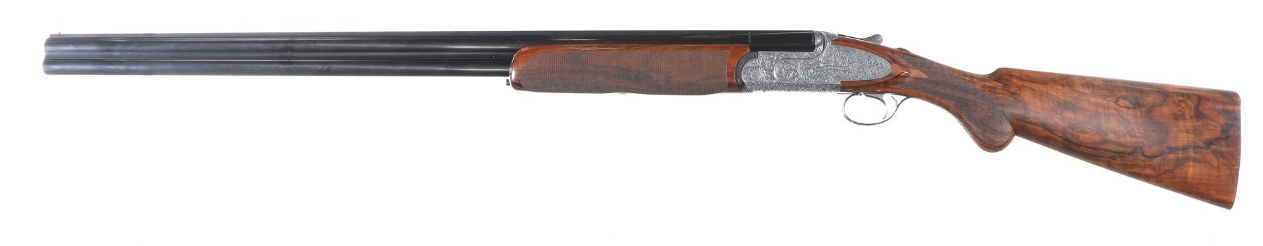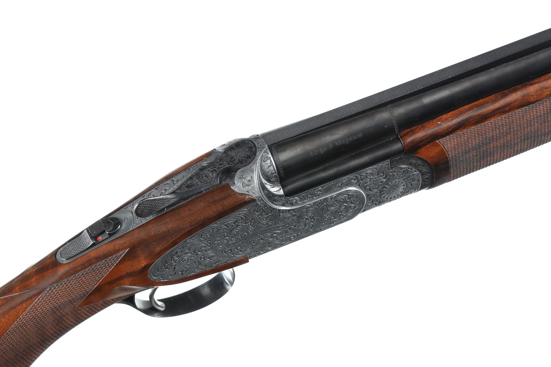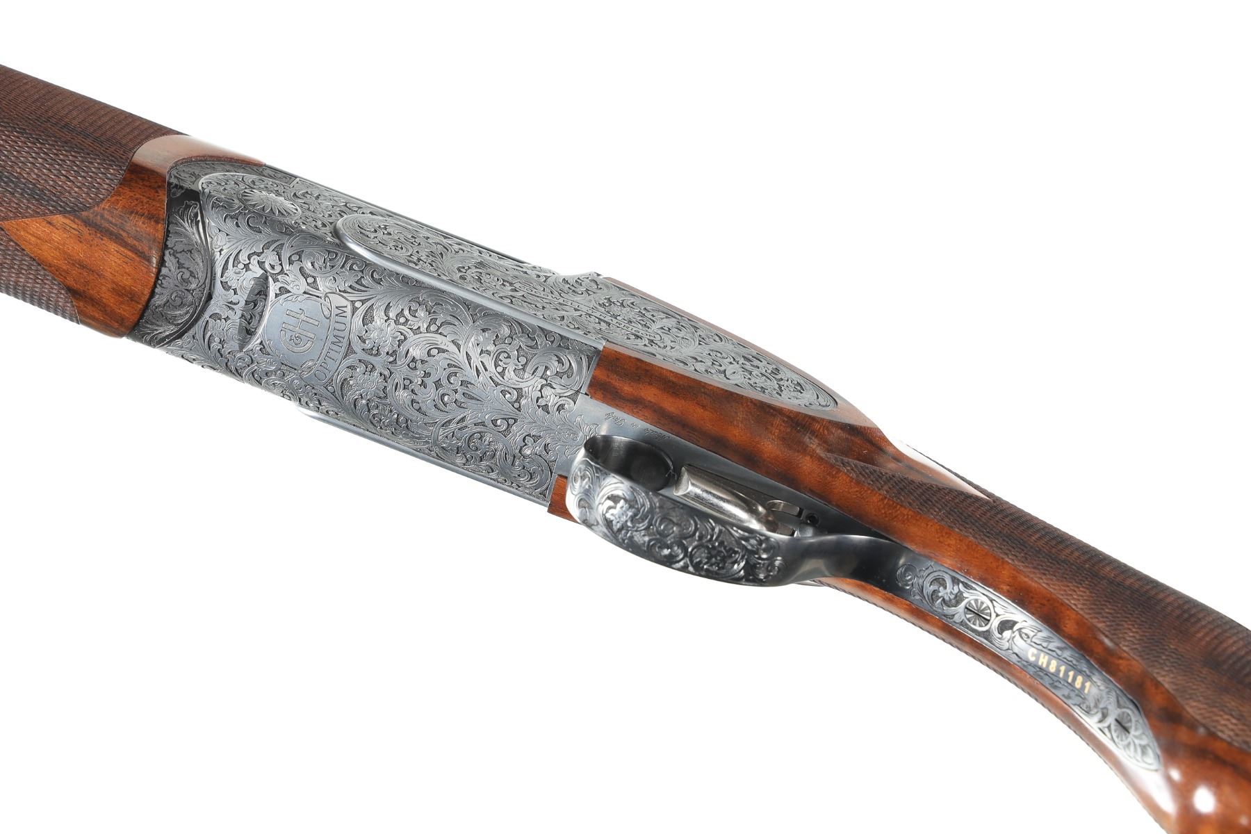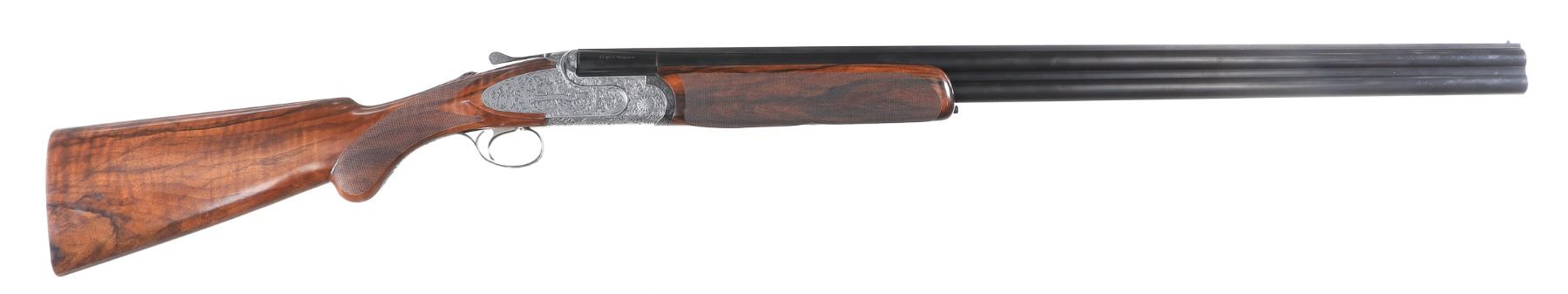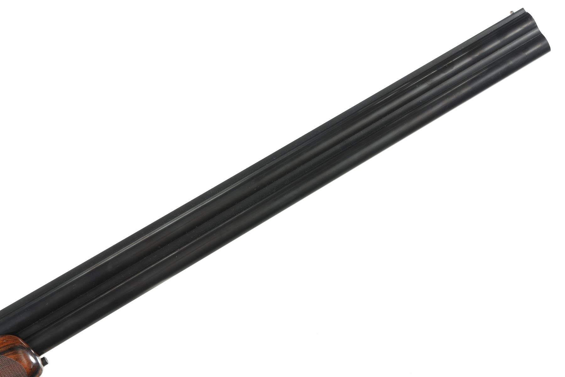 12ga Serial # CH81181 Cogswell & Harrison Optimum 12 bore over under game gun with exhibition oil finished, checkered pistol grip stock. Single selective trigger and ejectors. Full coverage relief engraved french grey receiver. 31-3/4" vent rib bbls choked Full / Imp-Modified with 3" chambers. Gun is housed in a factory luggage case with travel sleeves. Condition is as new and appears to be as new with a trace of handling. LOP 14 3/4", DAC1-1/2" DAH 2 3/8", chamber 3". Barrel 31 3/4" Modern