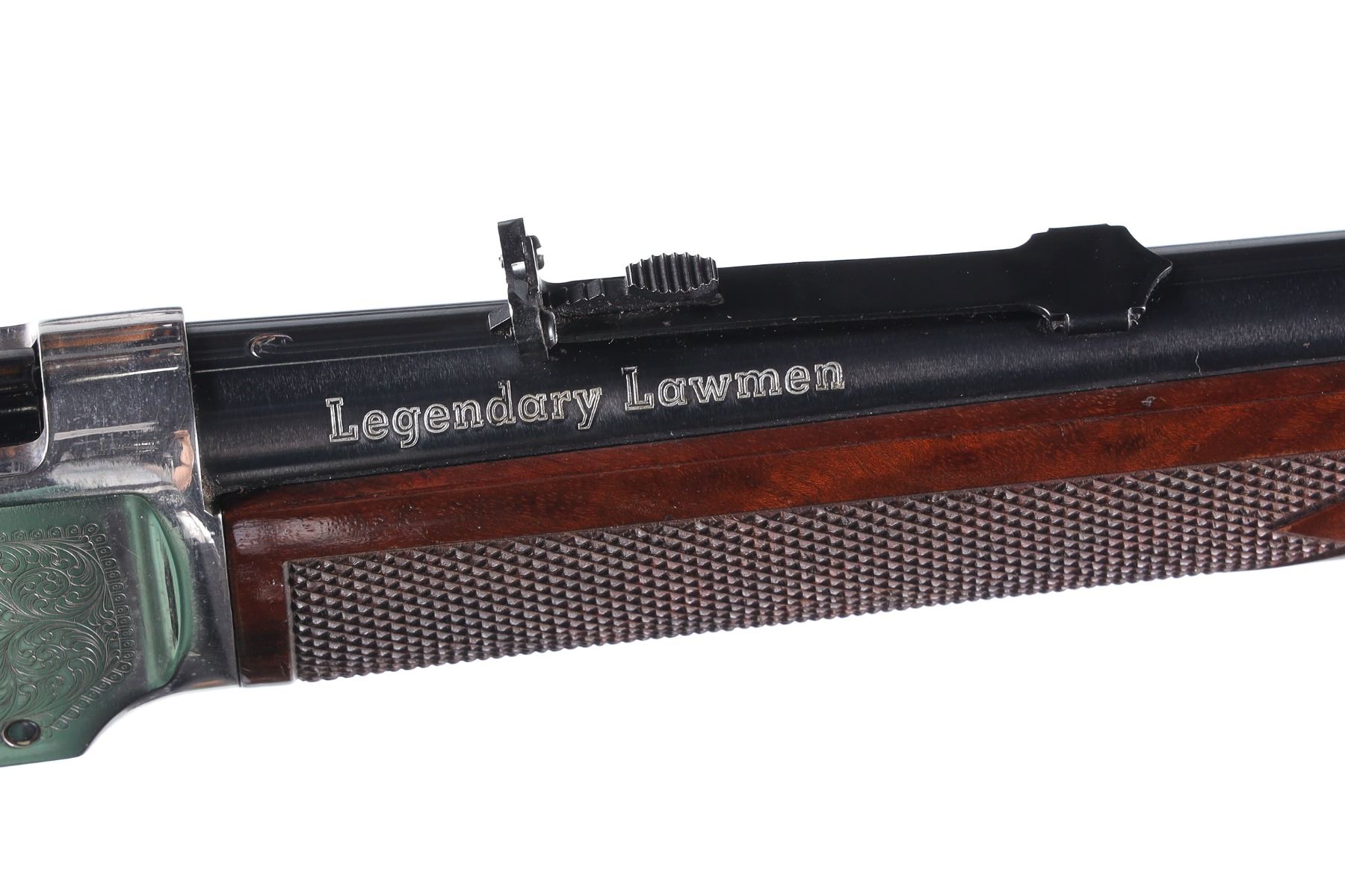 .30-30 Serial # LL16139 Winchester Legendary Lawmen Commemorative 30-30 with 16" Bbl , coin finished receiver with western horse mounted lawman scenes surrounded by scroll and foliate. Select high grade walnut stocks with Lawman medallion in stock. Condition. Very fine with some thinning varnish Mechanically excellent. Barrel 16" 1977 Modern