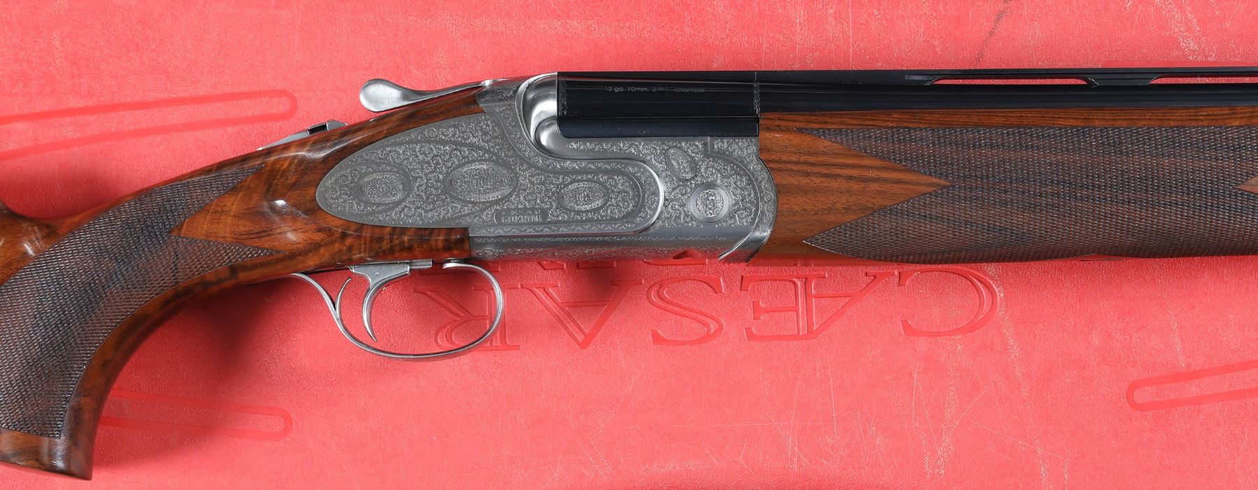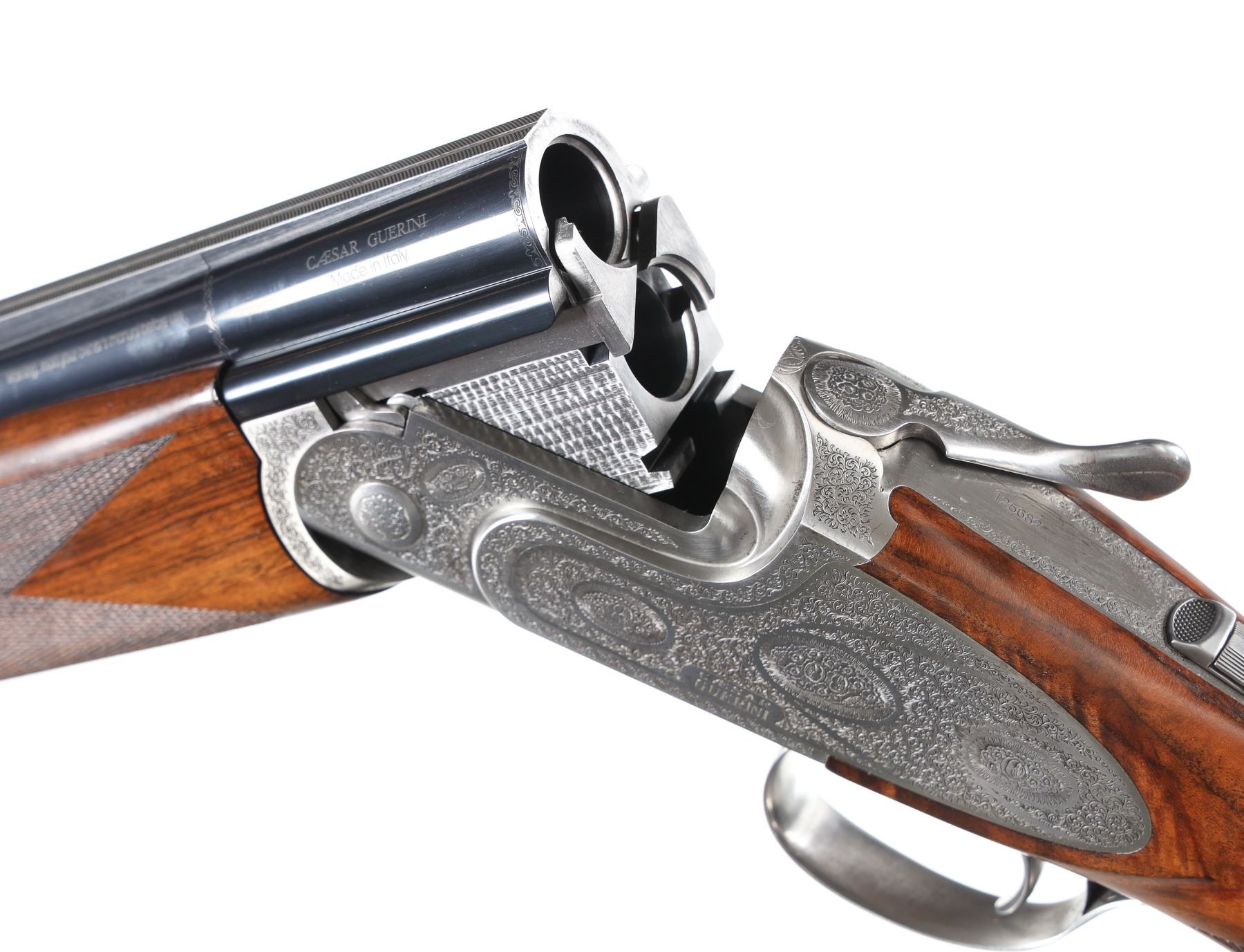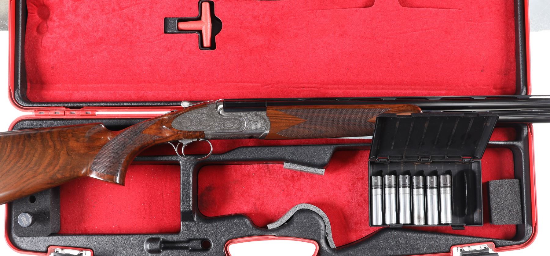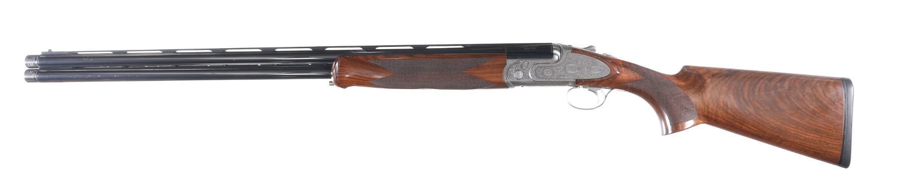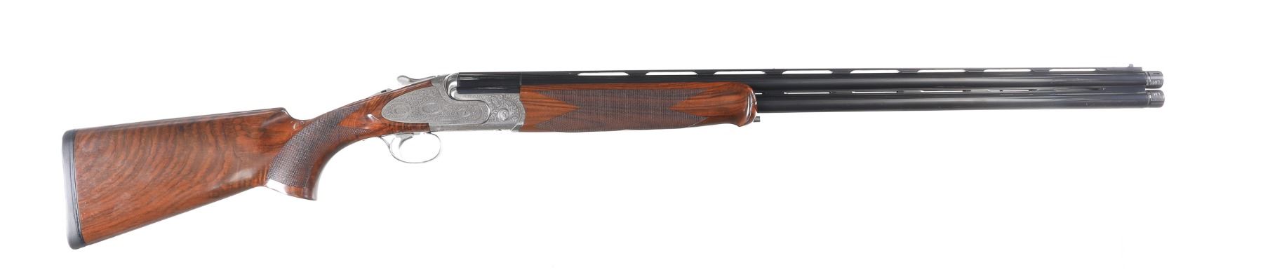 12ga Serial # 125682 Caesar Guerini Essex 12 Ga with case. 30" bbl with full set of extended chokes and carry case. Coin finished frame with rose & scroll engraving. Oil finished checkered walnut stock with single adjustable selective trigger with ejectors. Condition: Very fine with excellent metal and bright bores. Stocks are excellent. Case has some soiling. Mechanically excellent. Barrel 30" Modern