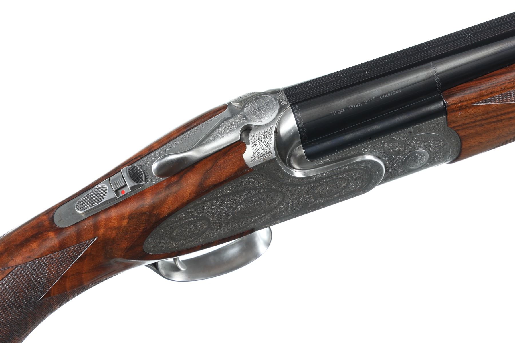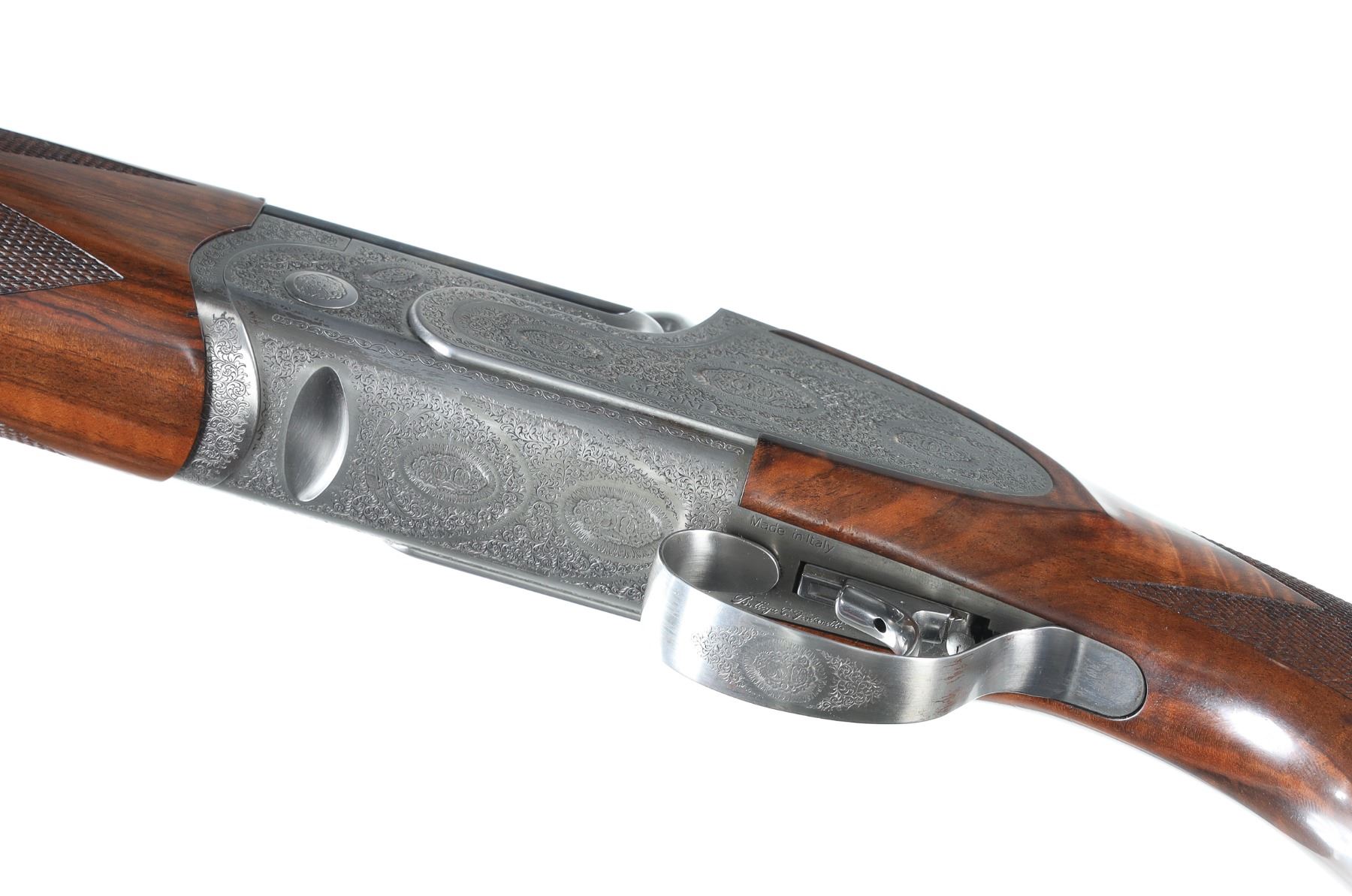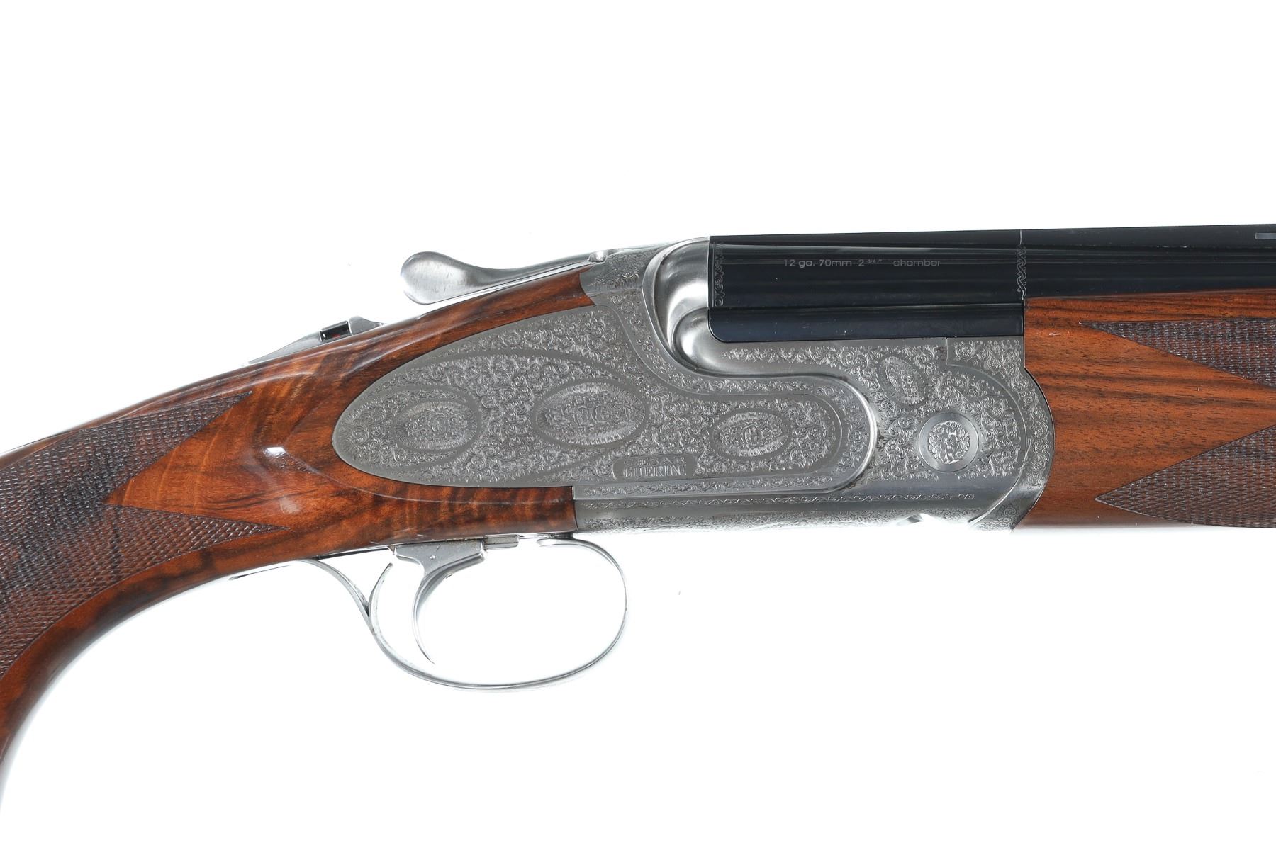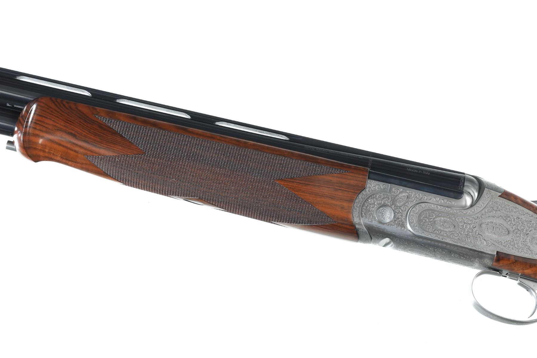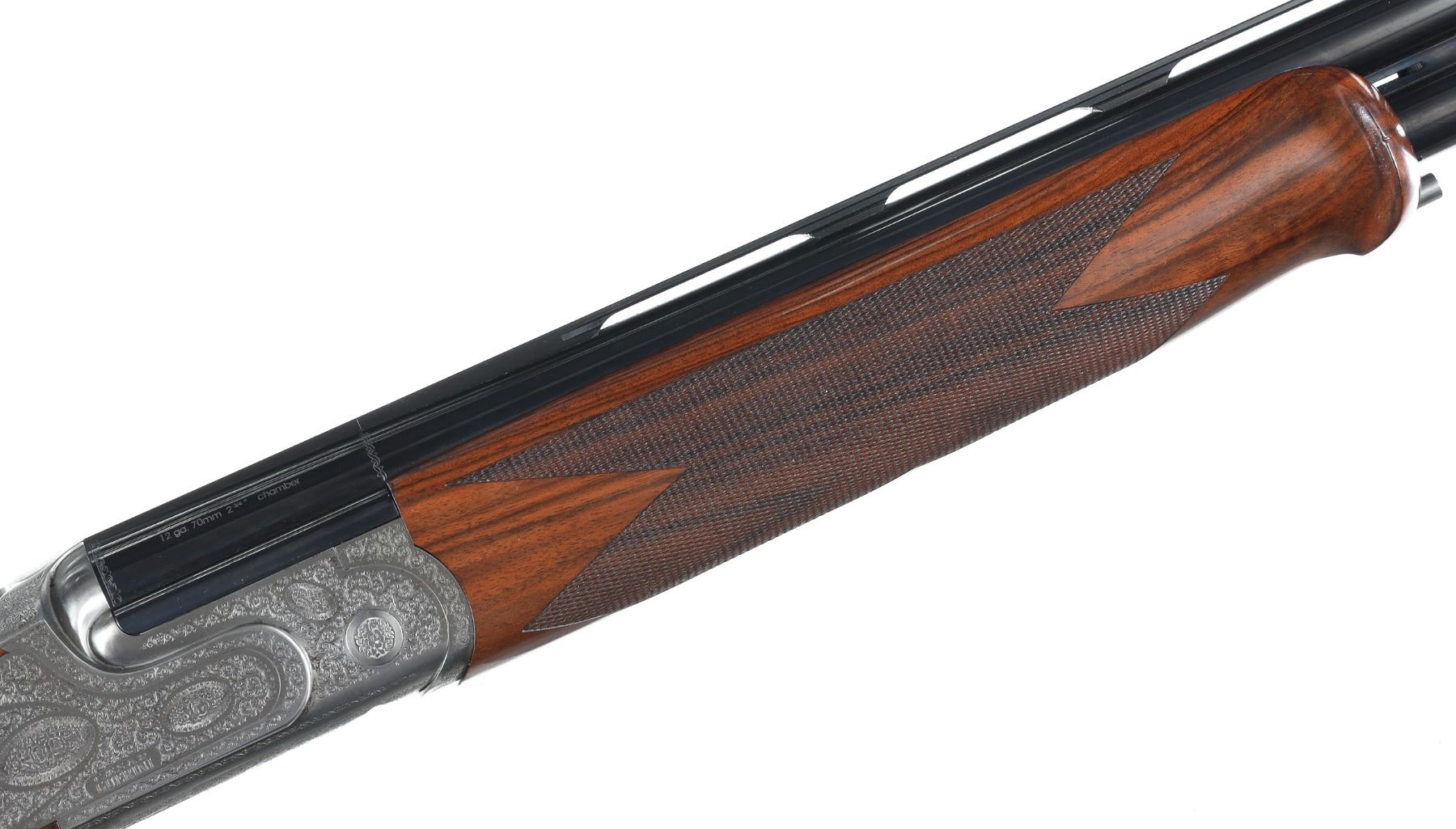 12ga Serial # 125682 Caesar Guerini Essex 12 Ga with case. 30" bbl with full set of extended chokes and carry case. Coin finished frame with rose & scroll engraving. Oil finished checkered walnut stock with single adjustable selective trigger with ejectors. Condition: Very fine with excellent metal and bright bores. Stocks are excellent. Case has some soiling. Mechanically excellent. Barrel 30" Modern