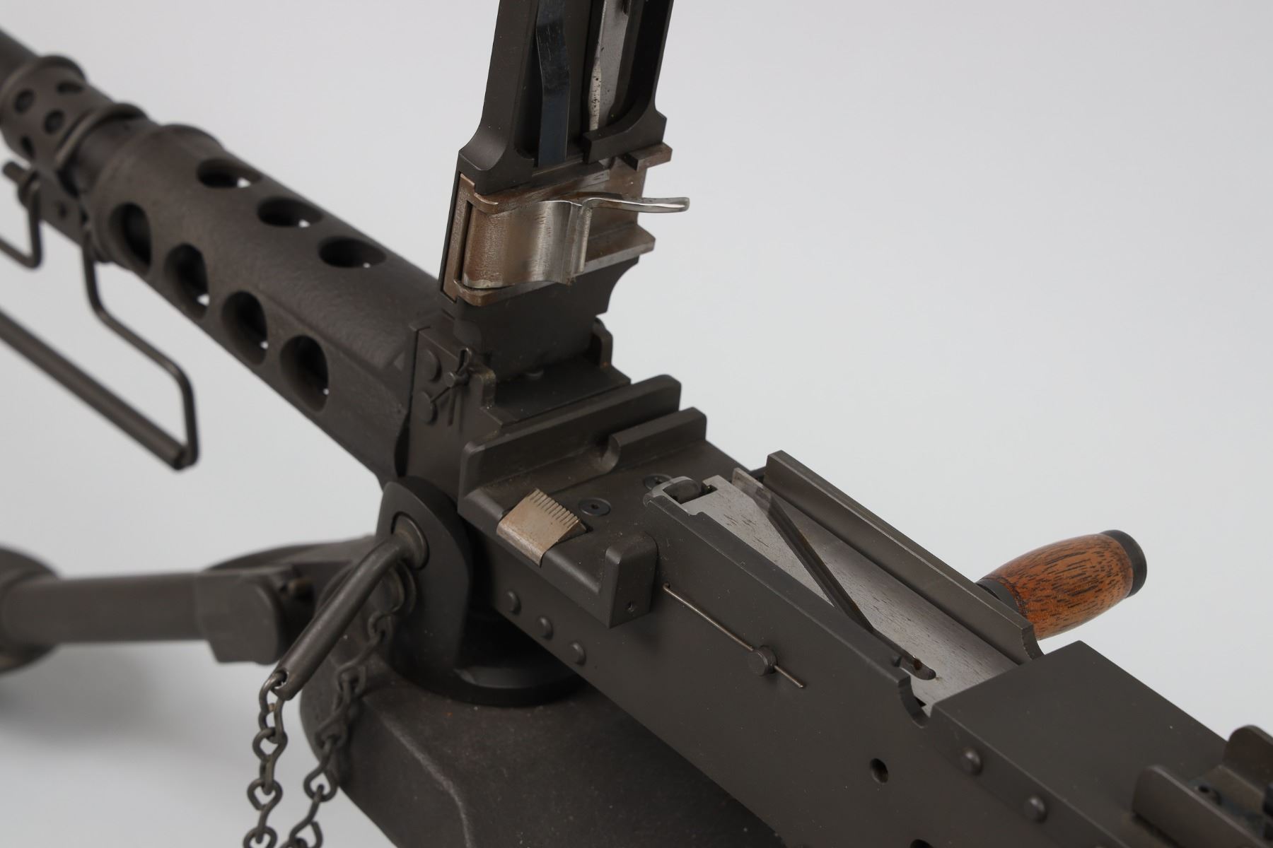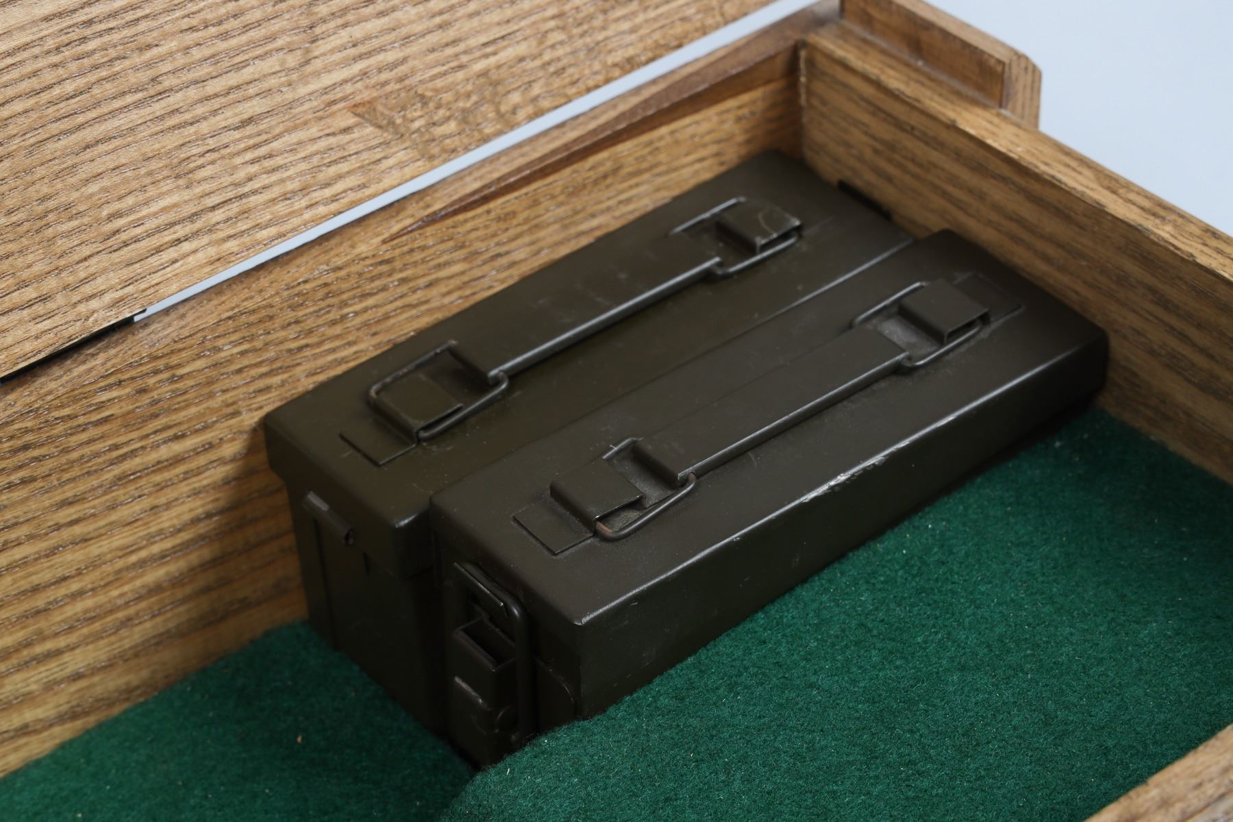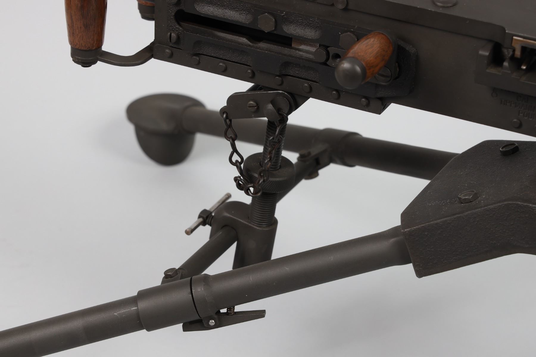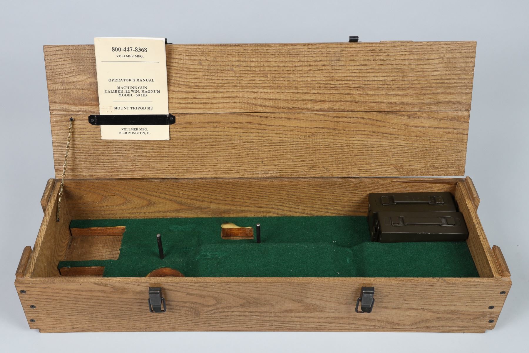 .22 mag Serial # ,0111 Tippman Arms 22 Maf M2HB semi-automatic miniature. Made to be a 1/2 scale of the famed 50 cal, Browning Machine gun. Dark parkerized finish using cotton belts loaded with 22 magnum. Marked Tippman Arms Serial number 0111 Pound WI. Comes with tripod , traverse and elevation adjustament, 2 miniature ammunition cans, cloth ammunition belts and display / shipping crate with instruction manual. Condition, Appears unfired and without use. Box is equally fine. Barrel 18 1/4" Modern