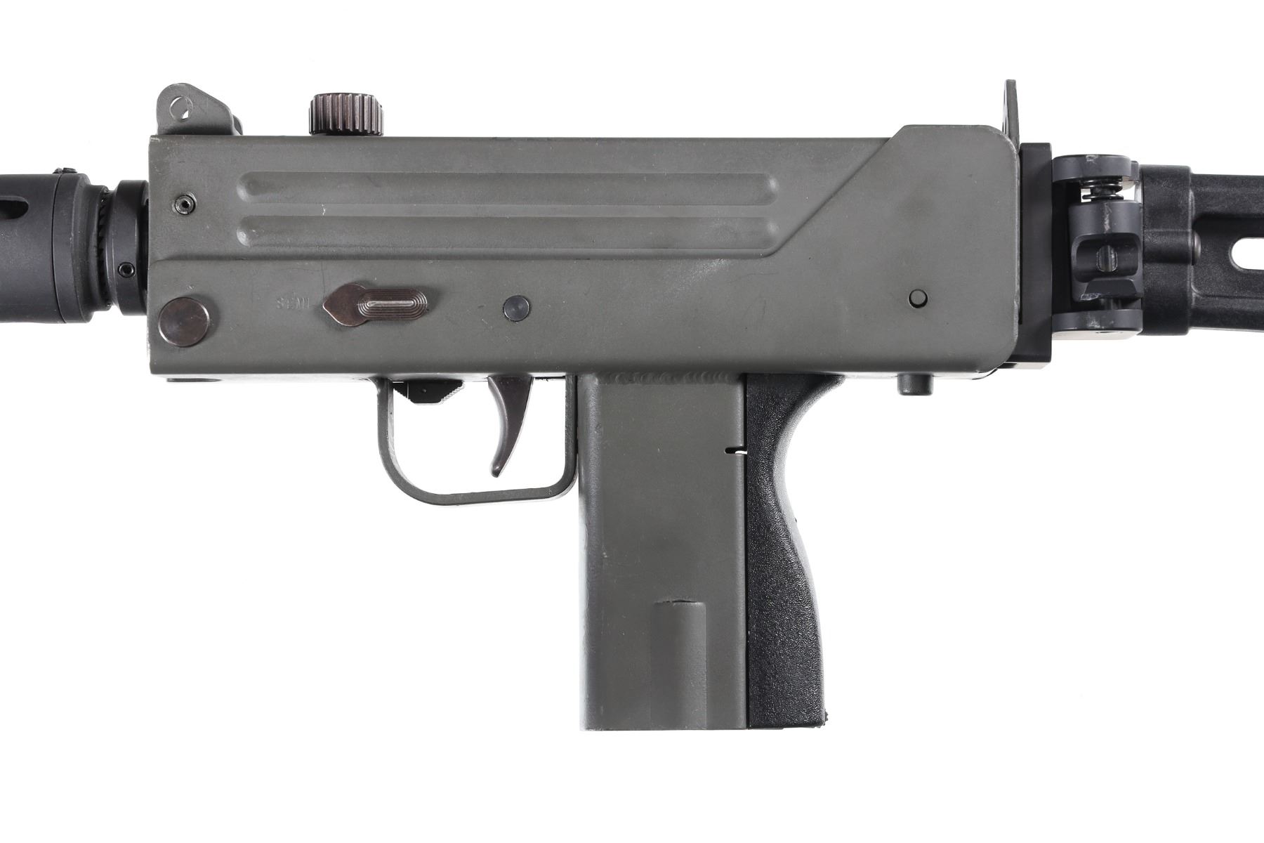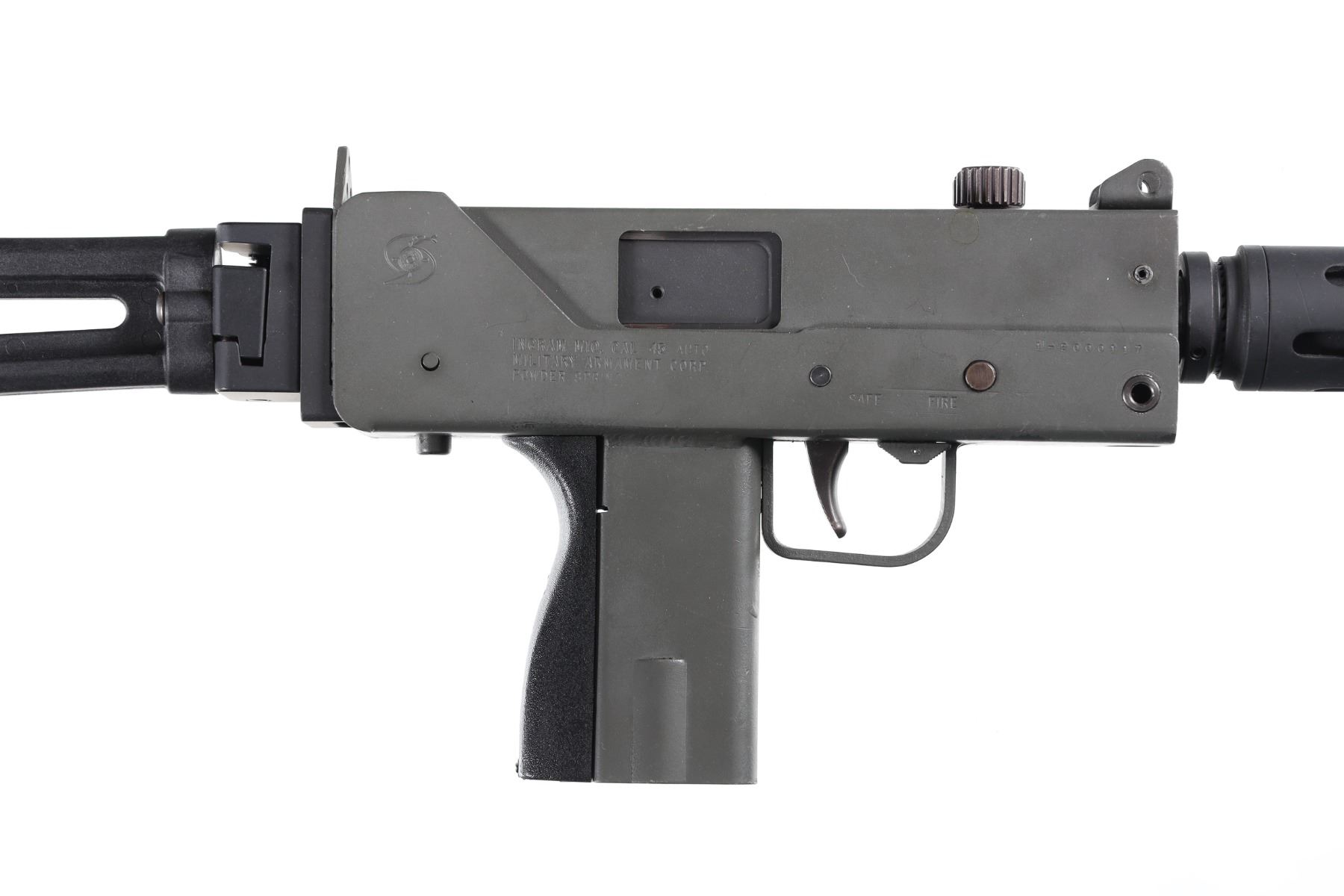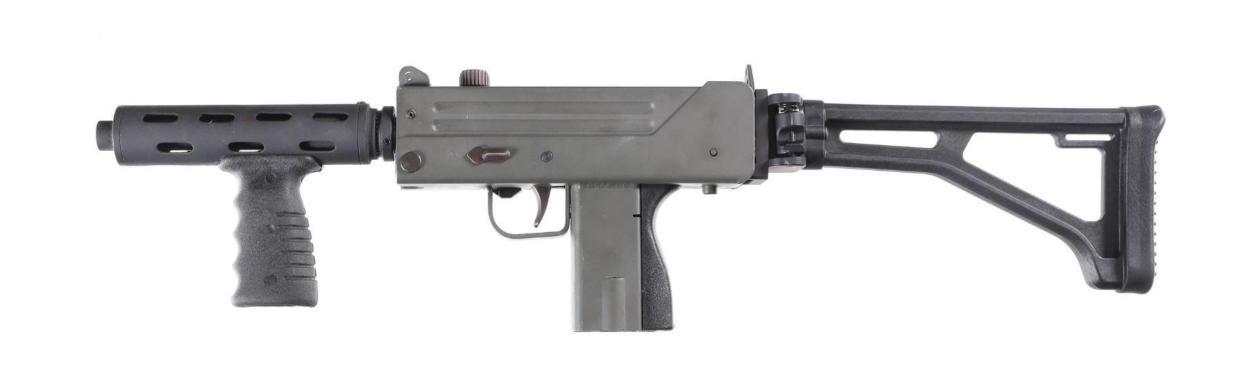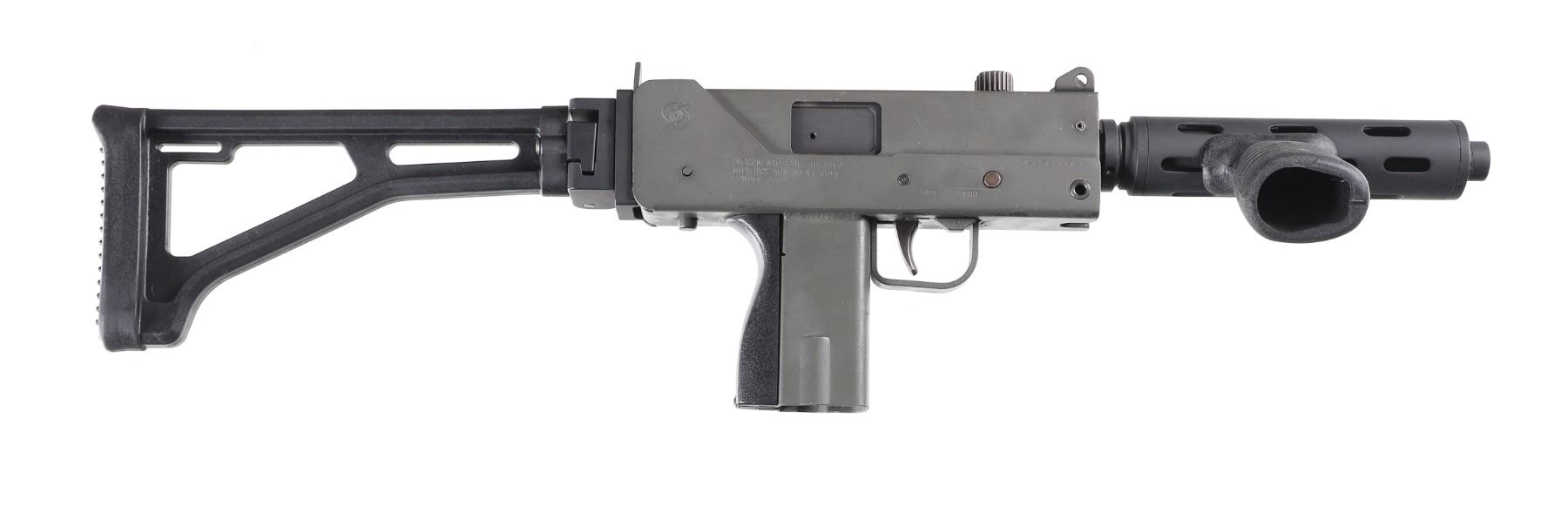 .45 ACP Serial # 1-200117 Powder Springs Ga, Mac 10 .45 Submachine gun with forgrip and Bbl extension. Parkerized finish . NFA item subject to a $200 tax stamp with fingerprints and photo cards, transfers on a Form 3 or a Form 4. Excellent overall with slight exterior finish wear from use. Fitted with Lage MFG folding stock. Excellent mechanically Barrel 5.75 Class III