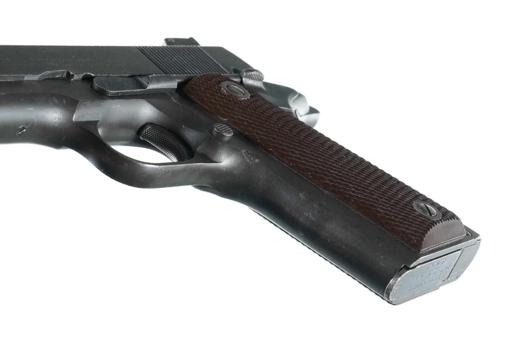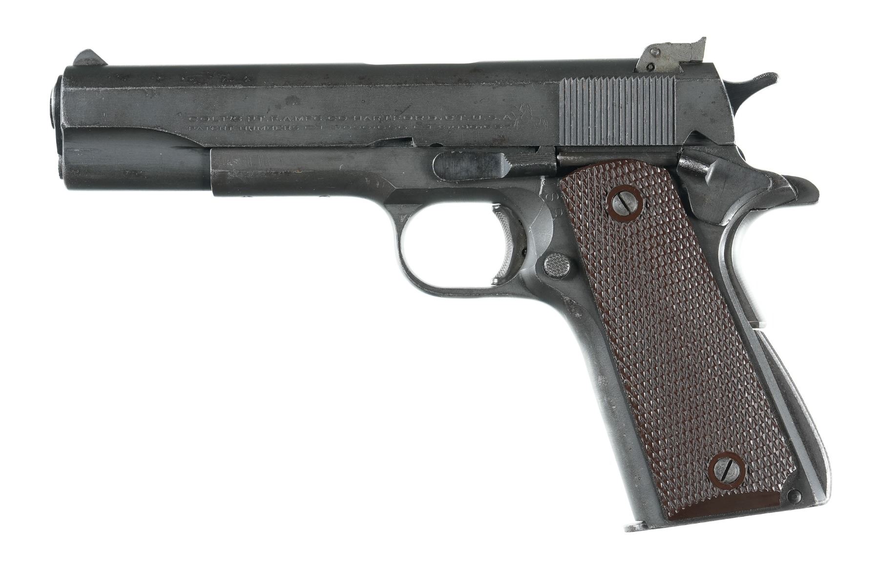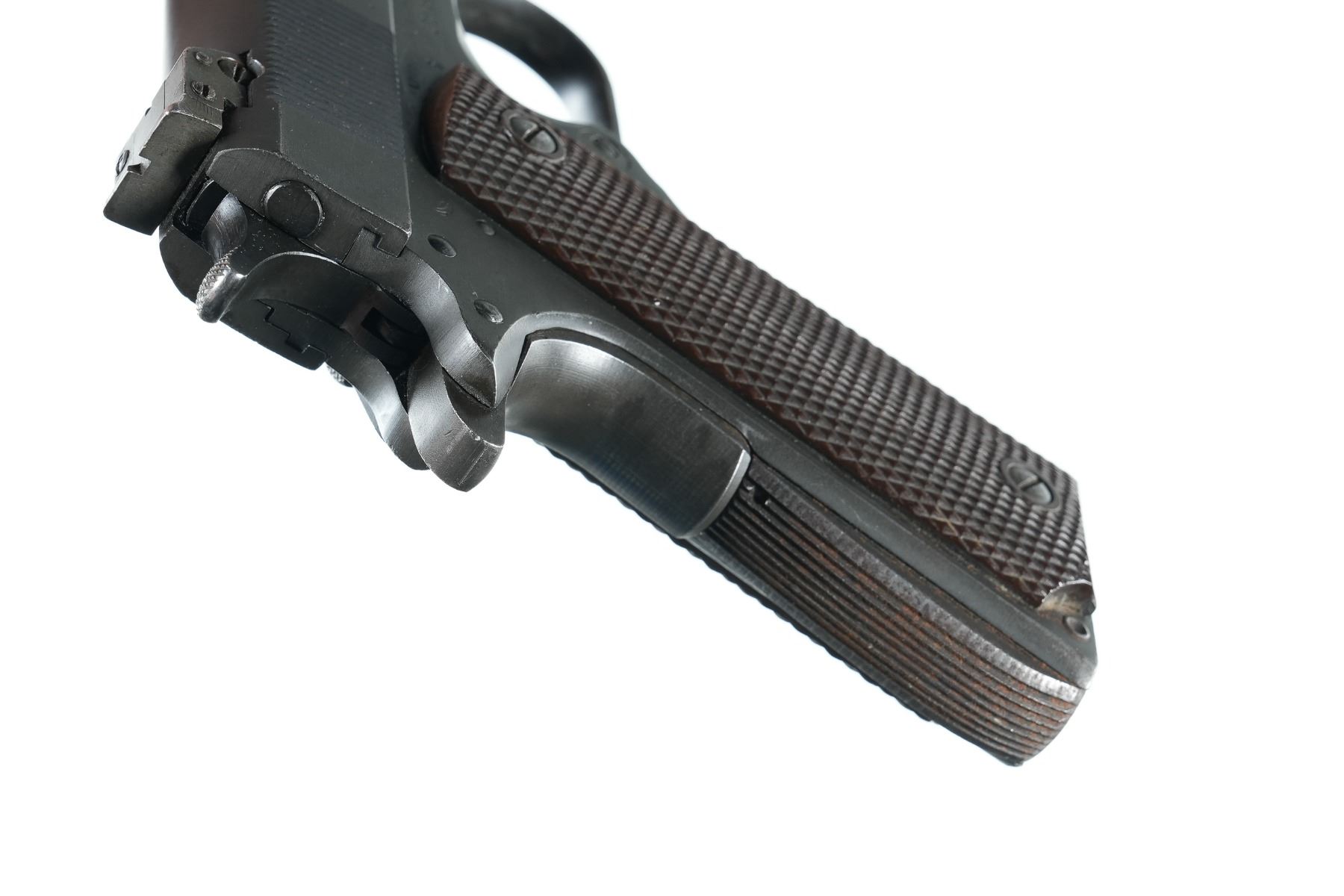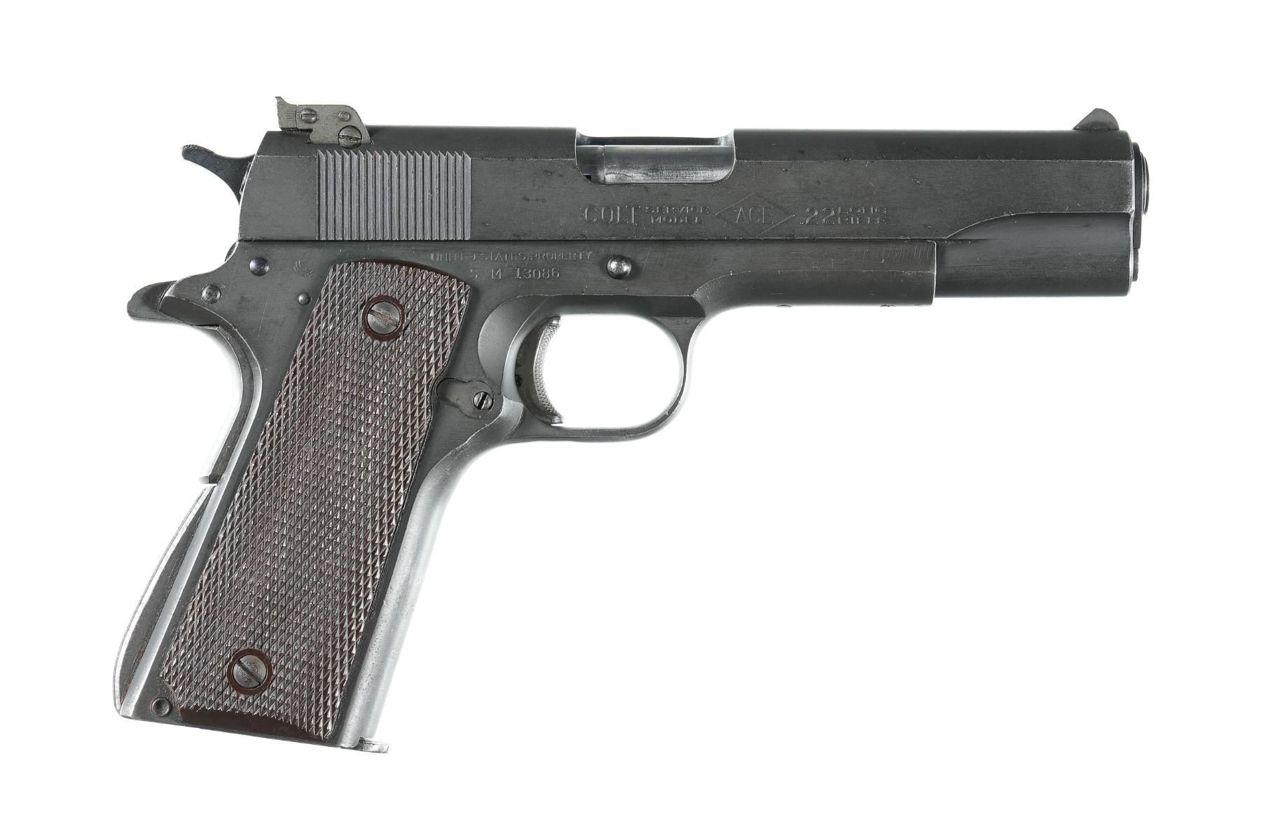 .22 lr Serial # SM13086 Manufactured in 1945. "JSB" inspector marked. The underside of the frame has been drilled and tapped. Retains most all finish with some small spots of oxidation of edges of slide. Bore is excellent. Grips are large ring Keyes pattern . Mechanically fine Barrel 5" C&R