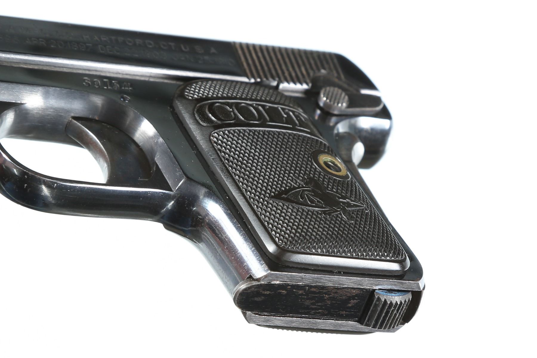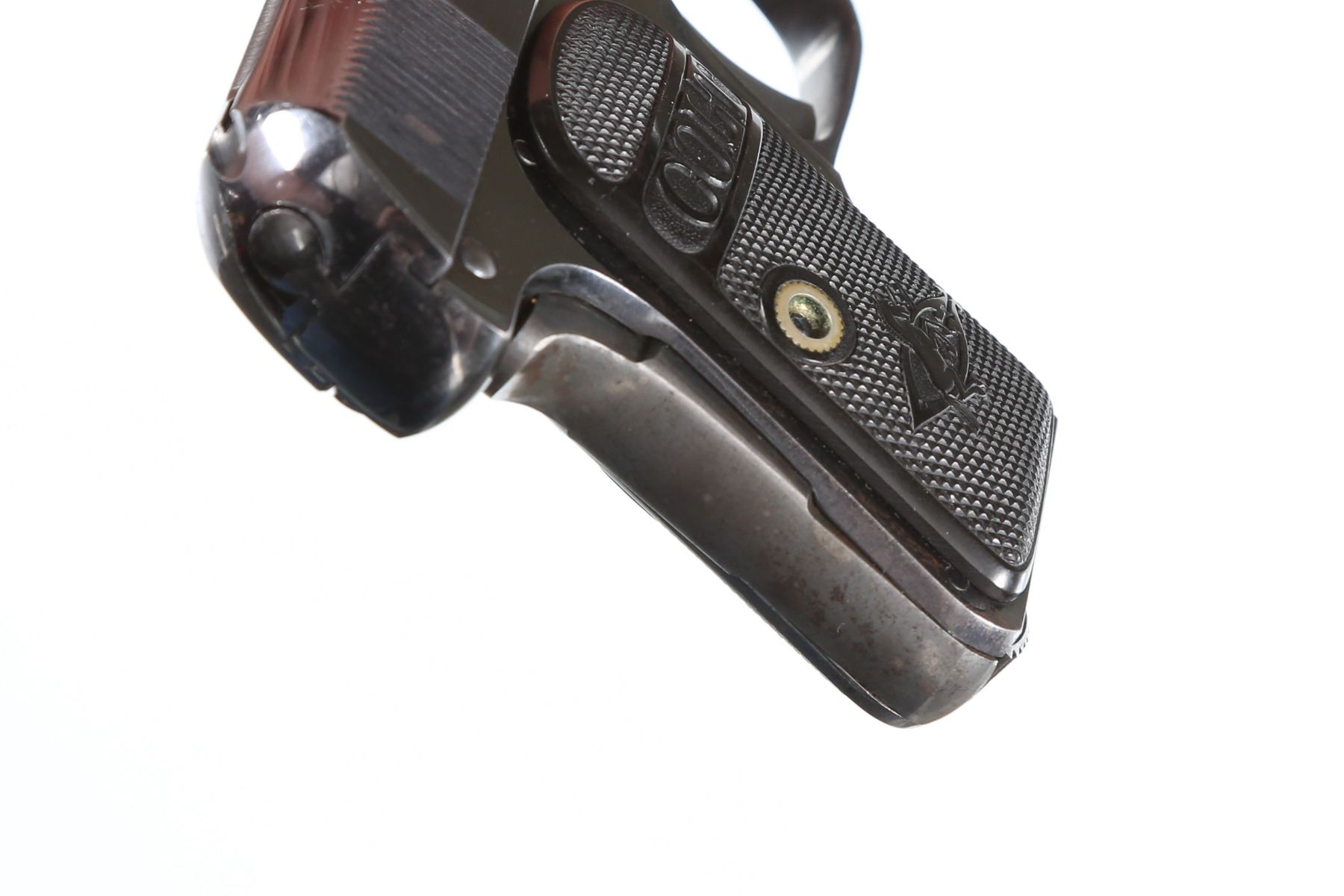 .25 ACP Serial # 39154 Very early production 1st model Colt 1908 Pocket Model .25 mfg. 1910 with high polish blue on slide & frame with blank all blue finished magazine and blue finished Bbl. Rampant Colt checkered hard rubber 2 piece grips. Condition, Very fine with 97% blue finish with excellent bore and mechanically excellent. Barrel 2 1/8" C&R