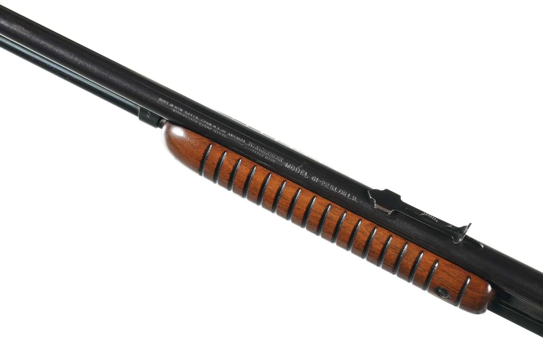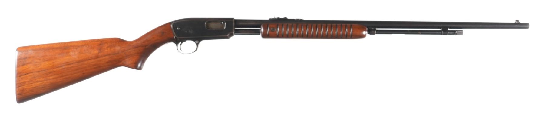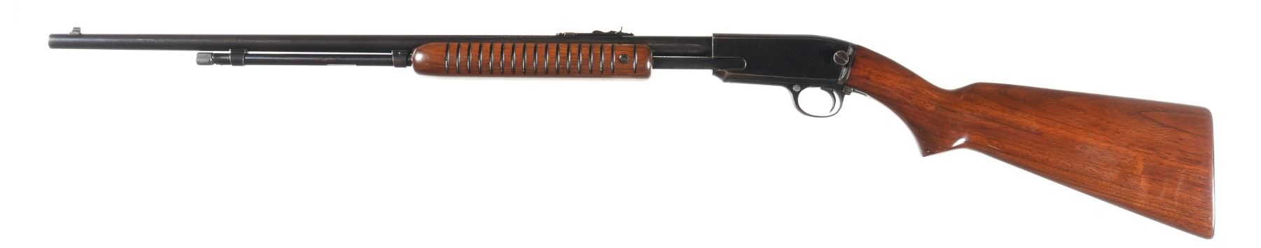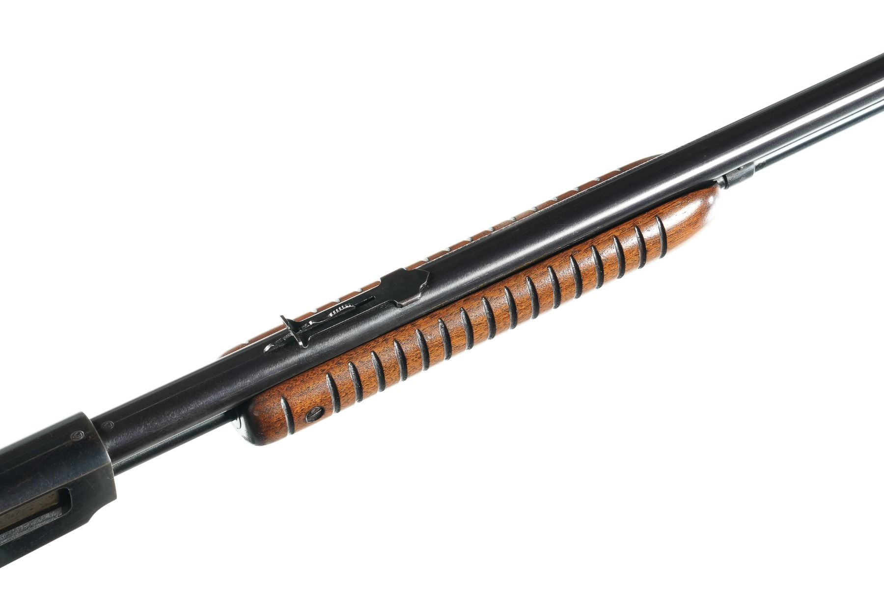 .22 sllr Serial # 145129 1950. Winchester model 61 22 SLLR pump rifle with polished blue finish. Varnished wood stocks and checkered steel butt plate. Fine bore with over 90% blue finish with spotting. Mechanically fine. Good stocks. Barrel 24" C&R