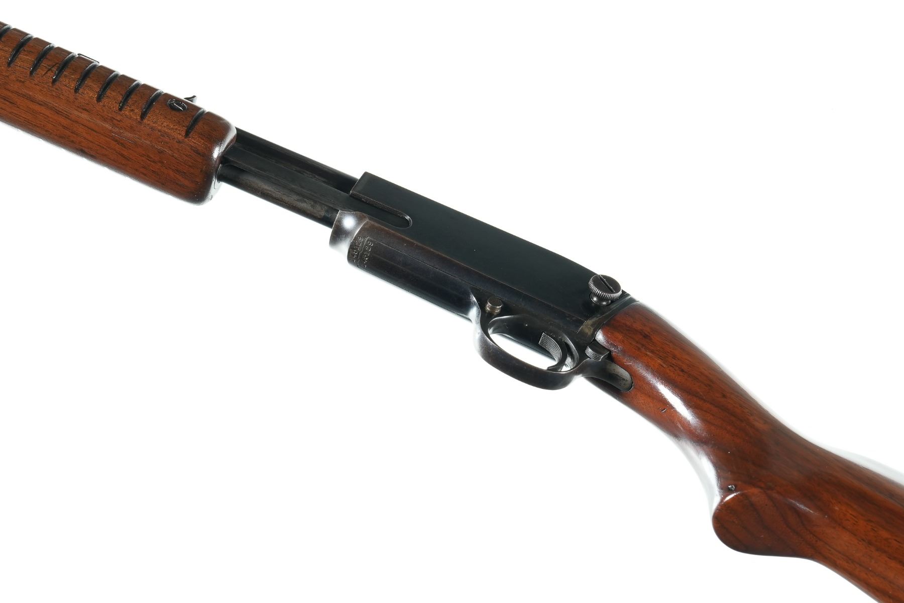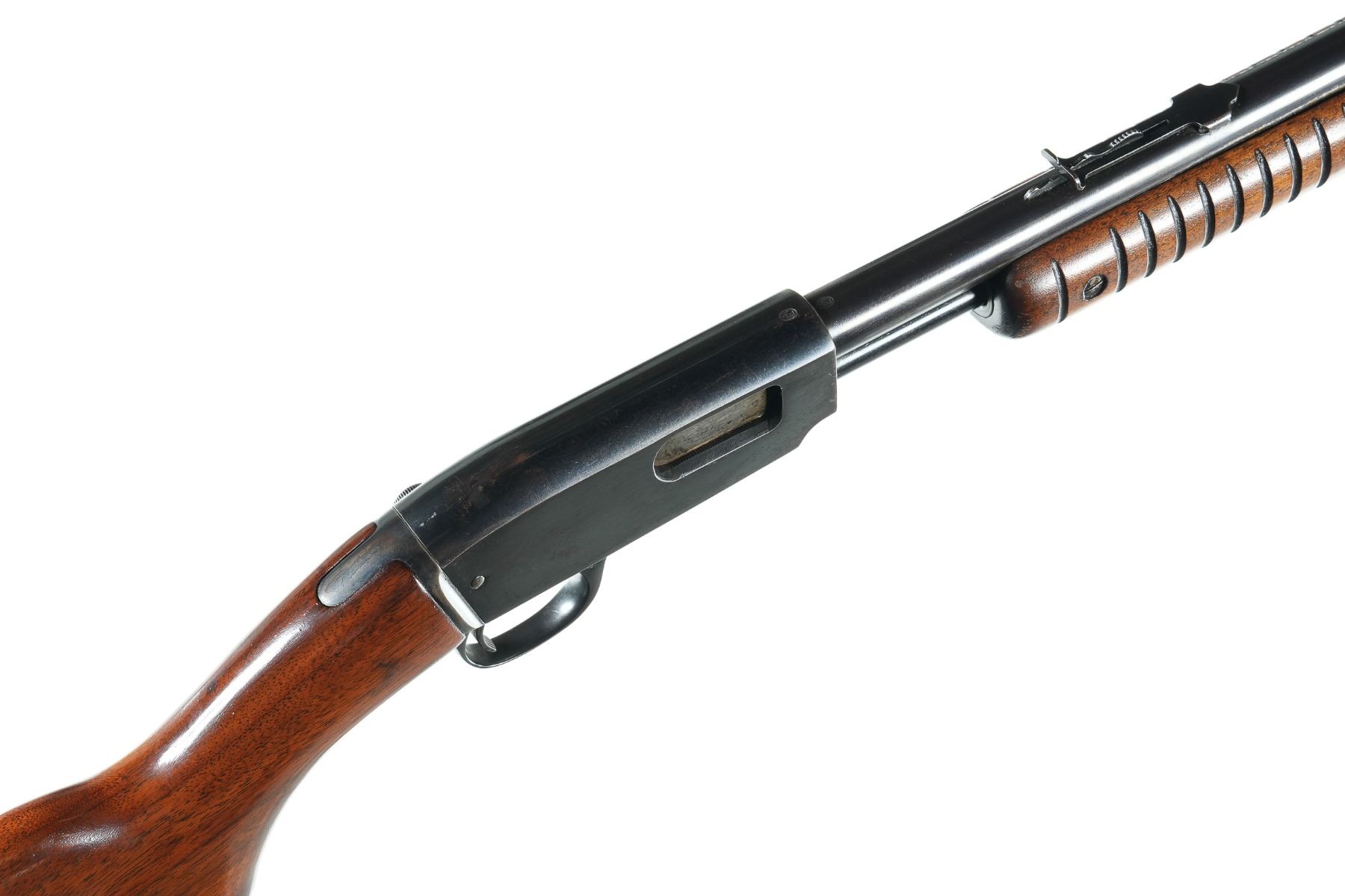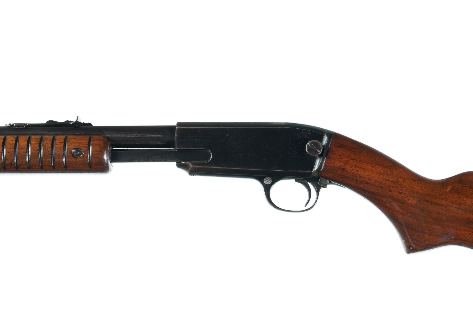.22 sllr Serial # 145129 1950. Winchester model 61 22 SLLR pump rifle with polished blue finish. Varnished wood stocks and checkered steel butt plate. Fine bore with over 90% blue finish with spotting. Mechanically fine. Good stocks. Barrel 24" C&R