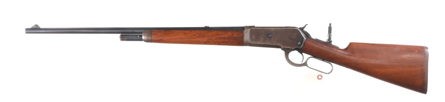 .33 wcf Serial # 153573 Winchester Model 1886 Extra Lightweight Takedown Sporting rifle with 1/2 Magazine, shotgun butt and tang sight. Blue finished barrel and receiver with case colored hammer and lever. Winchester monogramed plastic shotgun butt plate. Sporting blade front sight with folding express rear sight. Proper Lyman folding Mid_range tange sight. Chambered for the 33 WCF cartridge. Condition, Very fine with over 95% blue remaining on Bbl. 75% blue on receiver. Bright sharp bore. Hammer and lever retain 40% case colors. Stocks are very fine with most varnish remaining. Mechanically excellent. Mfg, 1914 C&R Barrel 24" C&R