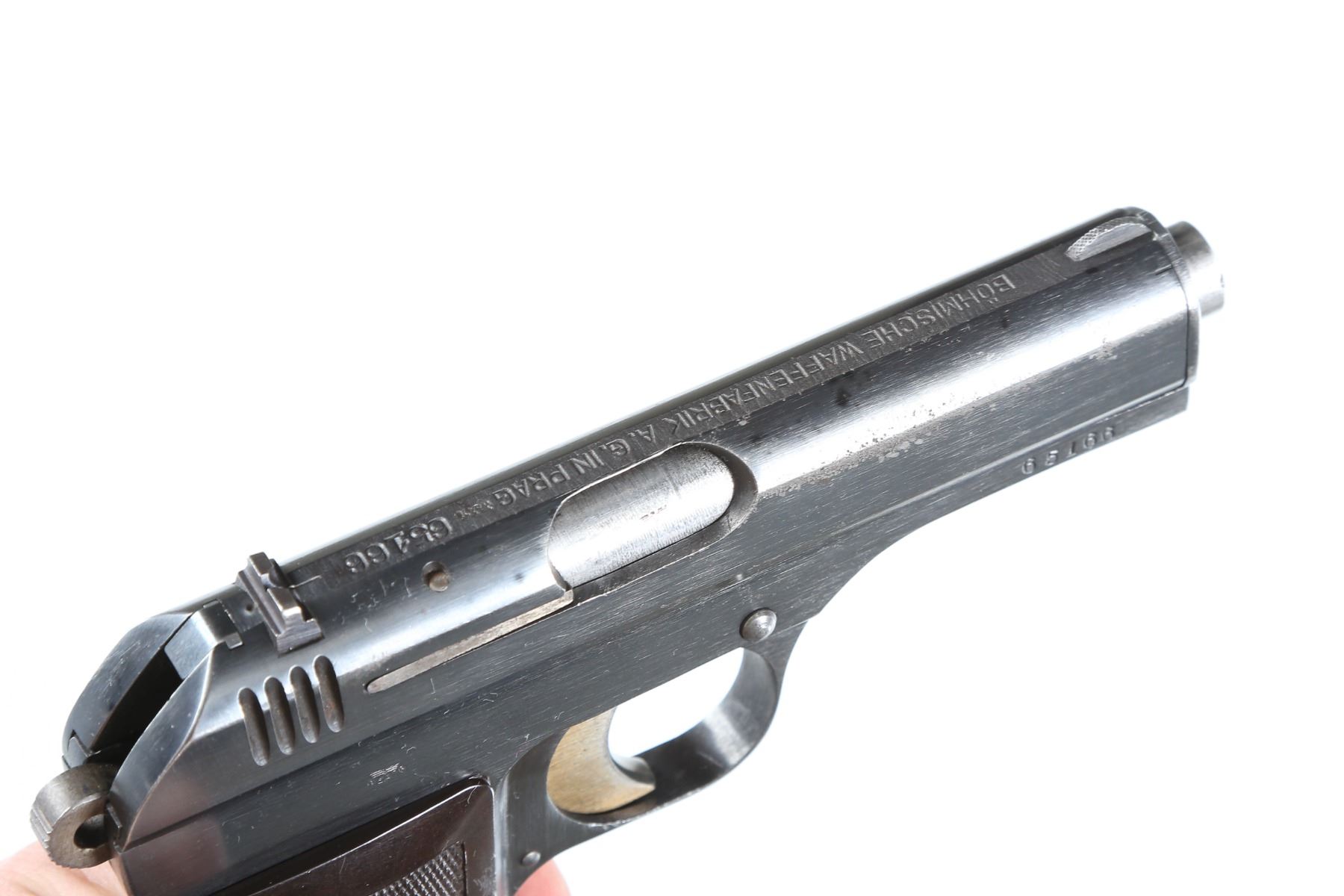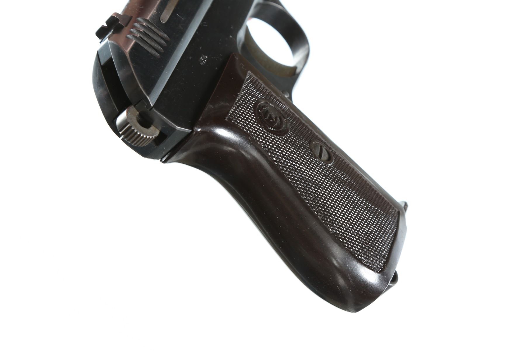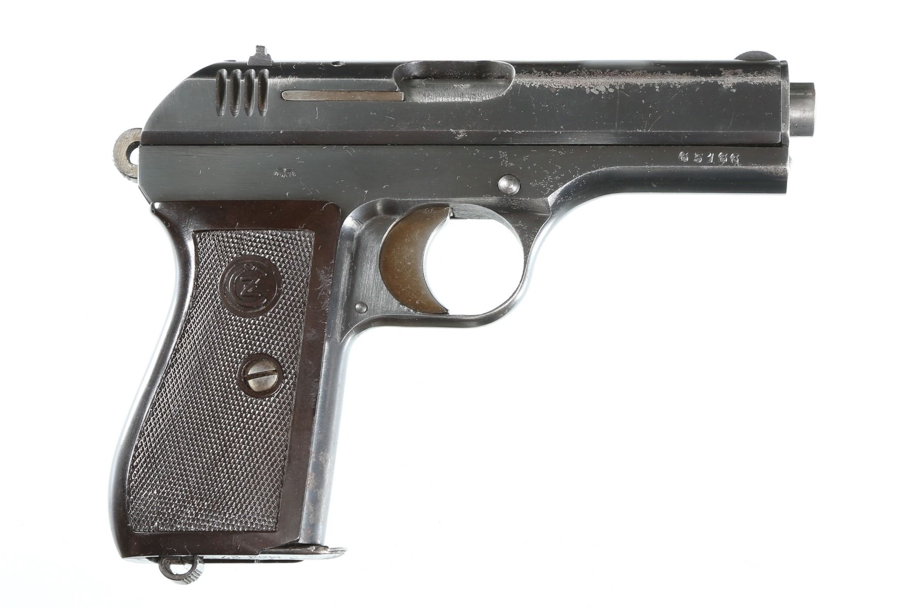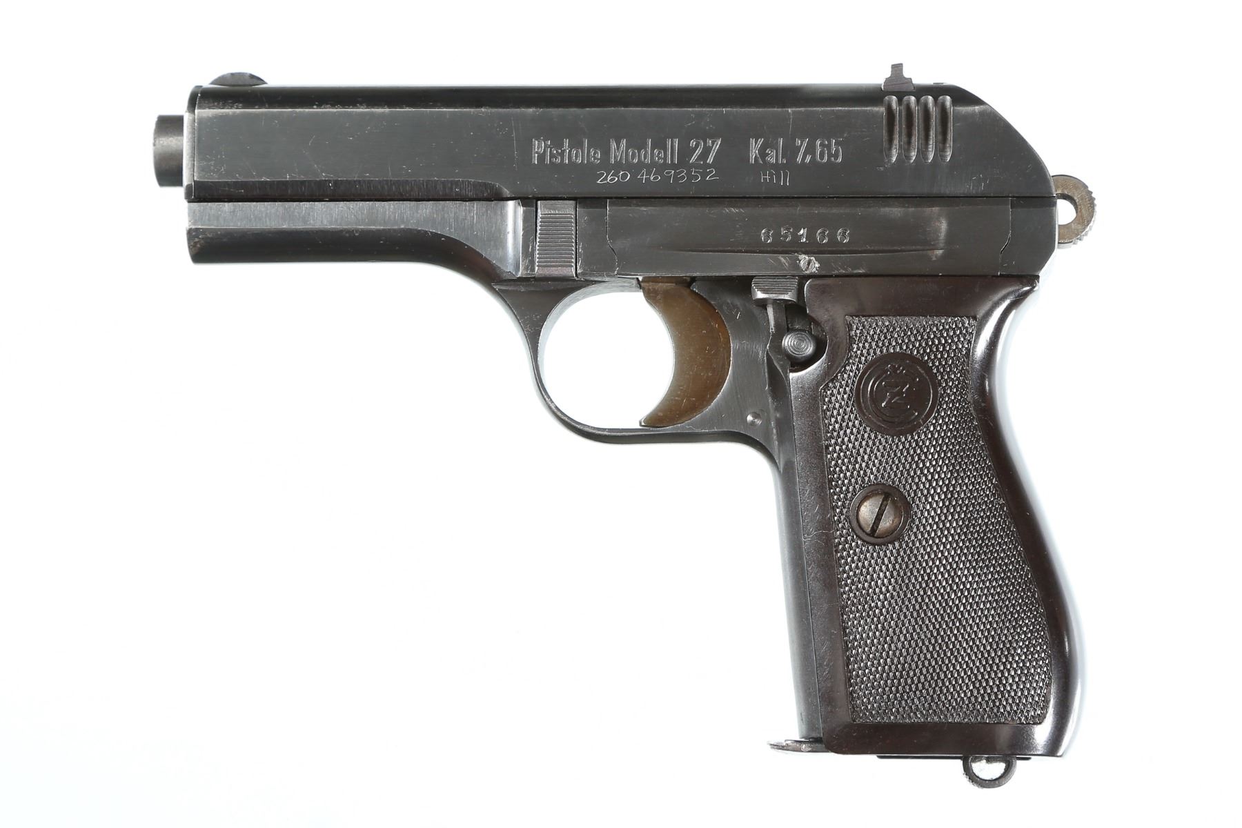7.65mm Serial # 65166 Czech War time occupation produced CZ 27 7.65 pistol with WaA76 Eagle proofs and brown checkered Bakalite grips with CZ monogram. Matching numbers with straw finishded screws and trigger. Condition, Very fine with most all blue remaining. Fine bright bore. Grips have typical small chips at leading edge of base. A SS# is lightly scribes in the right side of frame. Mechanically fine.