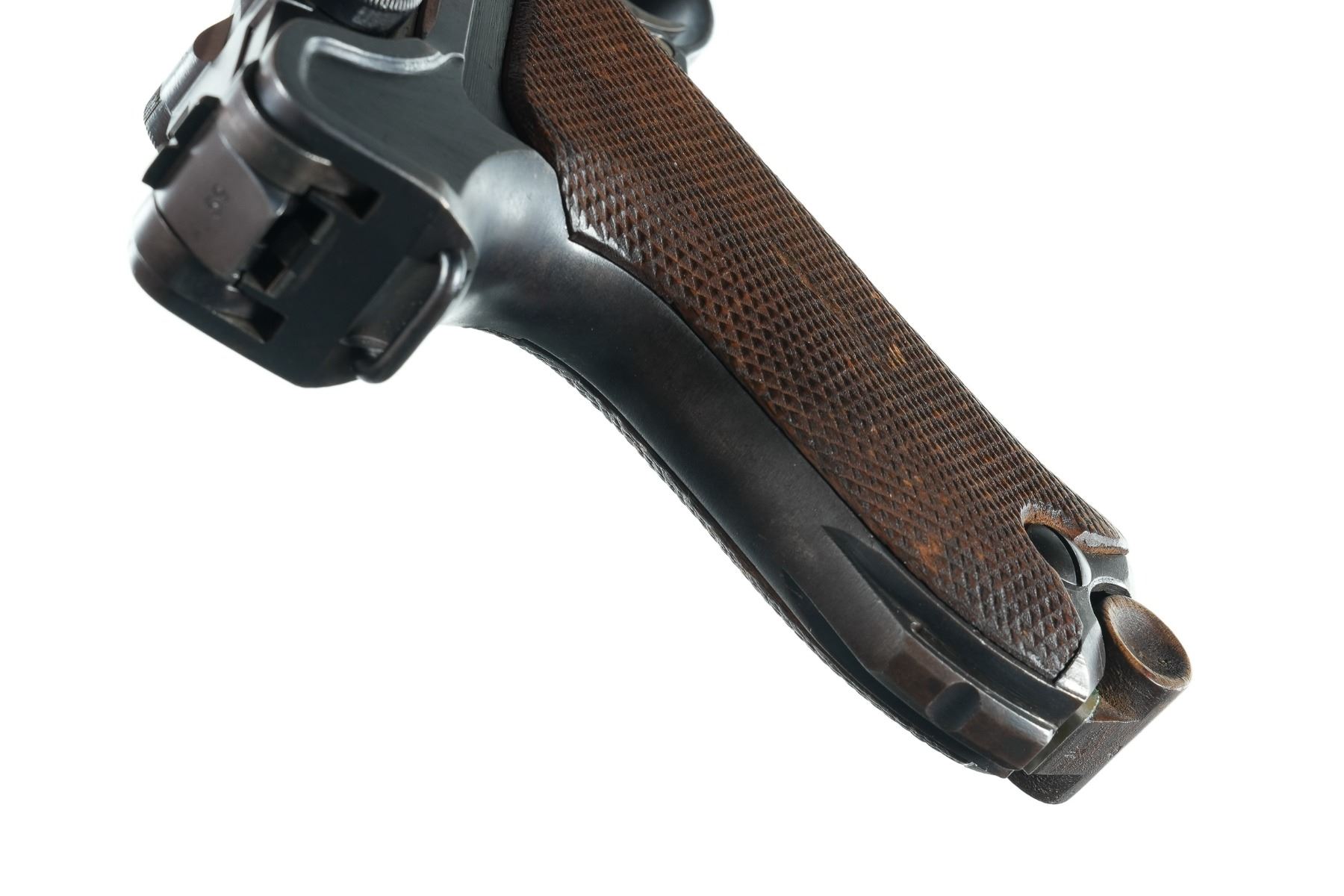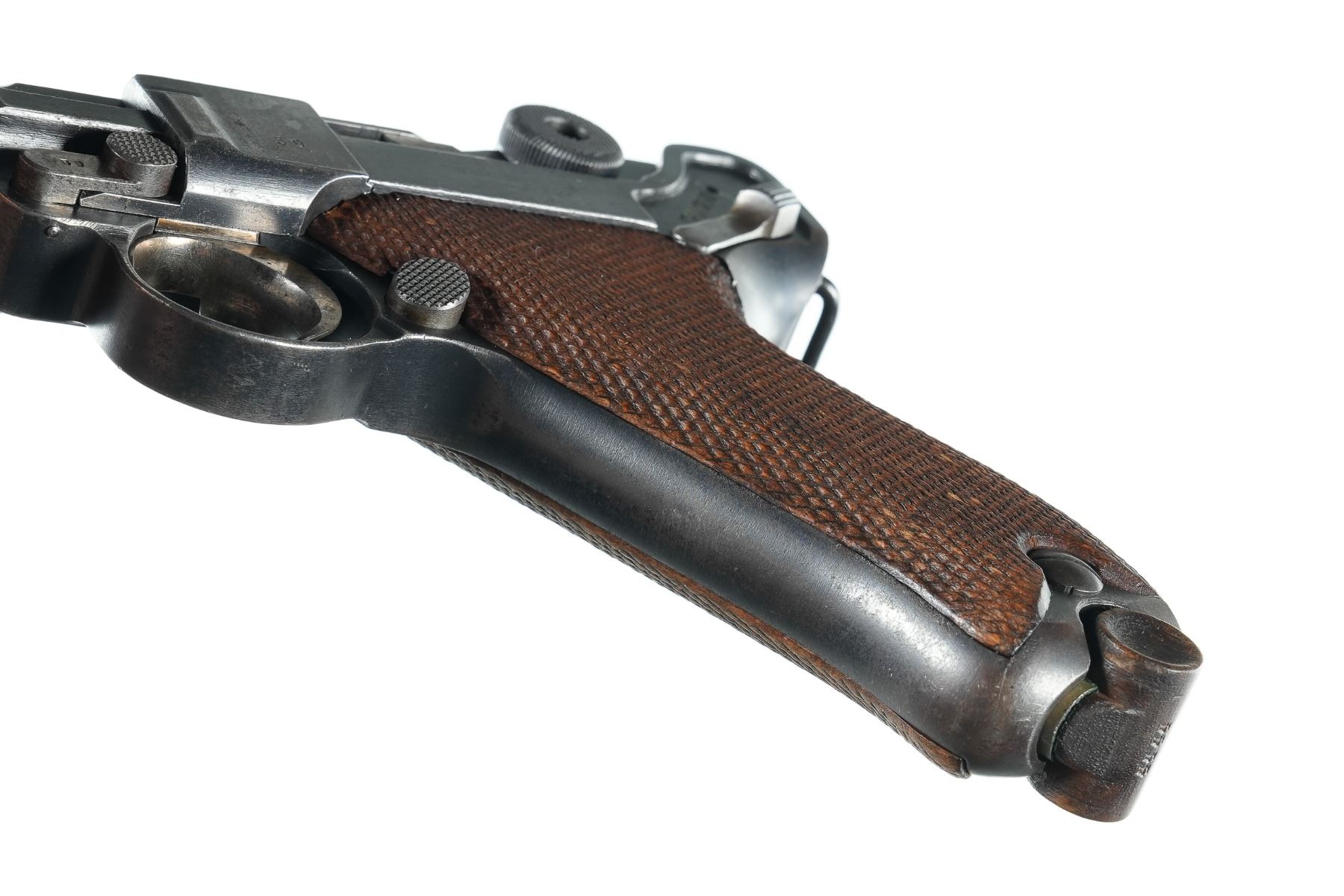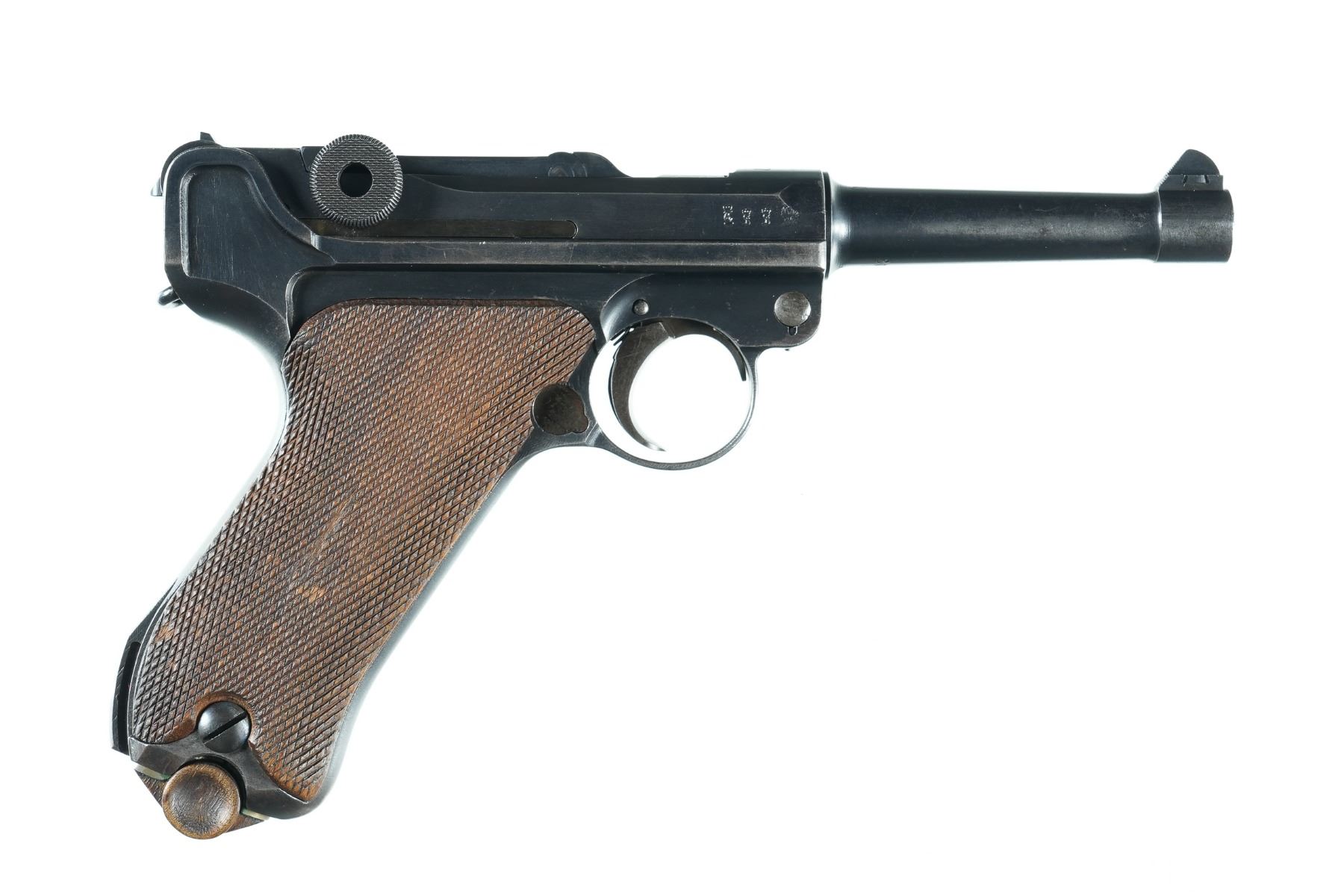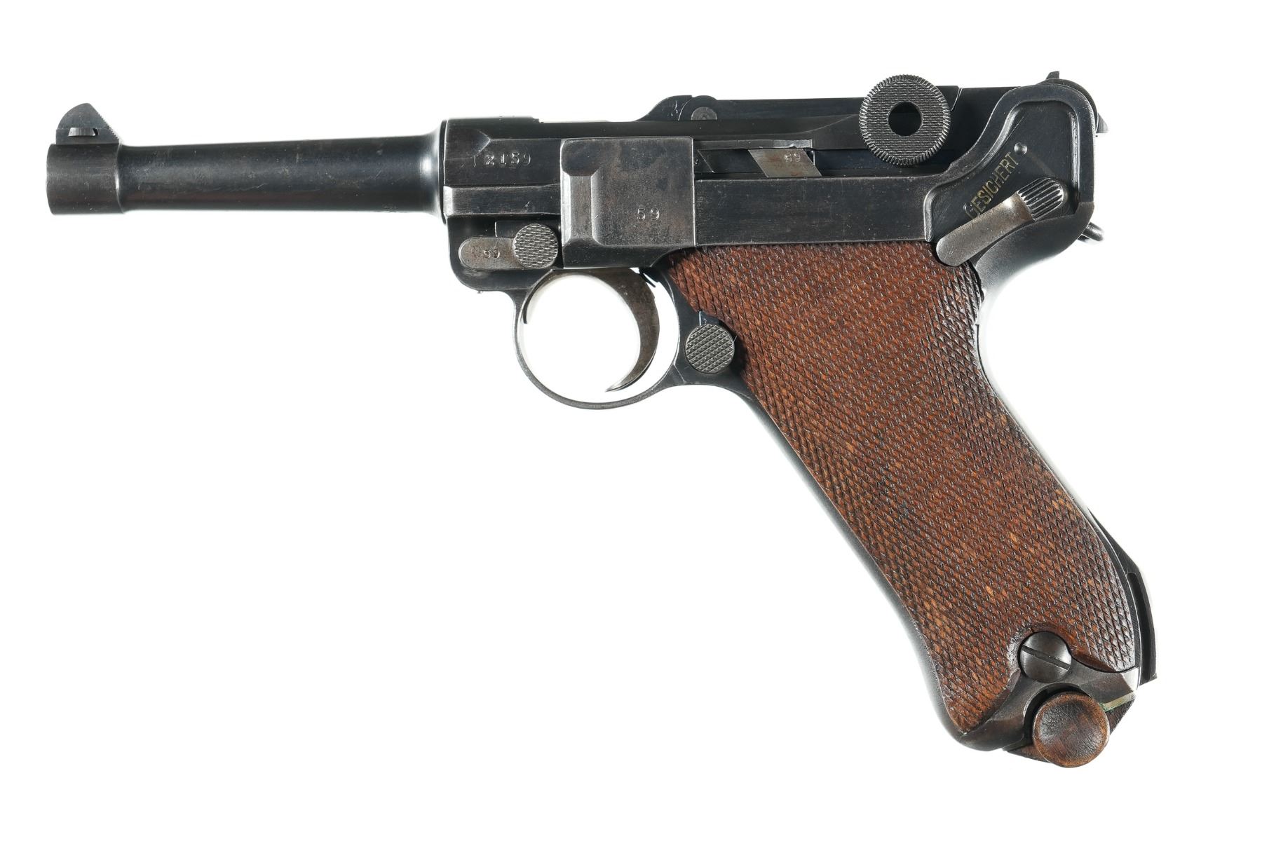 9mm Serial # 2159b "Crown/Gothic letter" proofed. Mixed magazine, otherwise matching external serial numbers with matching grips. Very good overall condition, Matching with exception of magazine. Most all finish remains with fine bore Barrel 4" C&R