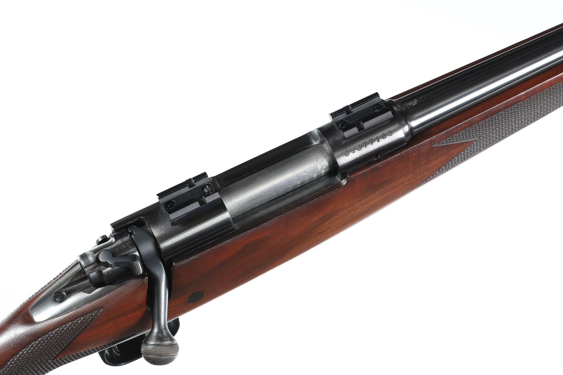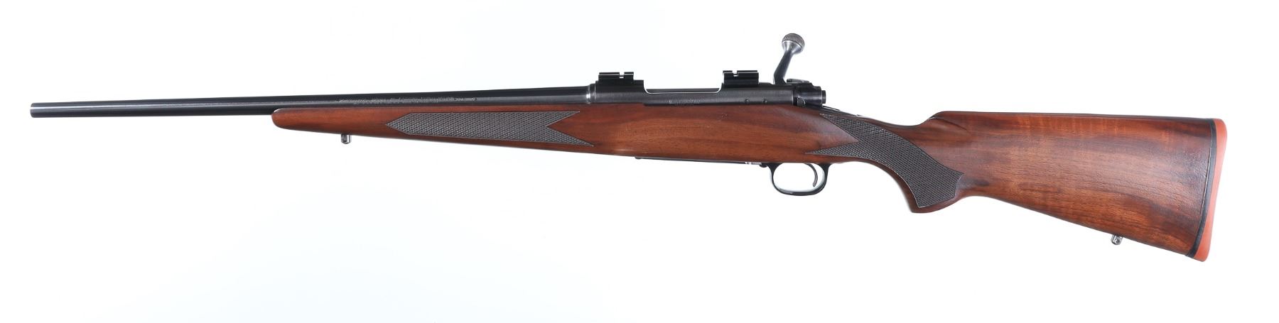 .308 win Serial # G1677163 Scarce Winchester Model 70 Carbine Short action Cal, 308 with 20" tapered Bbl. Mounted with Weaver scope bases. Varnished checkered pistol grip walnut stock with factory pad. Excellent plus overall condition, virtually no handling marks. Some finish loss to bolt head and minor light spotting to floorplate. Short action. Barrel 20" Modern