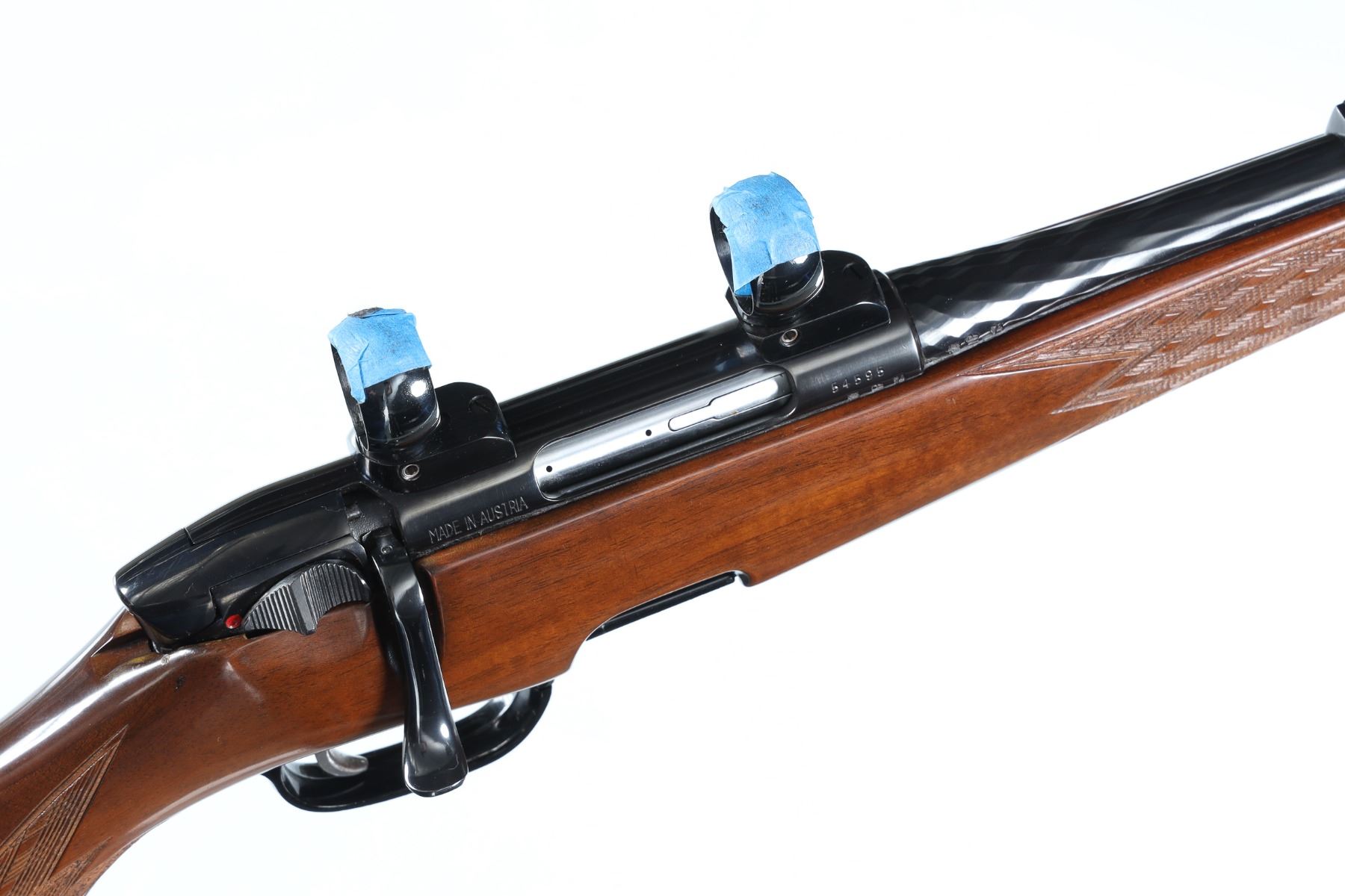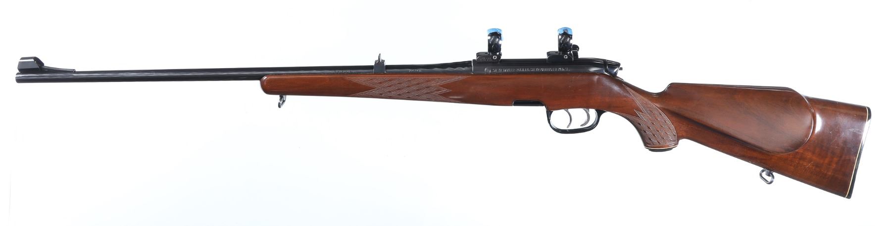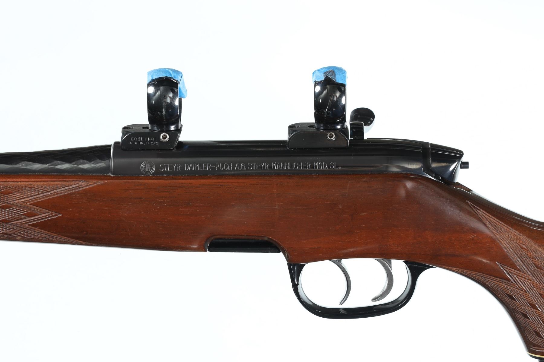 .223 rem Serial # 54595 Steyr Mannlicher SL series rifle with double set triggers and detachable rotary magazine. Produced 1974 .Excellent overall condition, minimal light handling marks, hammer forged twist barrel with scope rings and base. Mechanically excellent. Barrel 23 1/2" C&R
