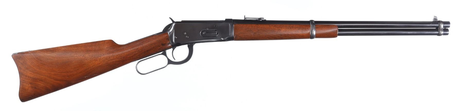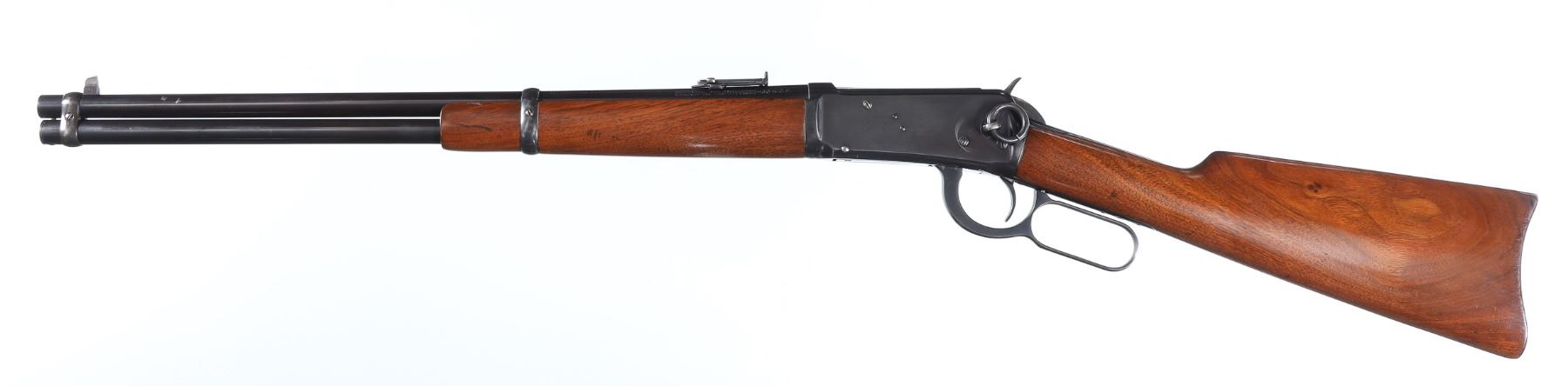 .30 wcf Serial # 949120 Winchester Model 1894 Saddle Ring Carbine chambered for .30 WCF with varnished walnut stocks. Post & blade front sight and ladder adjustable Carbine rear sight with Saddle Ring on left side of receiver. Mfg. 1922. Condition. Very fine as refinished with bright sharp bore. and crisp legends. Mechanically excellent. Barrel 20" C&R