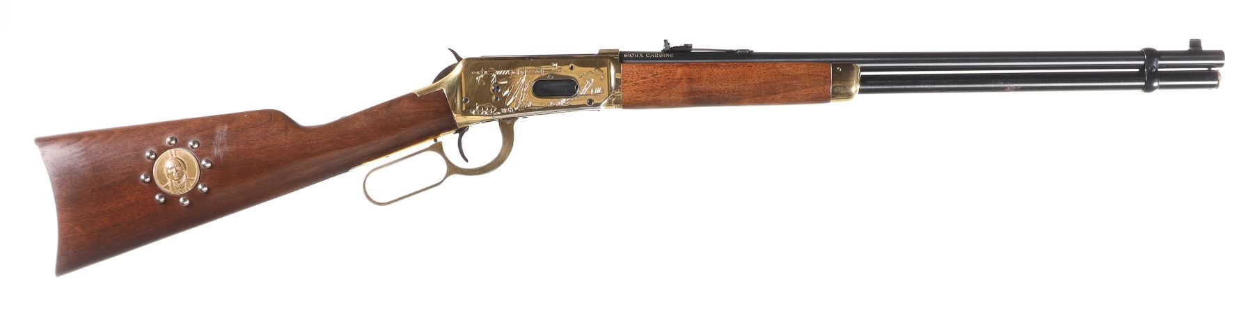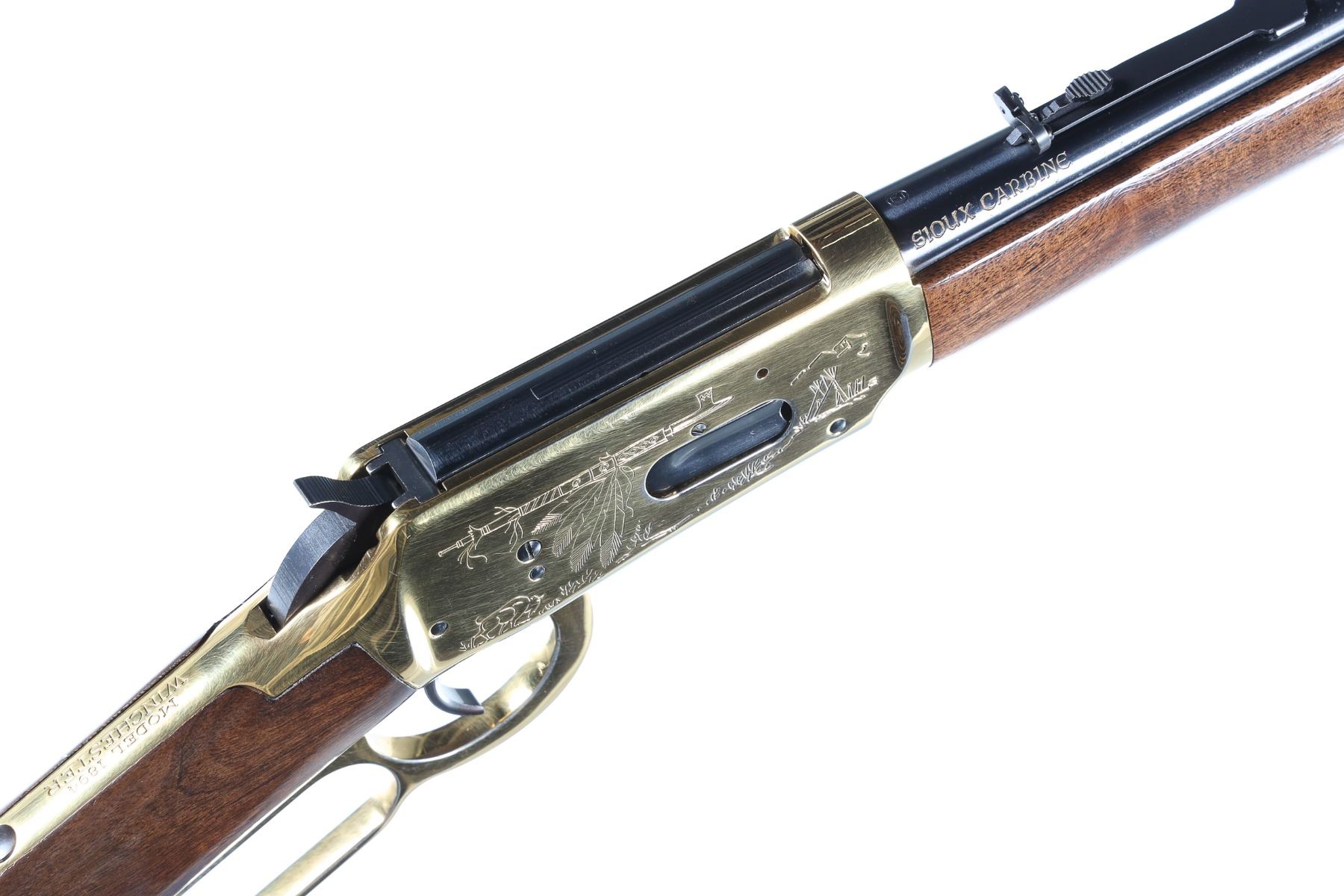 .30-30 Serial # SU08020 Winchester 94 Sioux Commemorative rifle with gold toned receiver with Sioux indian coin inst in stock and Native American engraving on receiver, Varnished walnut stock . Mfg 1976. Condition. Fine with some handling and but remains as new. Barrel 20" 1976 Modern