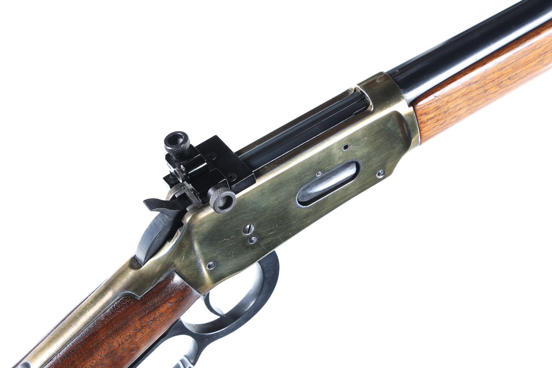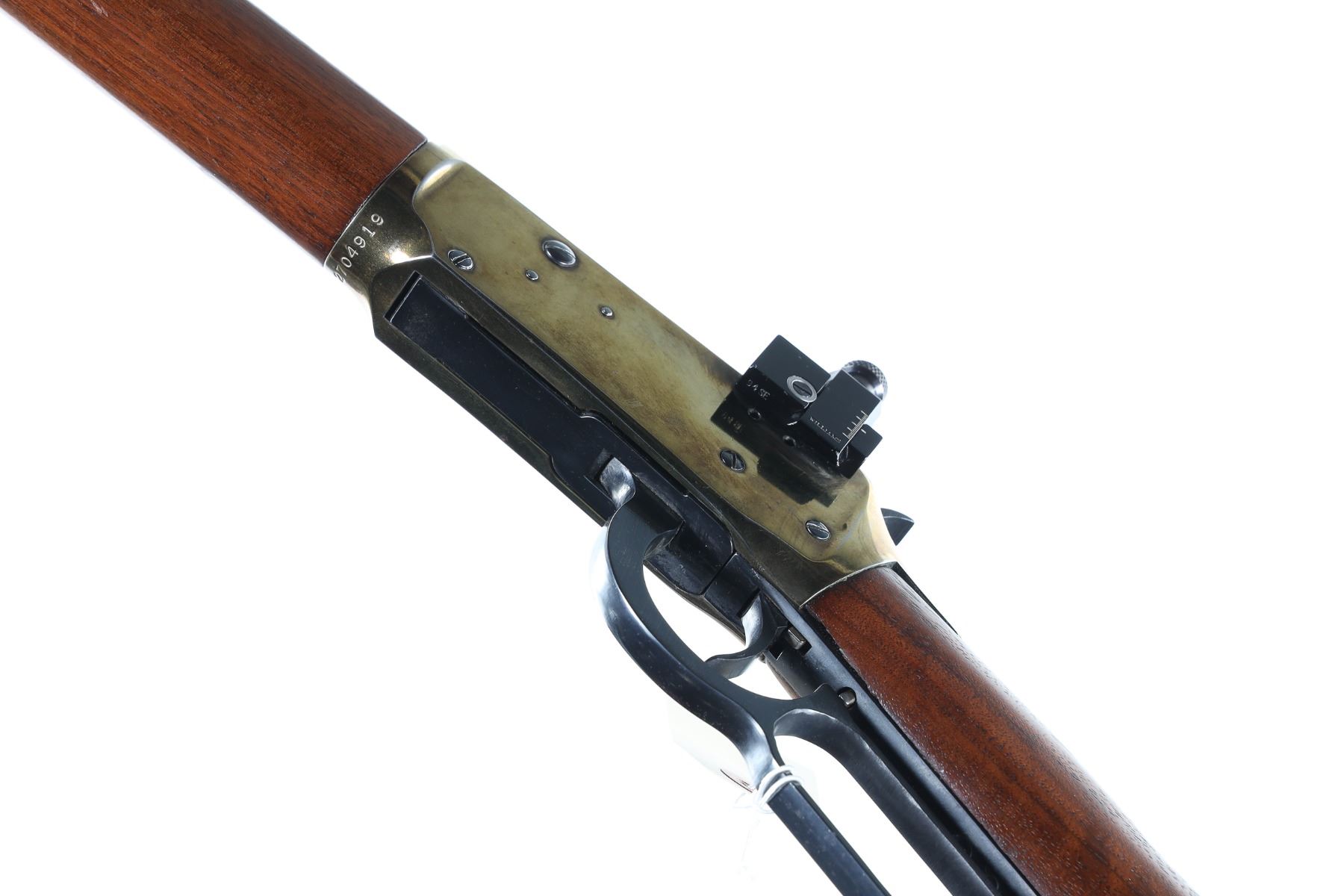 .30-30 Serial # 2704919 Winchester Model 94 30-30 with globe front target sight and Williams receiver sight. Walnut stocks with recoil pad and gold tone plated receiver to emulate the Model 66. Condition, Very fine with custom finishes with some finish loss on frame. Stocks are full sized and very good mechanically fine Barrel 20" 1964 C&R