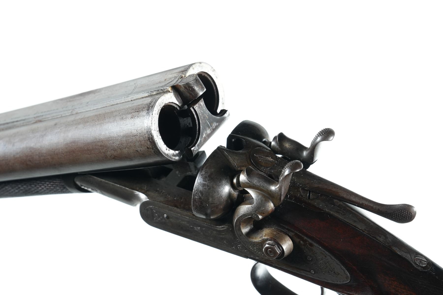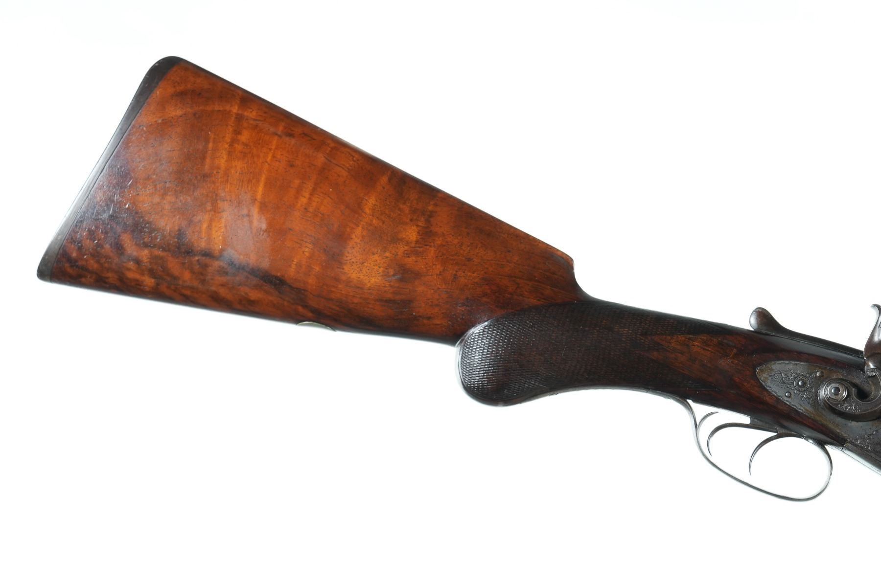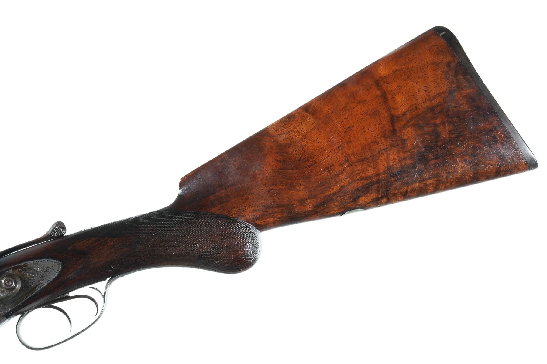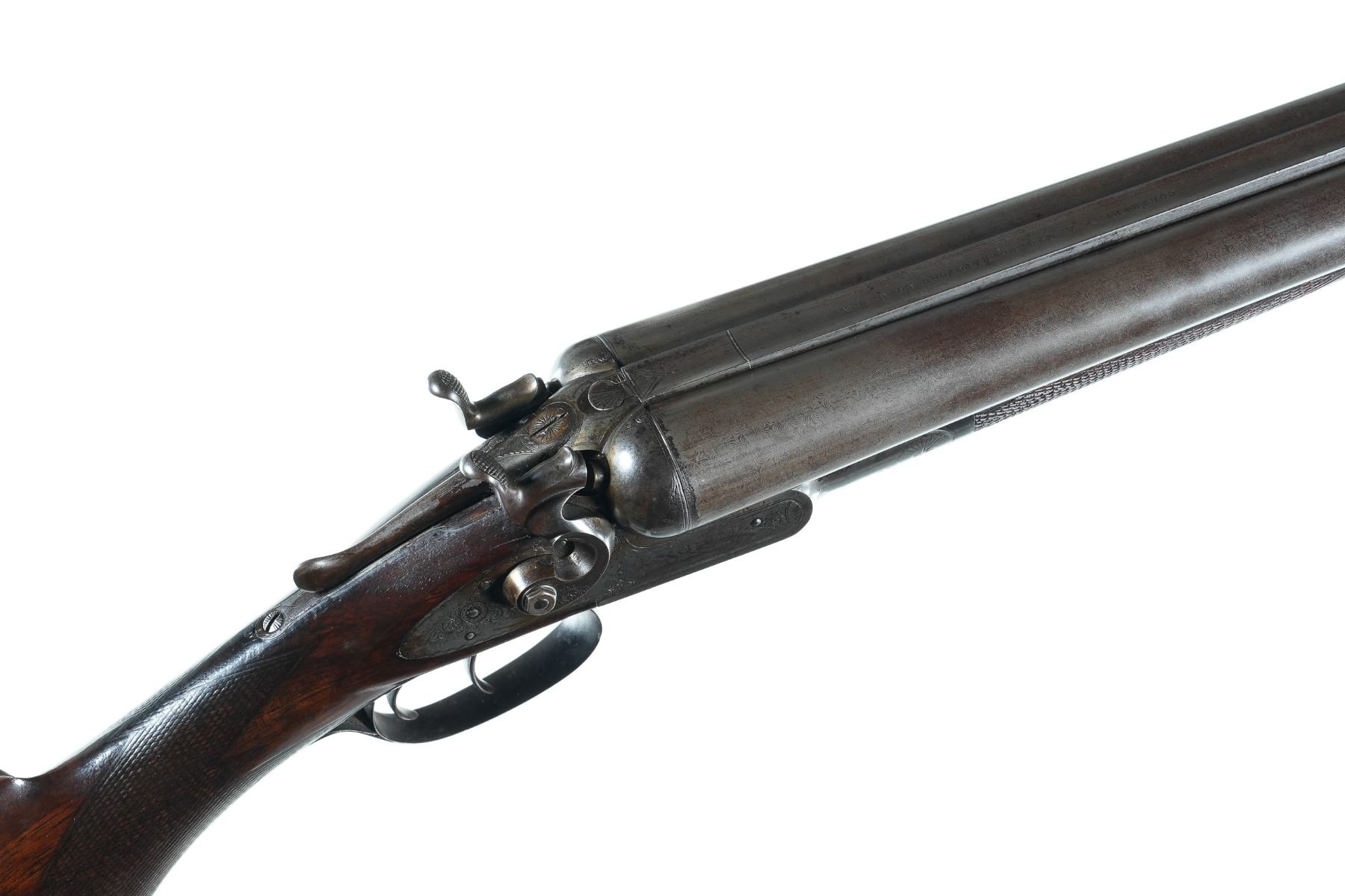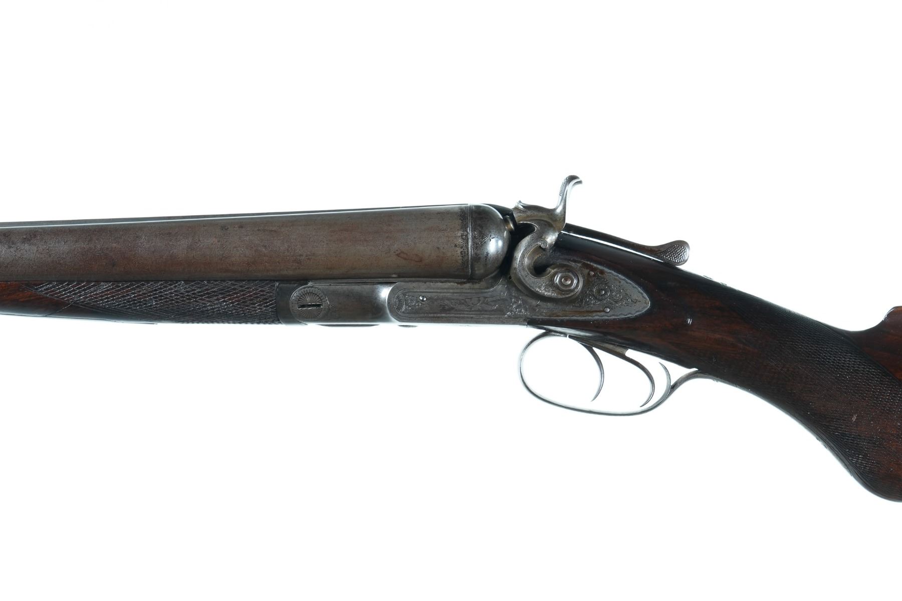 10ga Serial # 19444 Manufactured in 1885. Barrels loose on face. Stock is cracked at wrist. Chambers measured 2 7/8" with extractor, chokes measured modified/modified, and 14 1/4" LOP. Condition very fine with excellent stocks and fine damascus. Mechanically fine Barrel 32" NO4473