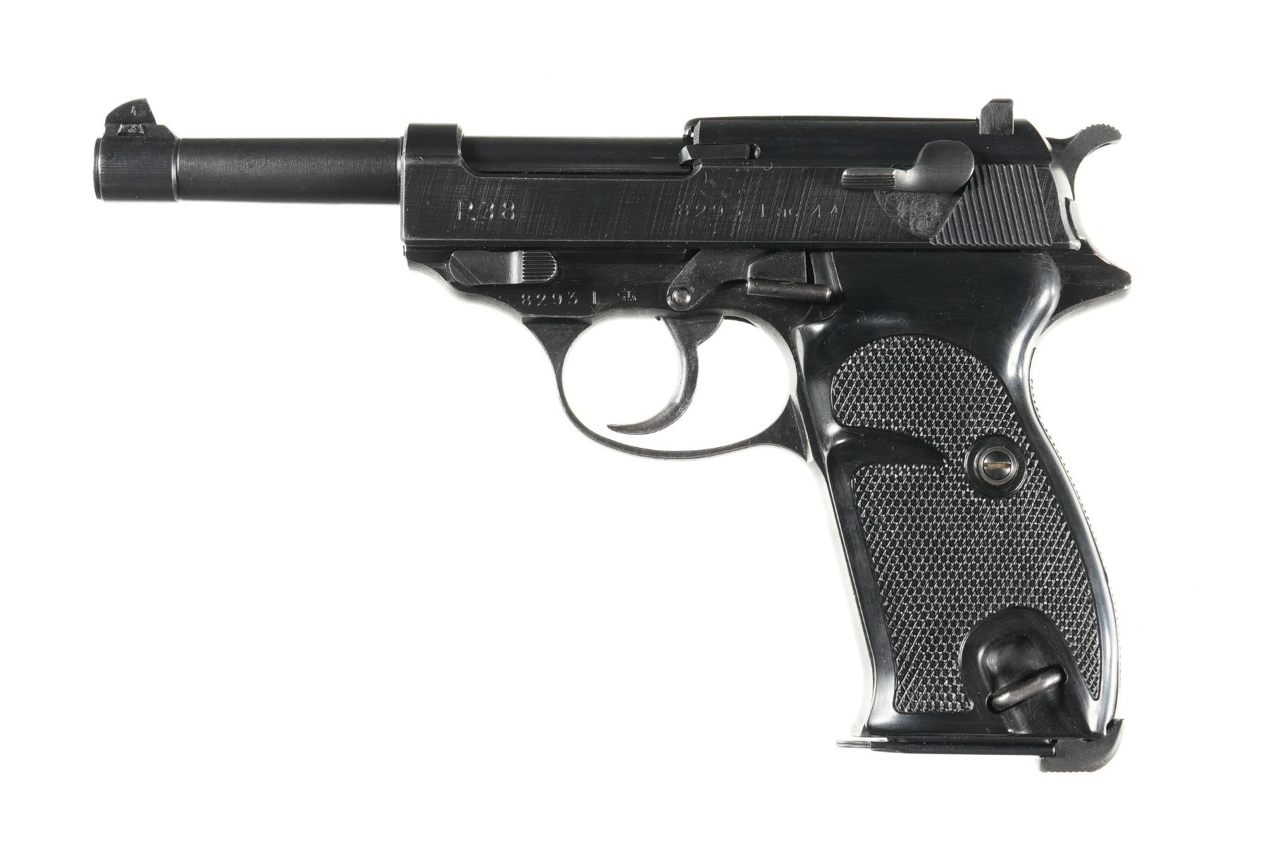 9mm Serial # 8293l Walther AC 44 Code (line date) P-38 9mm pistol with Eagle 359 proofs, Matching numbers including locking bolt. Pistol is extremely difficult to disassemble. Condition Fine with over 80% finish with worn grip strap, Excellent bright bore. . Barrel 5" C&R
