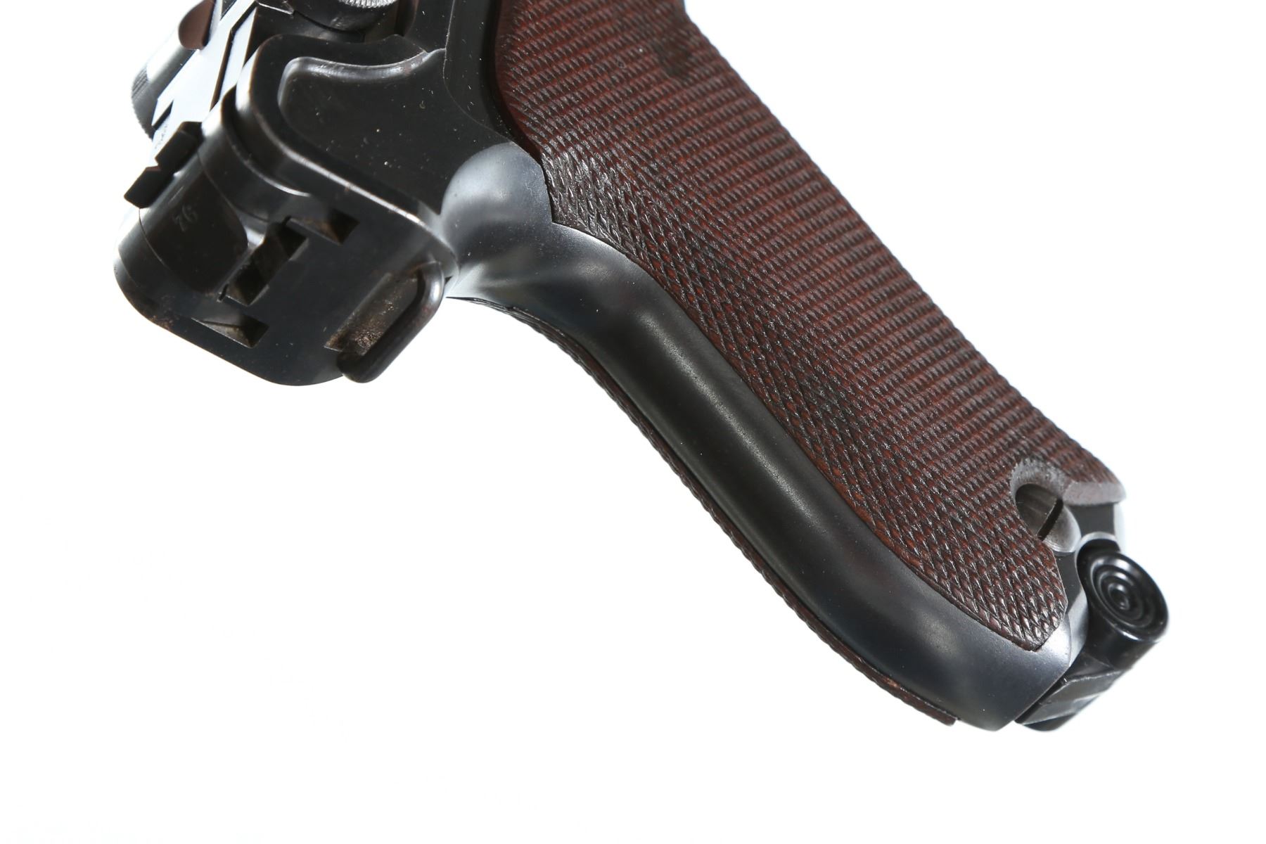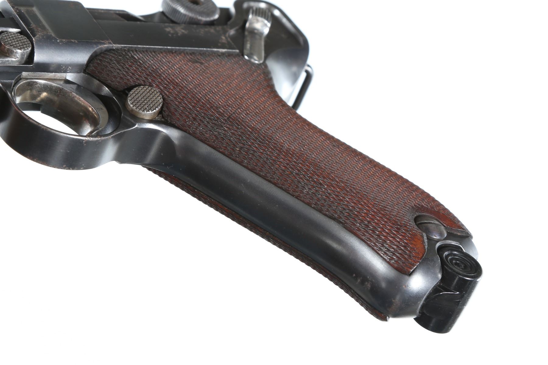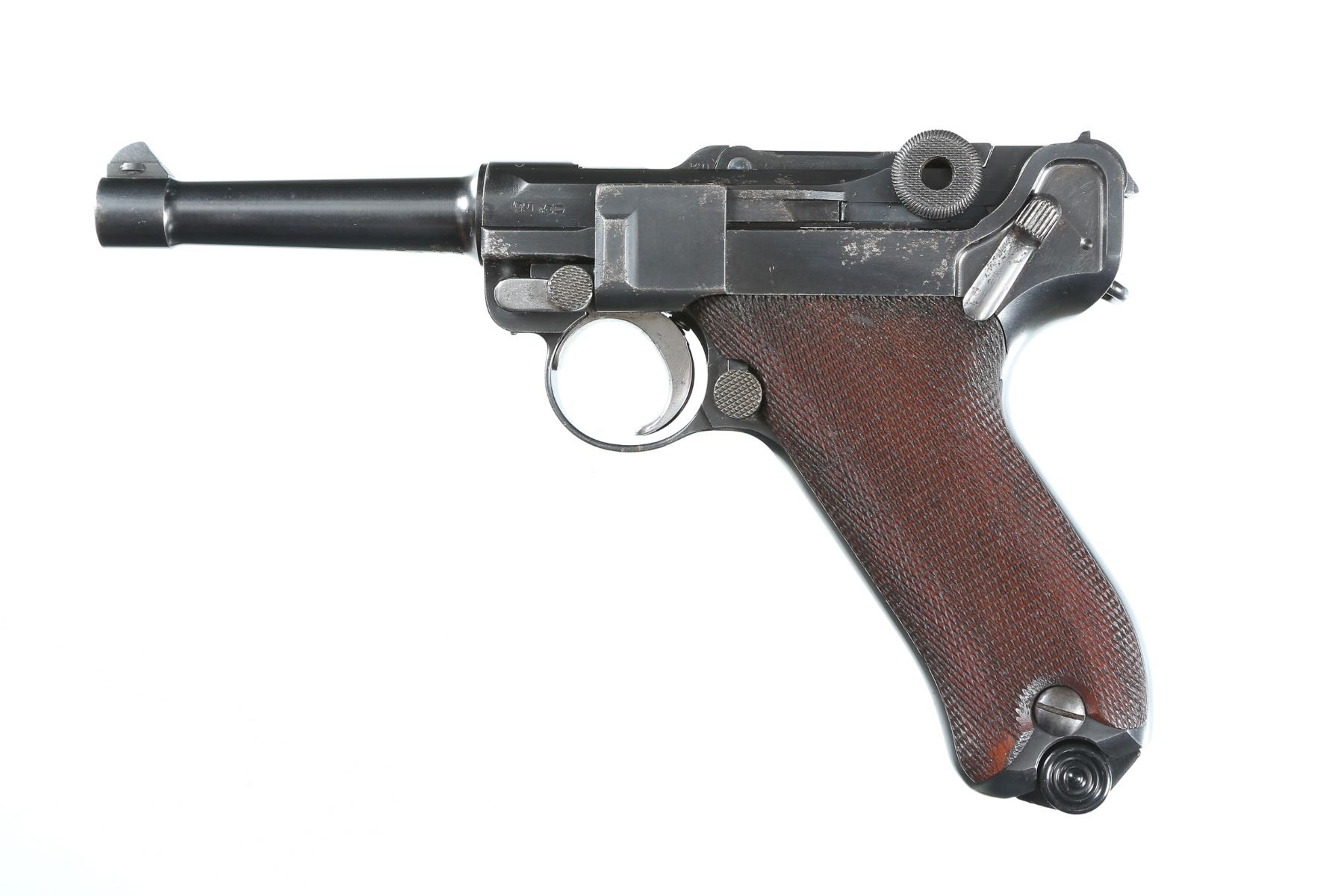 9mm Serial # 50476 Early Commercial DWM Model P08 Luger 9mm with Commercial Bug proofs and made with out stock lug or bolt stop. Matching numbers with exception of replacement magazine. Condition. Very fine with over 97% blue with excellent bore and fine checkered walnut grips with some minor impressions. Blank chamber DWM script marking on toggle. Mechanically excellent. Barrel 3 7/8" C&R