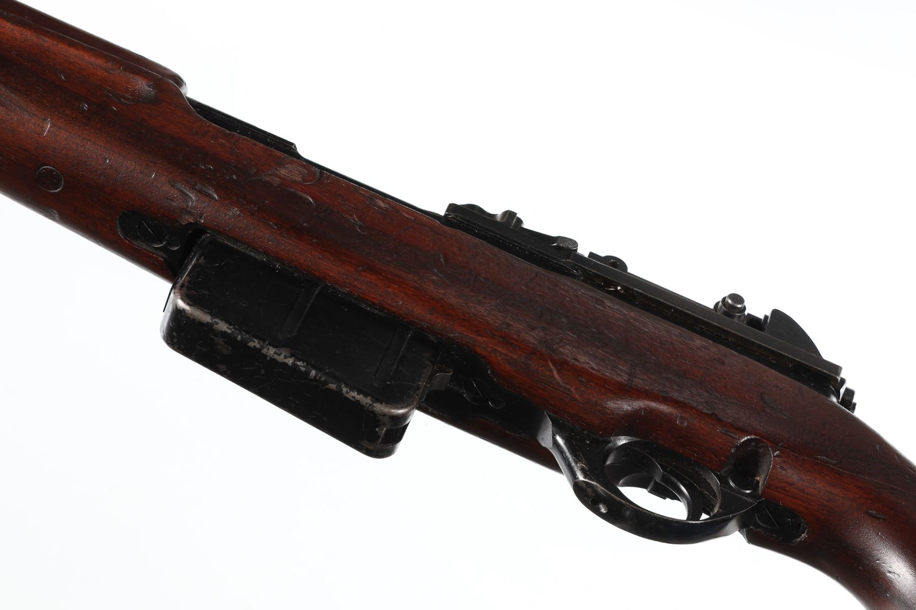 7x57 Mauser Serial # 7058 Manufactured between 1949-1956 as part of the Venezuelan contract, with a Venezuelan crest marked on the top of the receiver. It has matching serial numbers, one-line FN address on the right of the receiver, slotted, detachable muzzle brake, bayonet lug, battle sights, and pistol grip stock with "FUERZAS ARMADAS/VENEZUELA" stamp on the right, sling swivels, and a ribbed buttplate. One of 8003 produced. Condition, Excellent with bright bore and matching numbers. Most all epoxy finish remains. Stock is excellent with period of use impressions and crisp cartouche. C&R Barrel 24" C&R