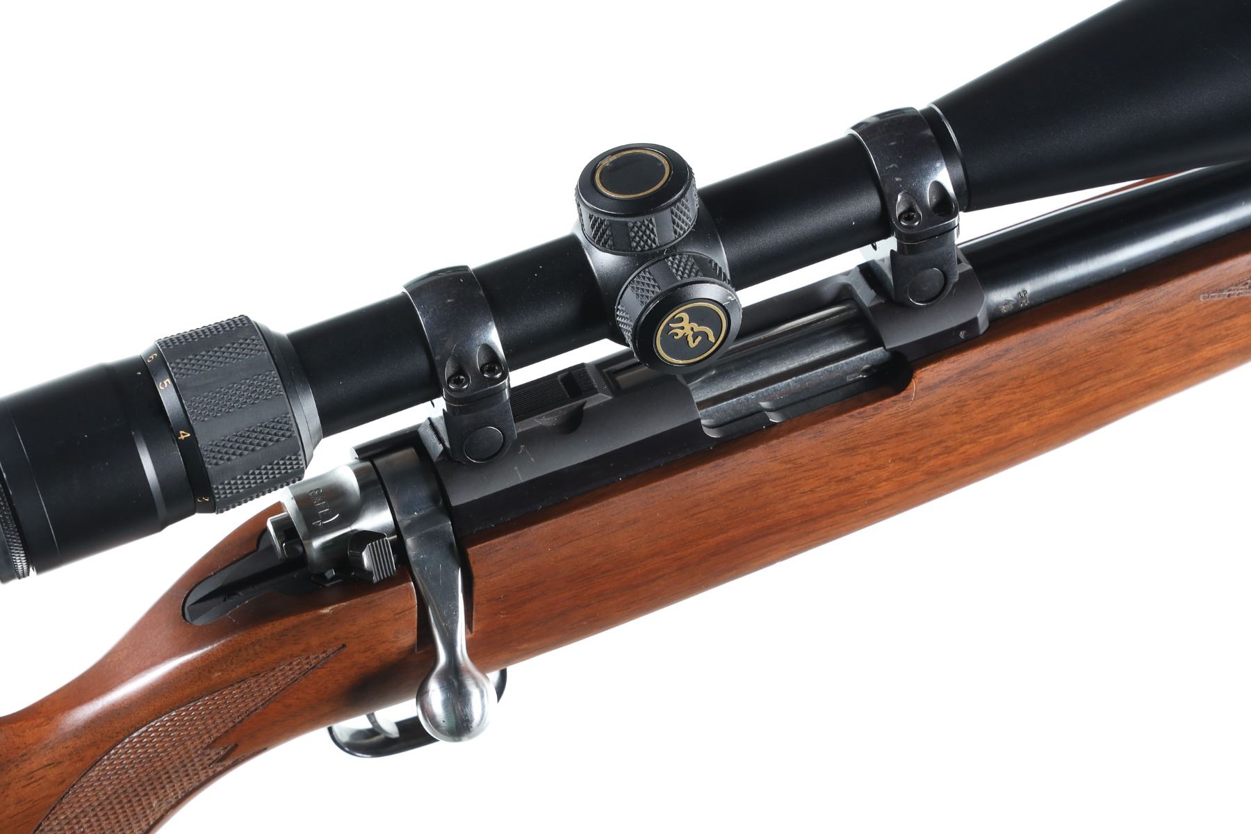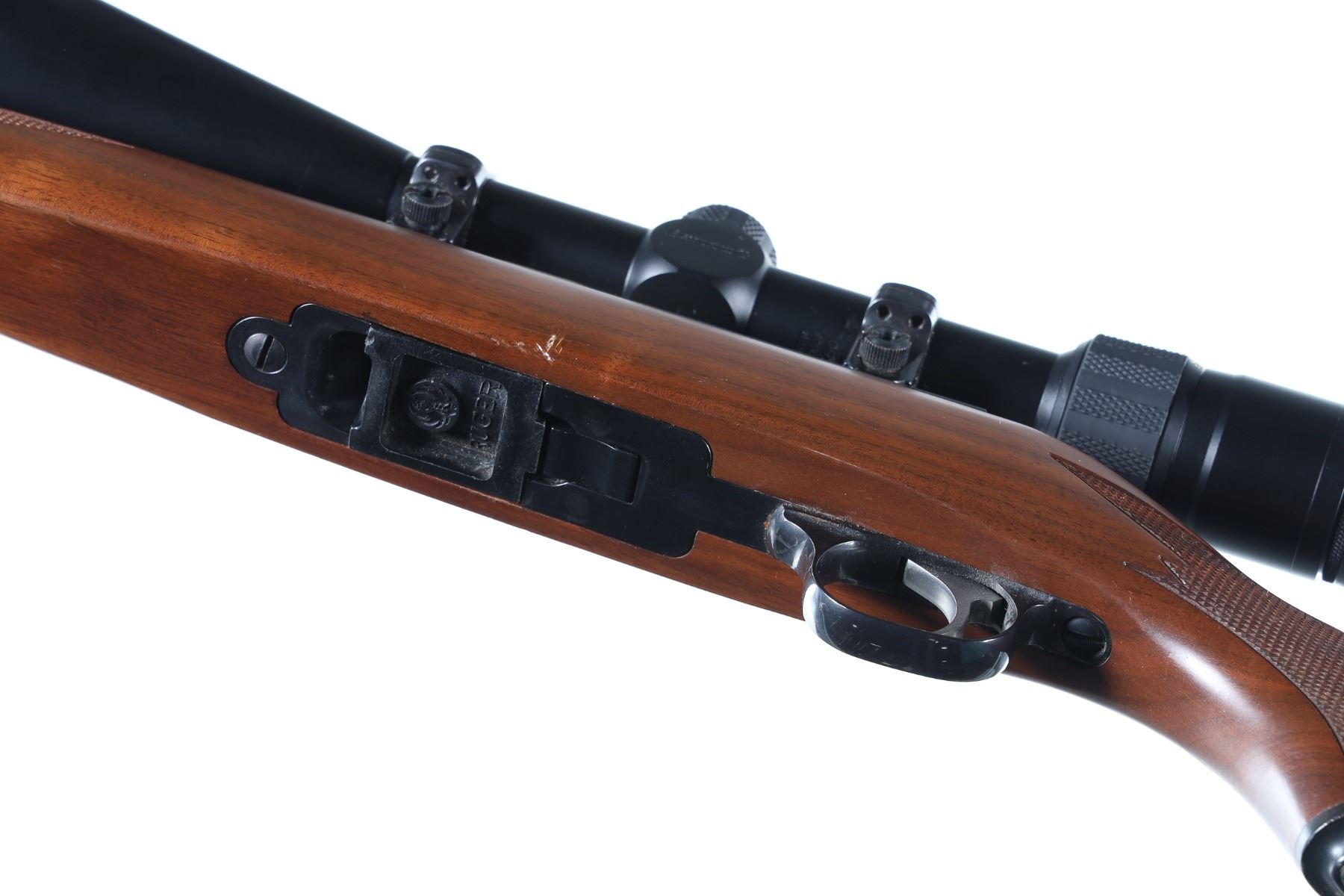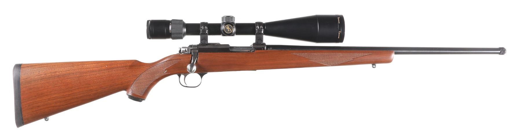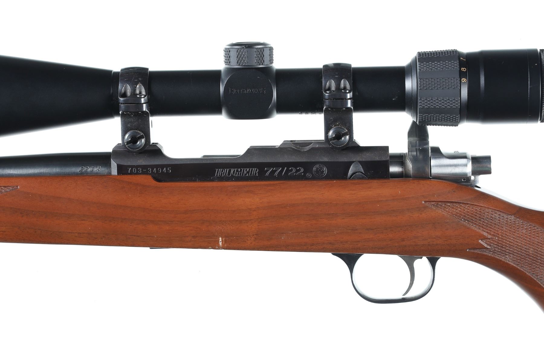 .22 LR Serial # 703-34945 Ruger M77 / 22 22 Long Rifle with threaded muzzle and walnut stock with black recoil pad. Browning 3-9 Variable scope with Ruger rings. Condition excellent with a few marks in stock. Optics are bright Barrel 20" 2006 Modern