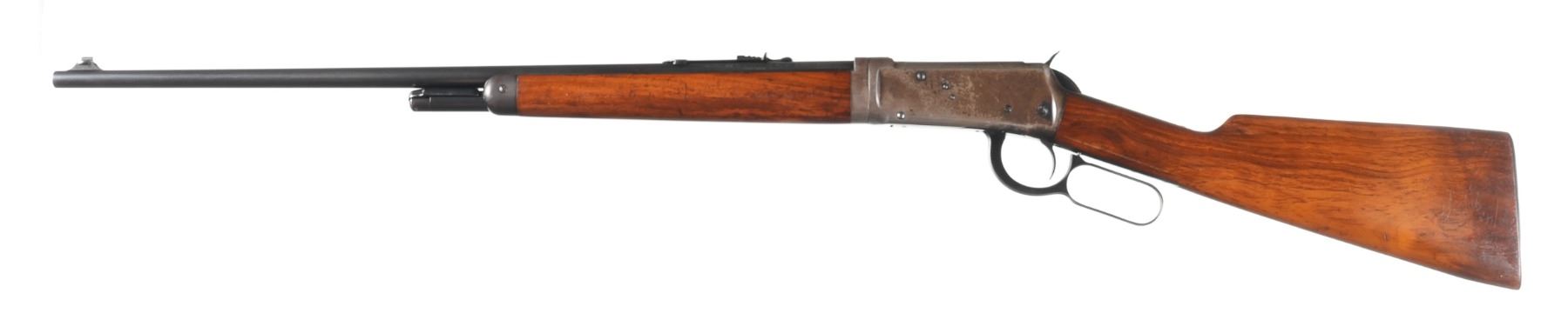 .30 wcf Serial # 1047168 Winchester model 55 take down Lever rifle Cal. 30-30 with 1/2 Mag and shotgun butt. Fine original condition with bright bore and mechanically excellent. Most all blue on Barrel and mag with flaked receiver with finish tined to mottled patina. Stocks are fine with repaired sling swivel hole. Mfg 1928 Barrel 24" C&R