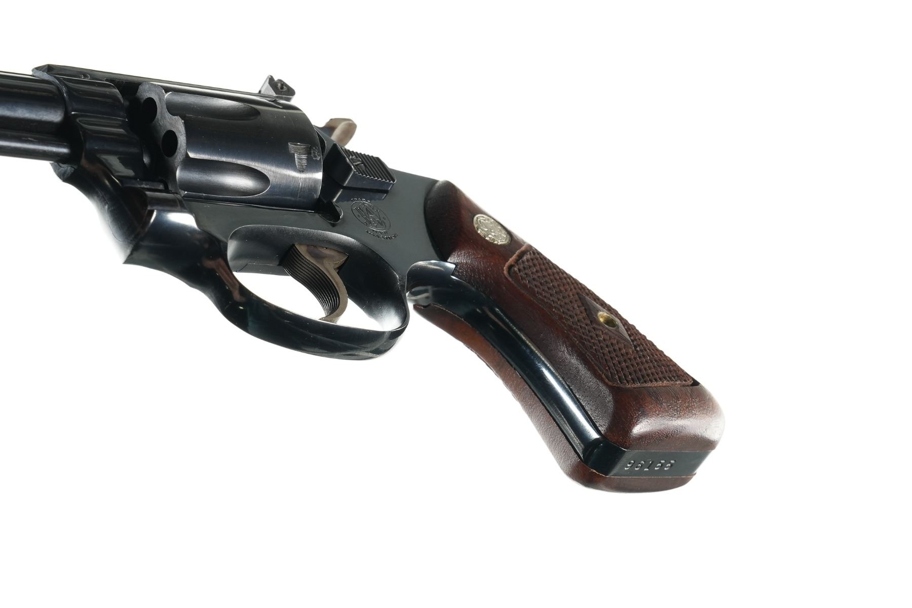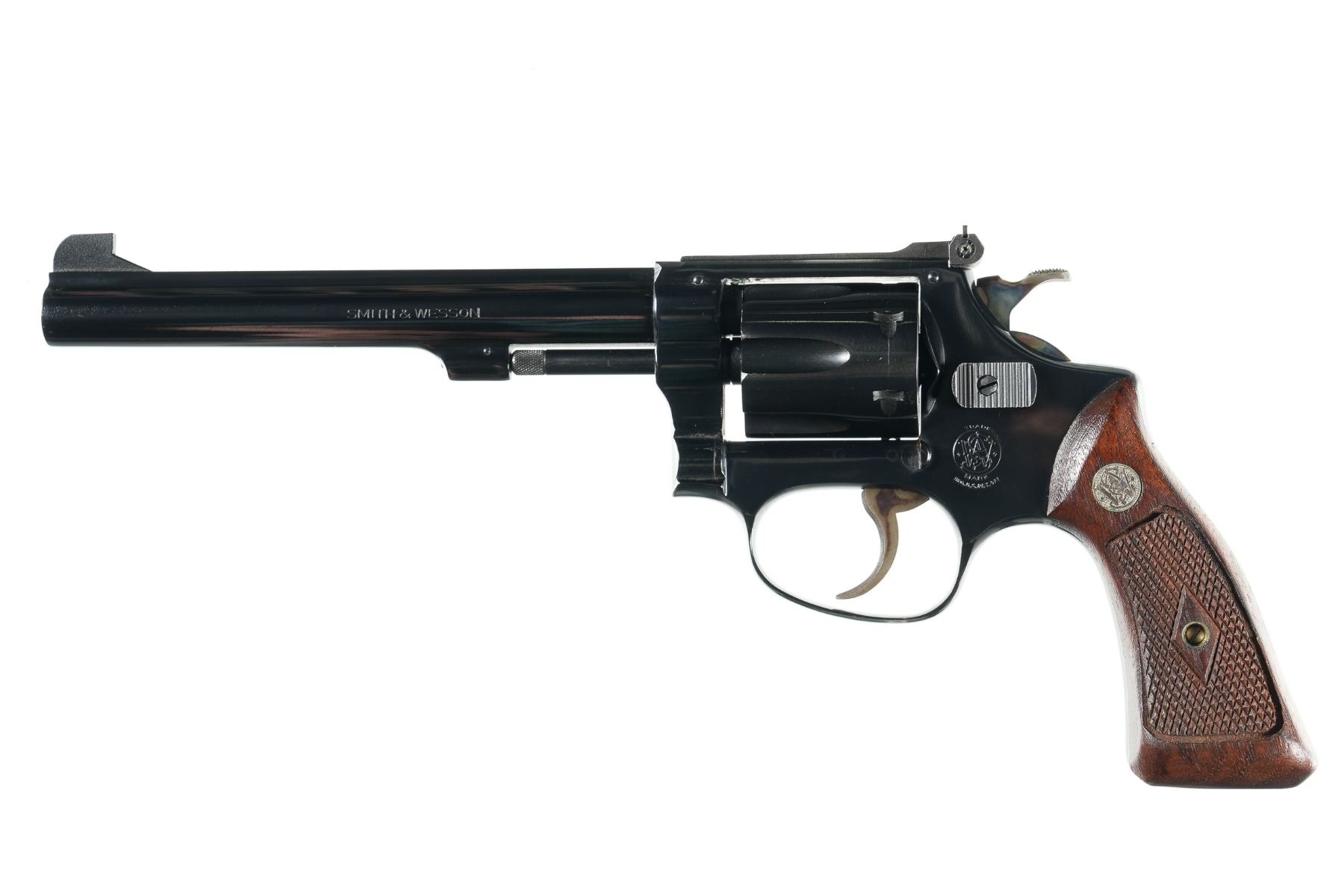 .22 lr Serial # 96155 Smith & Wesson Model 35-1 22 Kit Gun with 6" Bbl 22 LR with flat latch release. Adjustable sights and diamond square frame grips. Condition. Very fine with over 98% finish , bright bore and mechanically fine. Barrel 6" C&R