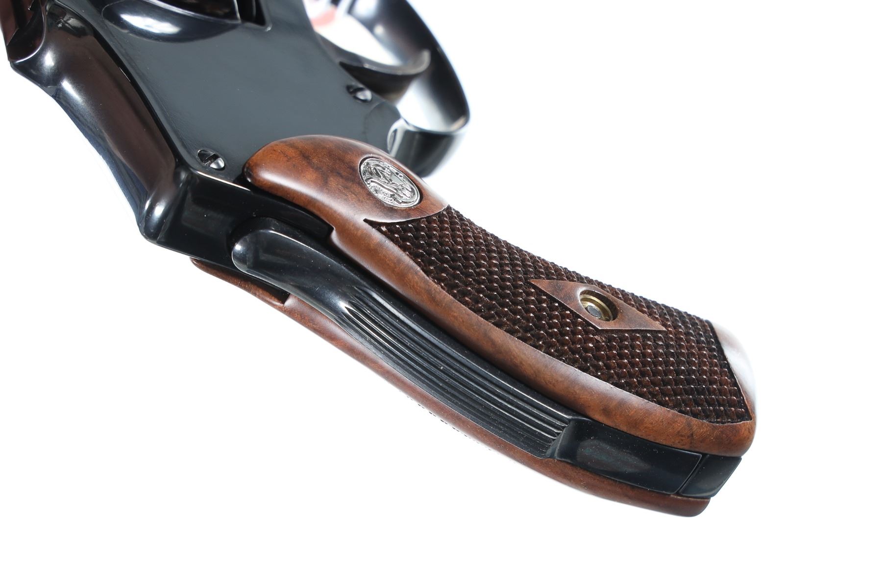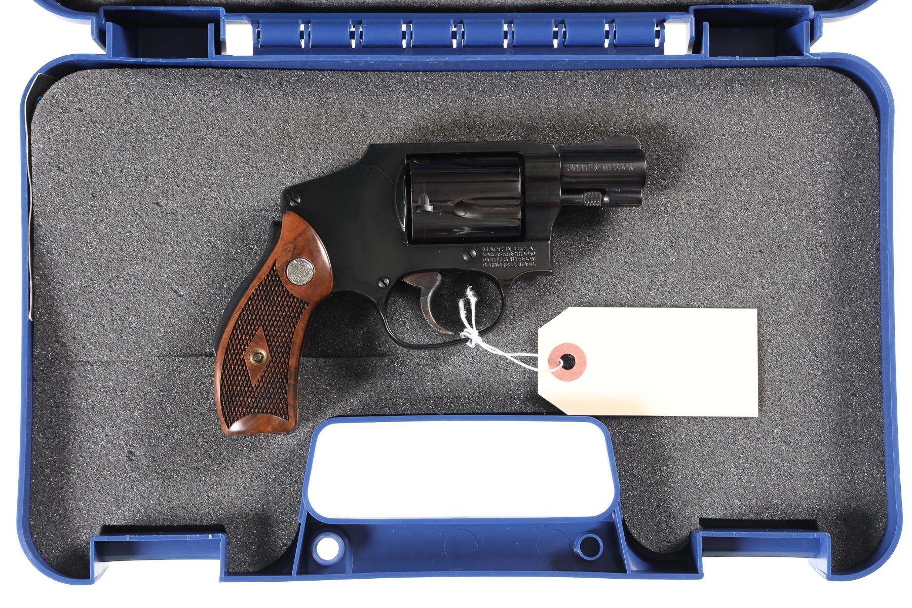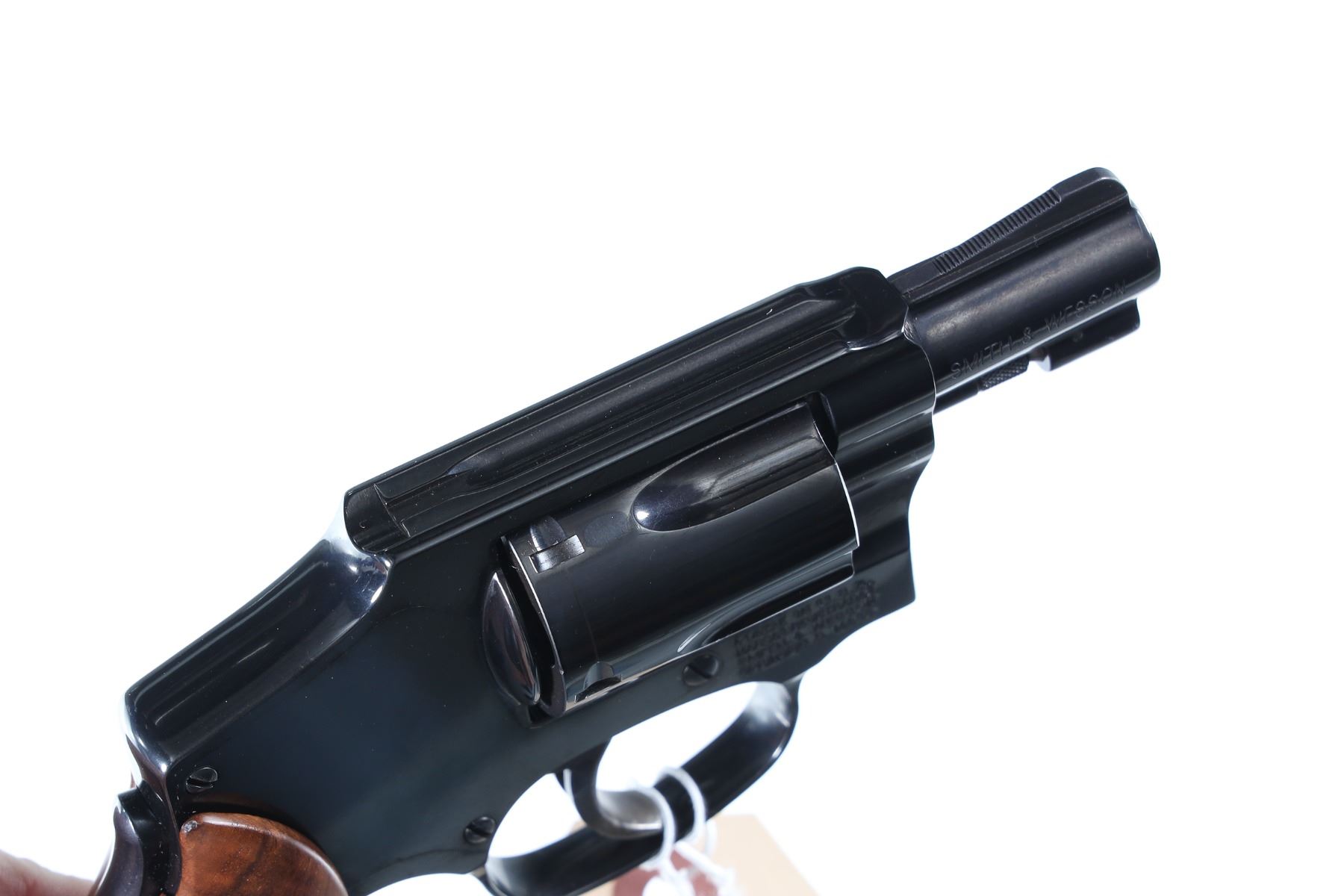 .38 spl+p Serial # DBH6673 Smith & Wesson Model 40-1 2" Bbl, Blue finished J-Frame with grip safety and internal hammer. Factory diamond pattern walnut grips with case colored trigger. Includes unnumbered factory box. Condition Very fine with slight wear on ejector rod and a small cylinder turn line Very fine overall with bright bore and chambers. Barrel 2" Modern