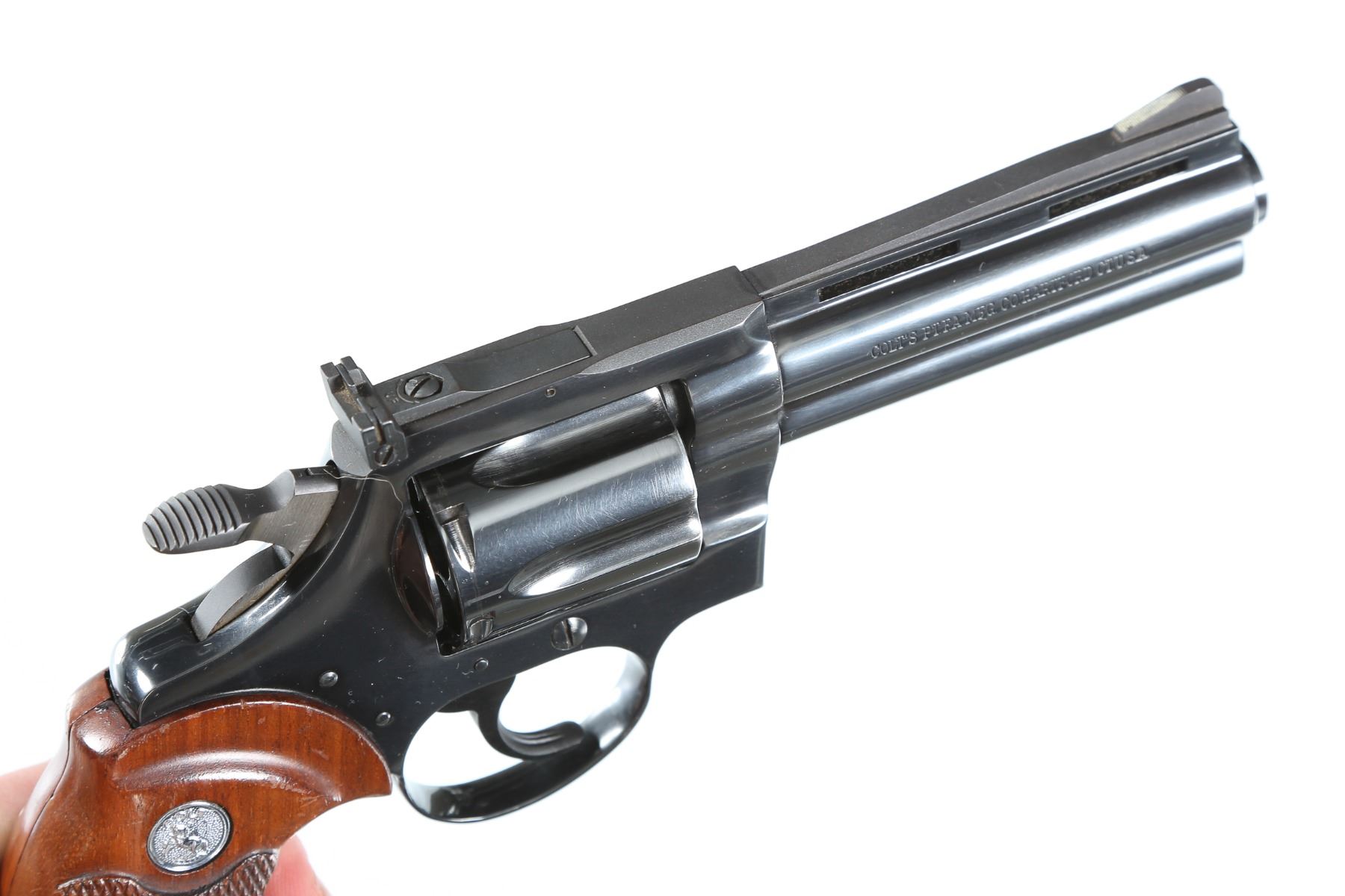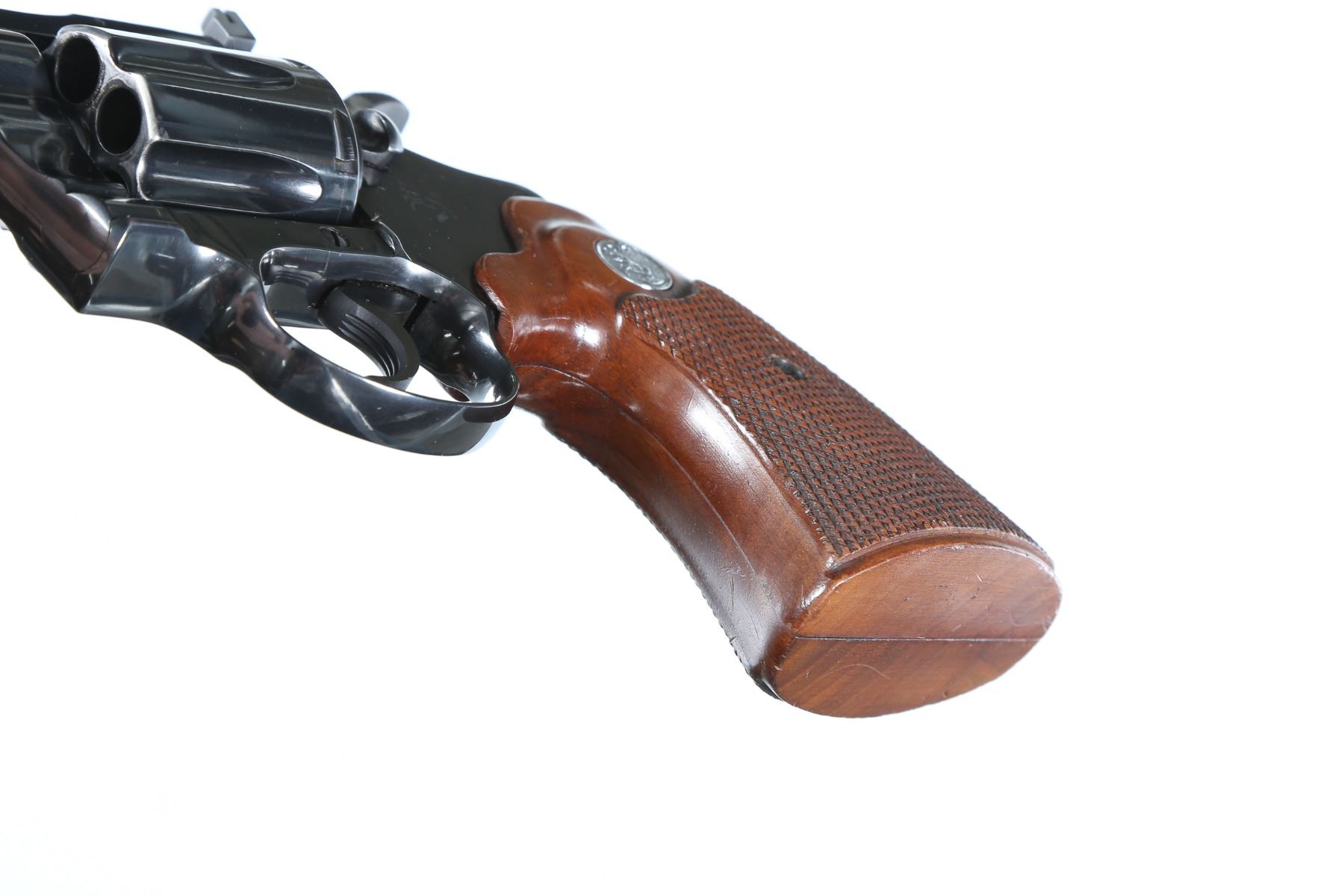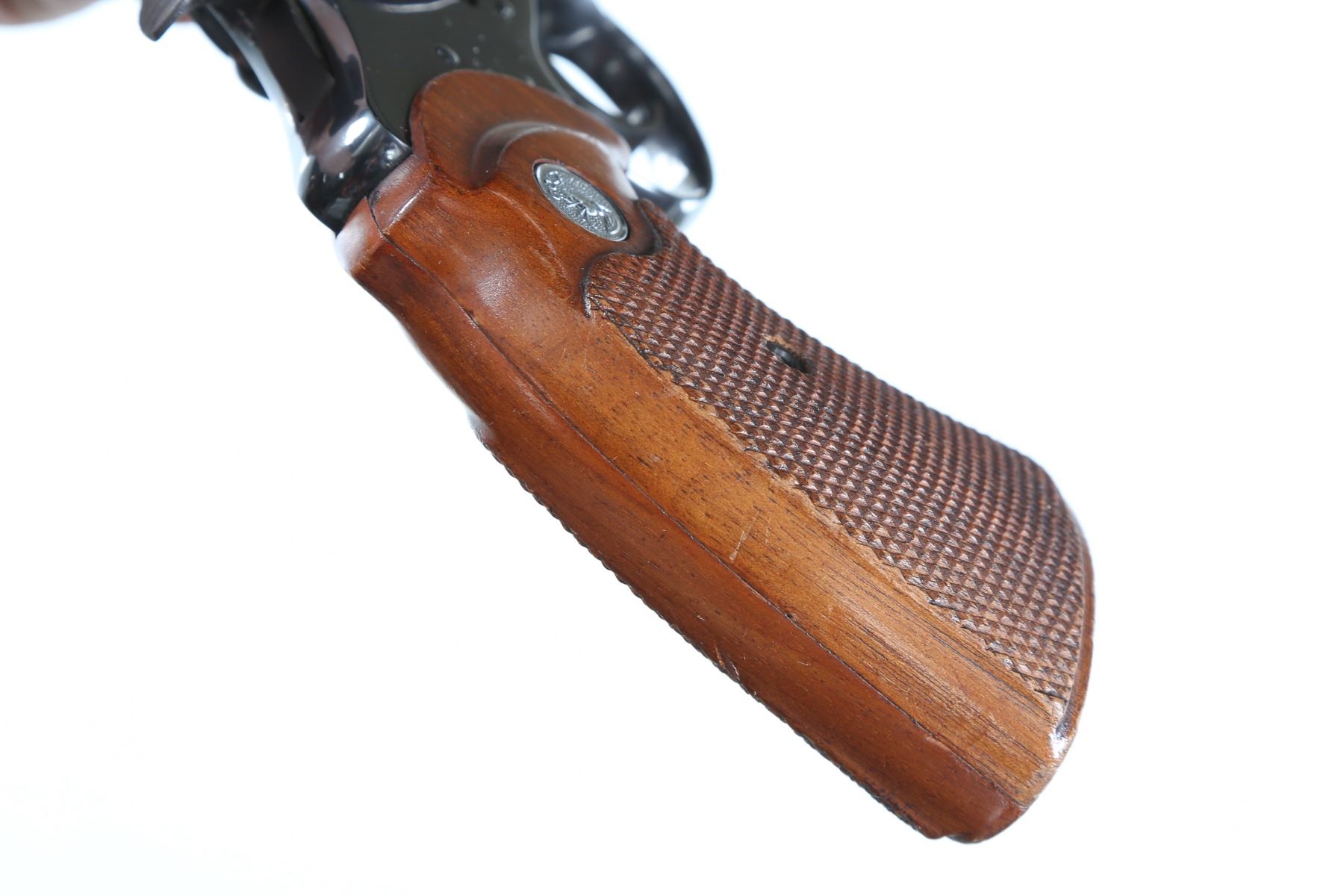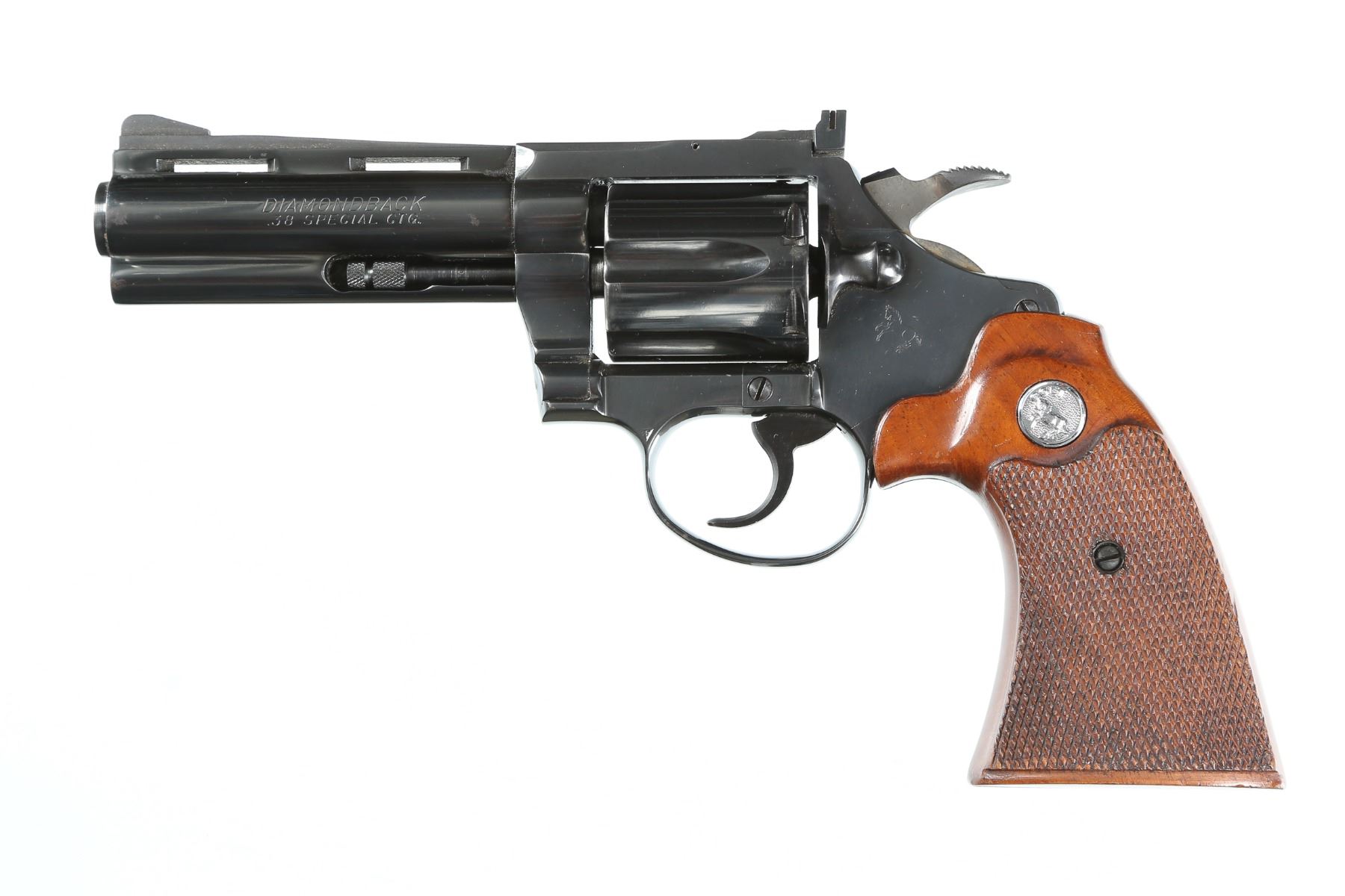 .38 spl Serial # D38339 Colt Diamondback .38 Special revolver with 4" vent rib full lugged Bbl with adjustable sights. Blue finish with Colt checkered walnut target stocks with Rampant Colt medallions. Mfg. 1969. Assembled using the D-Frame with 6 shot fluted swing out cylinder. Condition, Very fine with over 98% blue finish remaining with bright bores and chambers. Mechanically fine. Barrel 4" Modern
