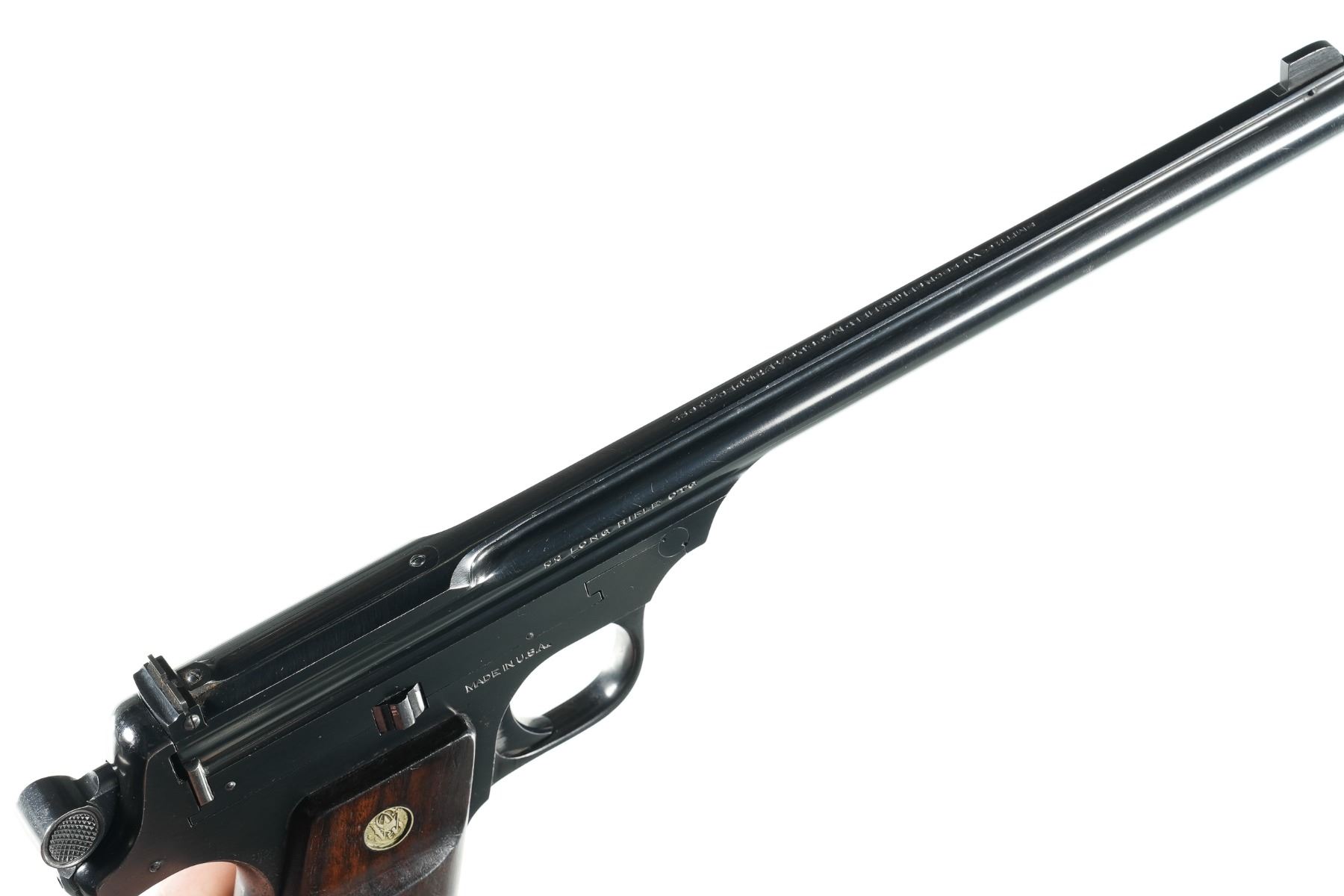 .22 lr Serial # 1356 Smith & Wesson Straight line 22 LR single shot target pistol Number 1356 10" Bbl with factory metal case. Condition Pistol is very fine with bright bore and retaining over 90% finish with losses at grip straps. Operates properly. Case is oxidized and lining is distressed. Barrel 10" C&R