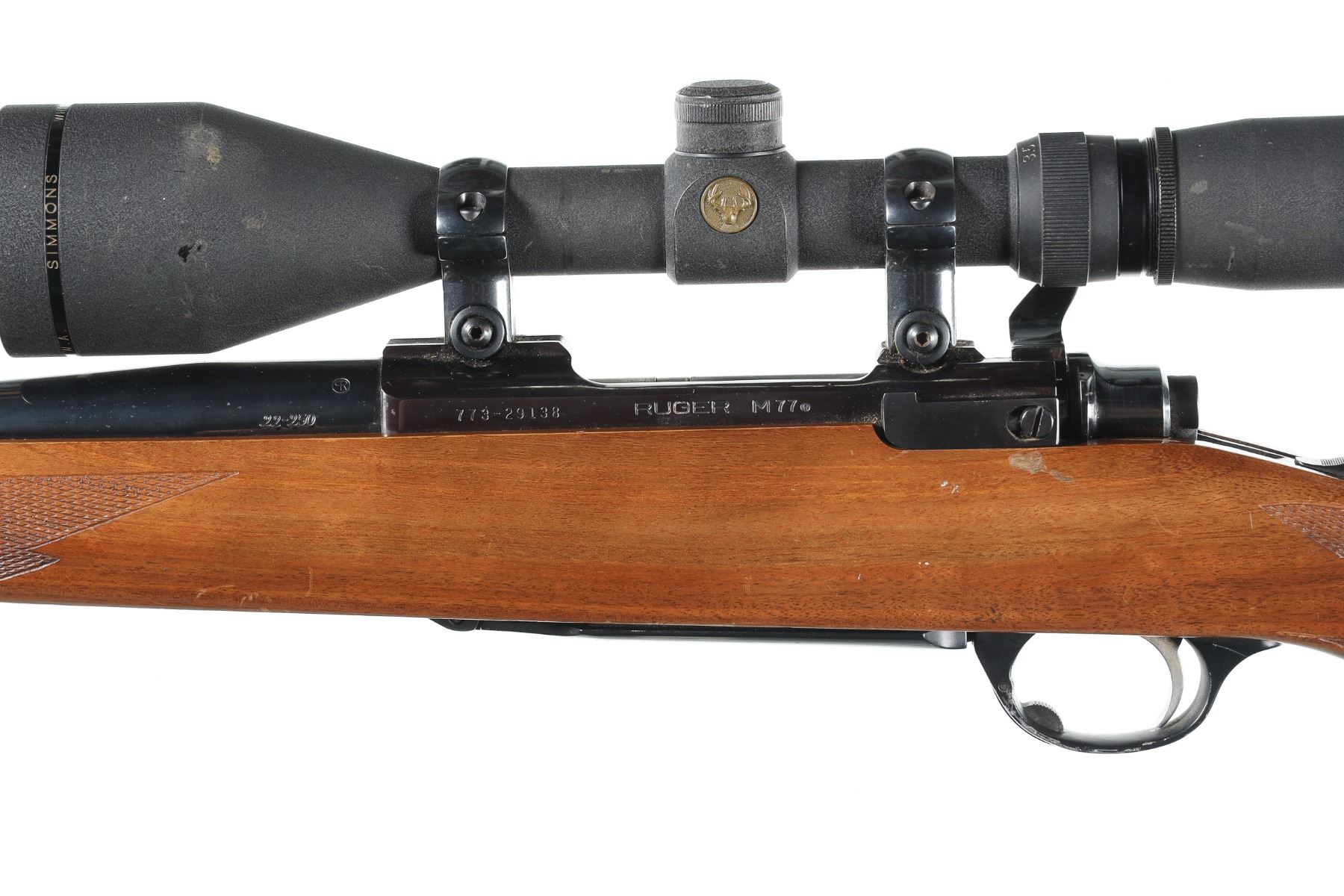 .22-250 Serial # 773-29138 Ruger M77 22 -250 with 22" Bbl varnished walnut stock mounted with Simmons 4.5-10 variable scope with Ruger rings. Tang safety Mfg 1991. Condition. Very good with excellent bore and mechanically excellent. Optic are clear. Barrel 22" 1991 Modern