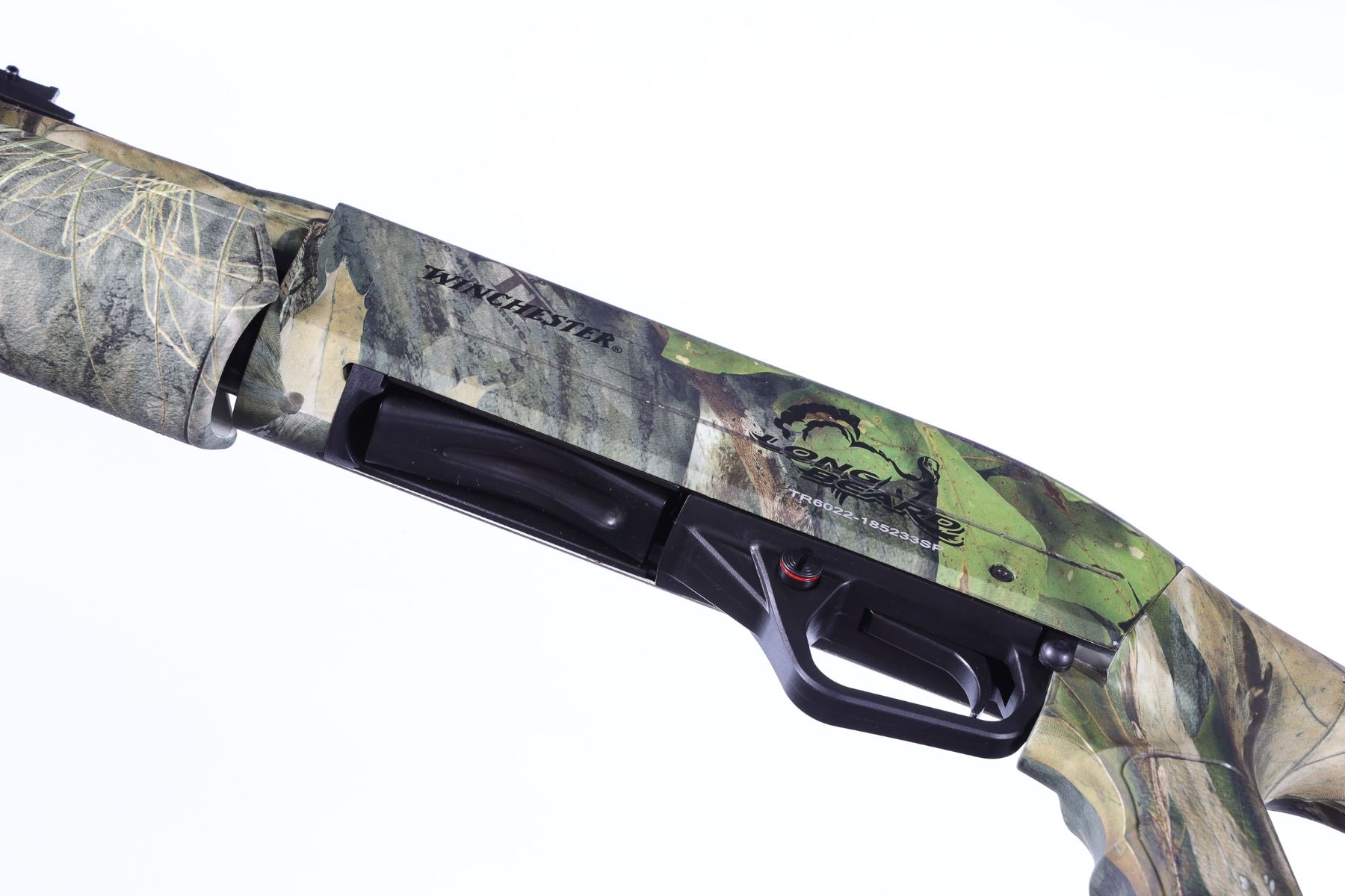 12ga Serial # TR6022-185233SP Winchester Super X 12 Ga Pump with 3" chamber Invector Plus extended Turkey choke. (Long Beard Edition) with adjustable comb pistol grip stock with factory camo finish with adjustable fiber optic sights. As new with factory box numbered to gun. 3" chamber, Winchester Long Beard Turkey XF screw in choke. Barrel 24" Modern