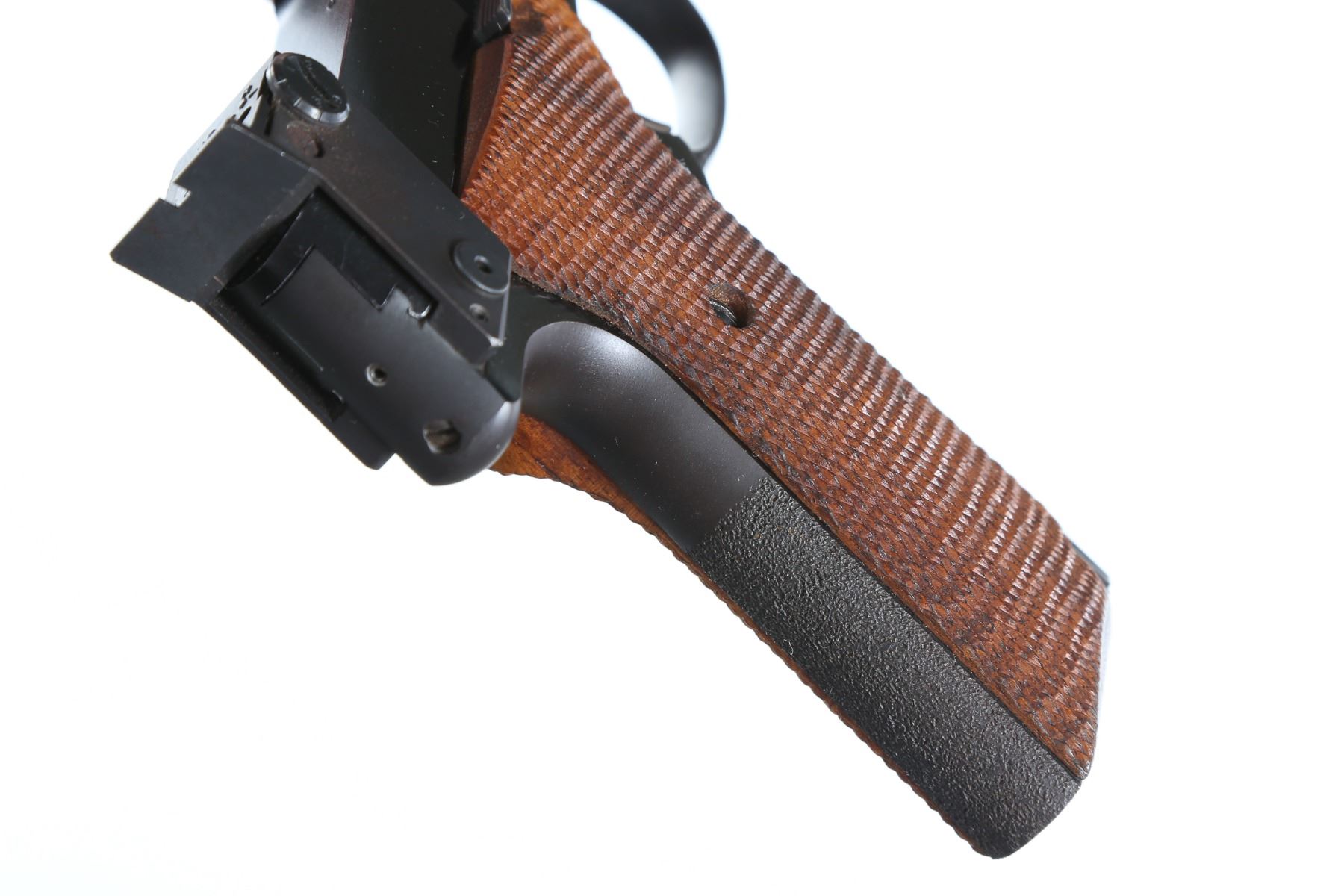 .22 short Serial # 2086431 High Standard Olympic Military .22 Short Space pistol with 6 3/4" compensated Bbl with weights. Adjustable sights and thumb rest checkered walnut grips. Condition, Fine with some exterior finish wear and retaining over 97% blue. Excellent bore and mechanically fine. Barrel 6 3/4" C&R