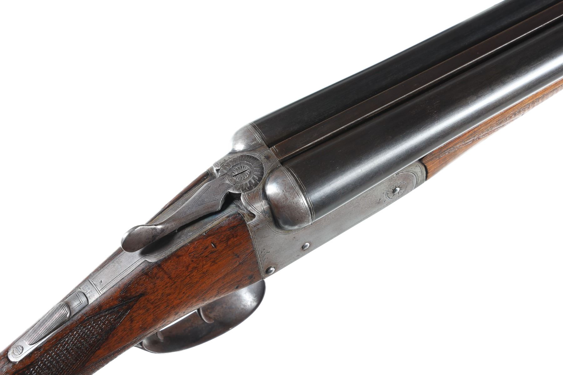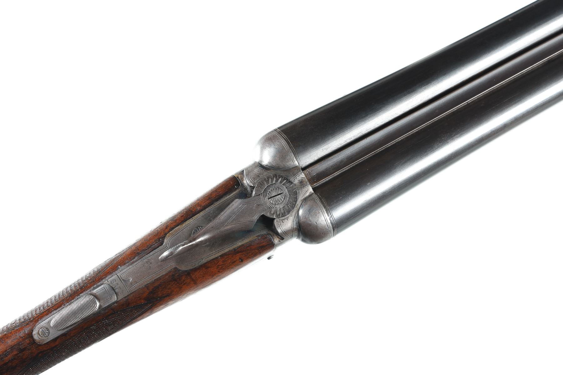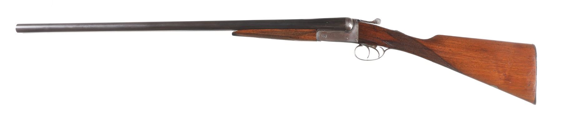12ga Serial # 151551 Midland English Box lock double 12 Ga, 2 1/2" chambers Barrels choked Full & IC with double triggers and lifter extractors. 14" LOP. Condition. Very good overall with faded blue finish on Bbl's. Receiver remains bright. Mechanically fine. Stocks have impressions and moderate wear. Barrel 28" 1923 C&R
