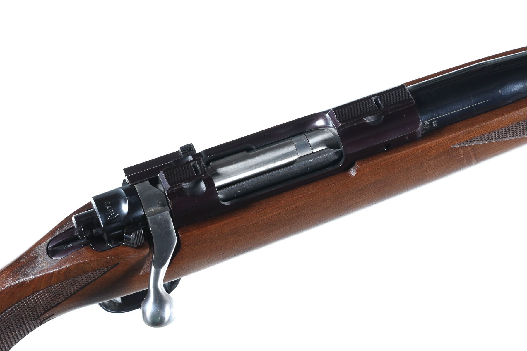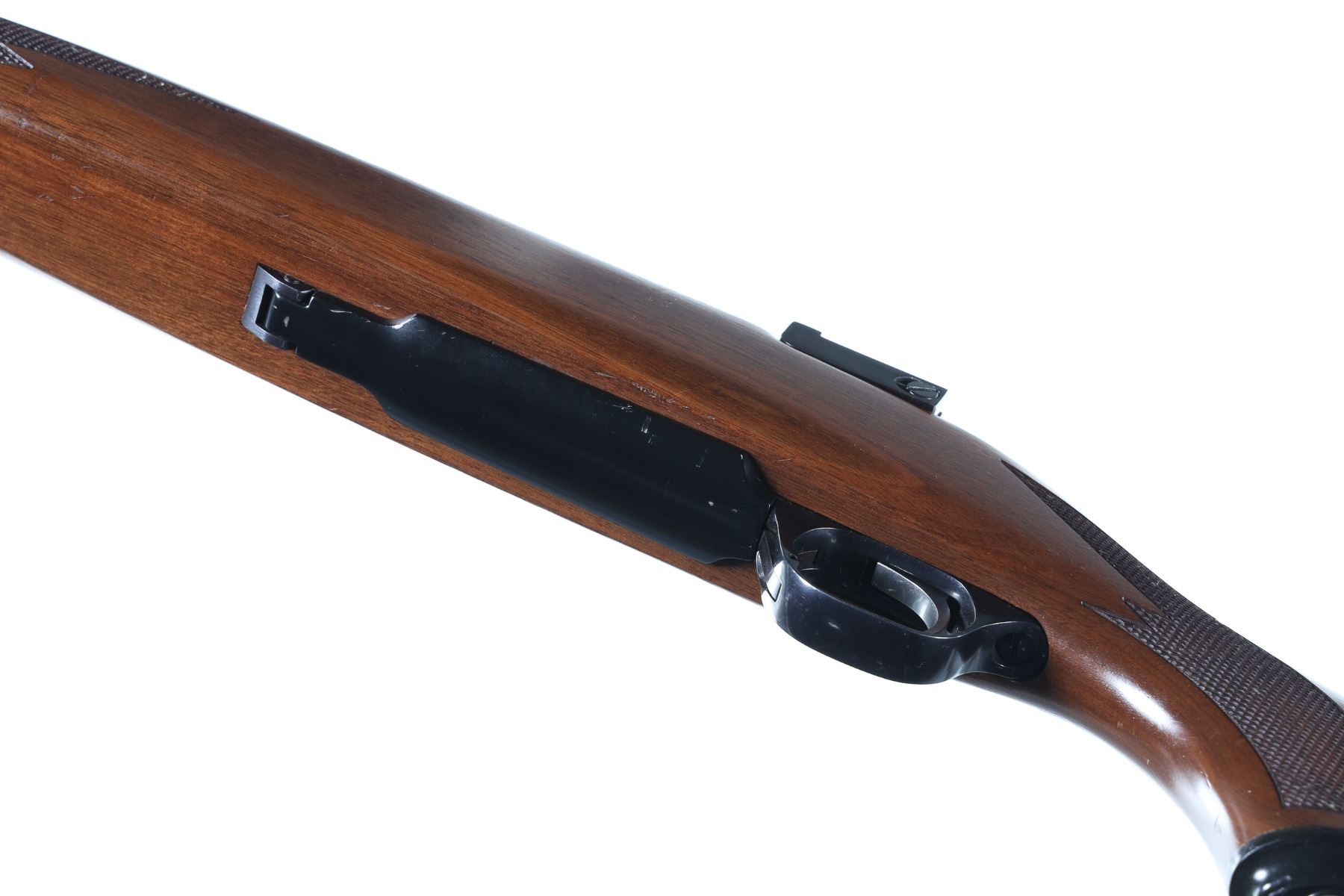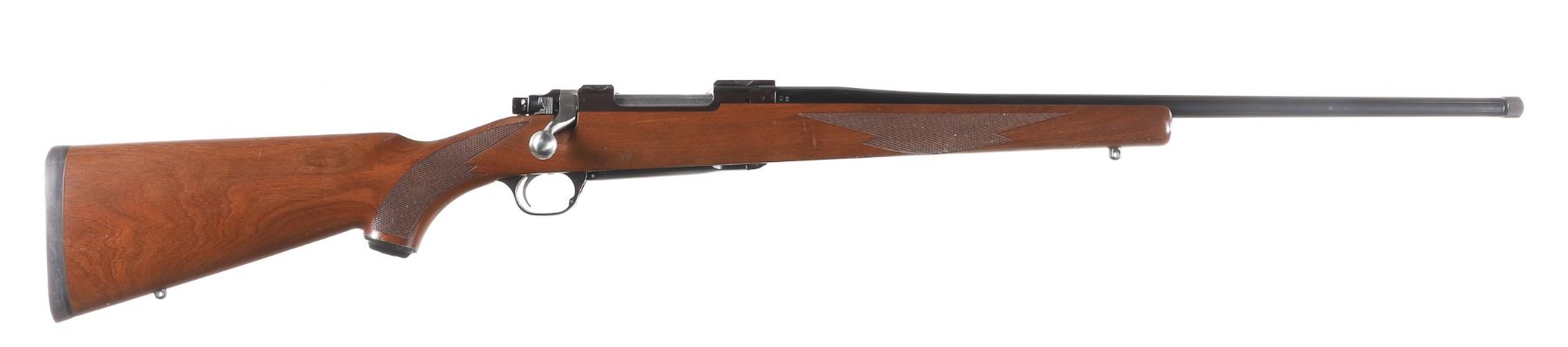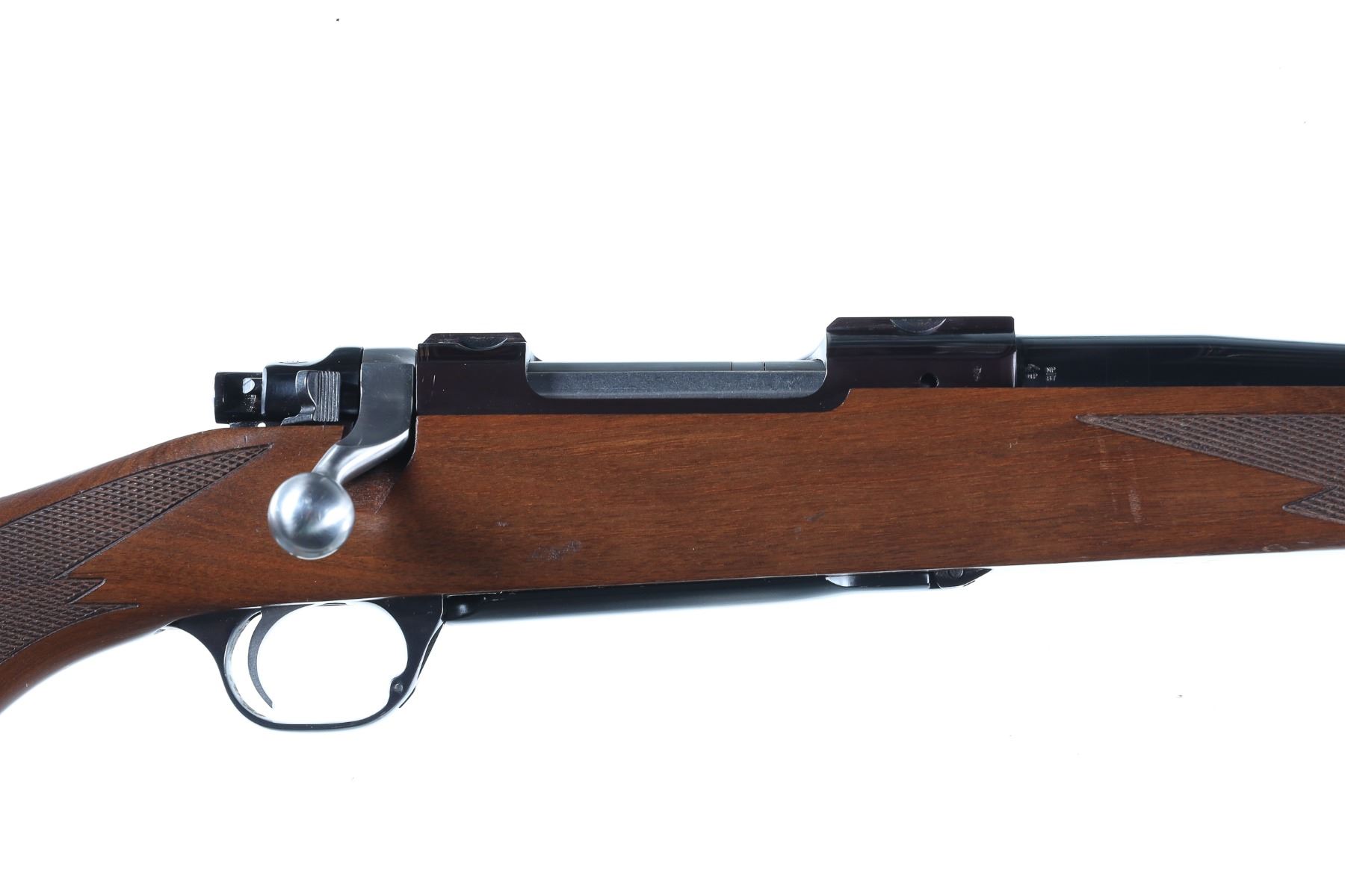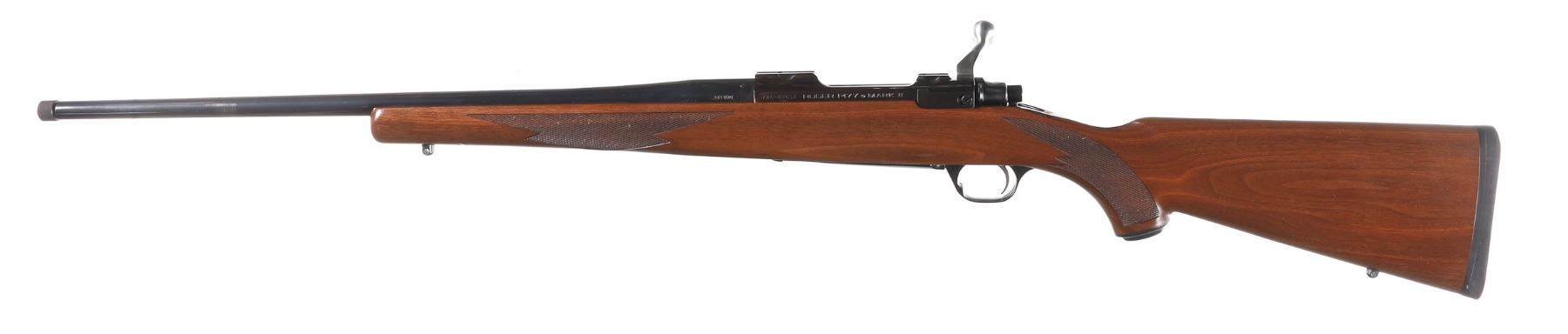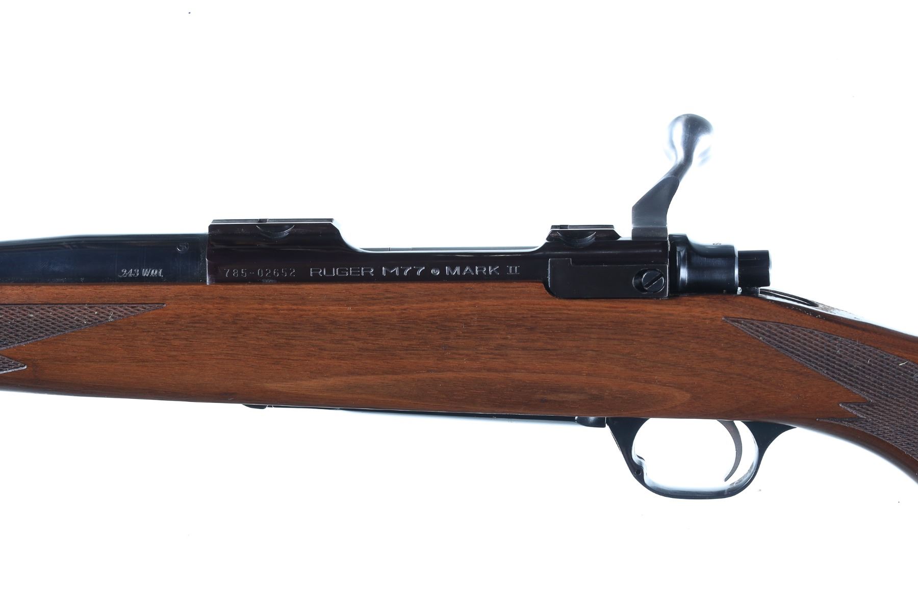 .243 Win Serial # 785-02652 Ruger M77 Mark II cal 243 Winchester with varnished walnut stock and black factory recoil pad . Drop magazine floor plate and threaded muzzle. Condition. 14" LOP Very fine overall with bright bore and excellent mechanics. Slight finish loss at muzzle from suppressor use. Barrel 22" 1997 Modern