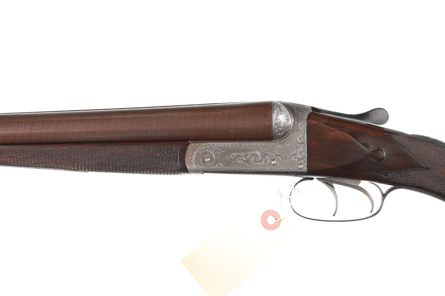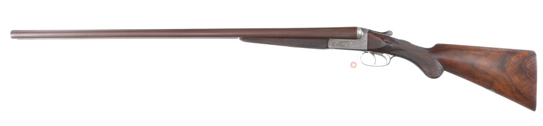 12ga Serial # 32414 Wonderful hammerless damascus nitro proved 12 bore double with 2 2/3" proofed Bbl choked IC / Mod. Double trigger with ejectors. 14" LOP 1 1/2DAC 2" DAH. Condition Suberb as English refinished with brilliant bores. Tight lock-up and outstanding walnut stocks. Mechanically excellent. Mfg in 1901 Barrel 30" C&R