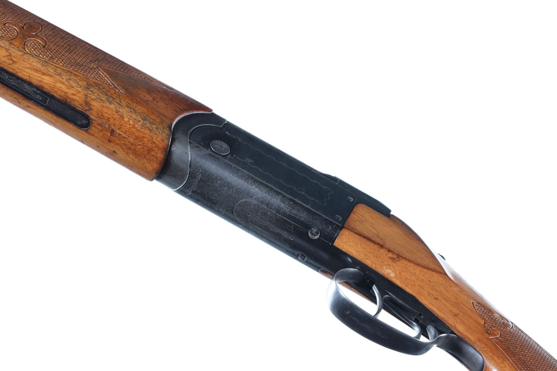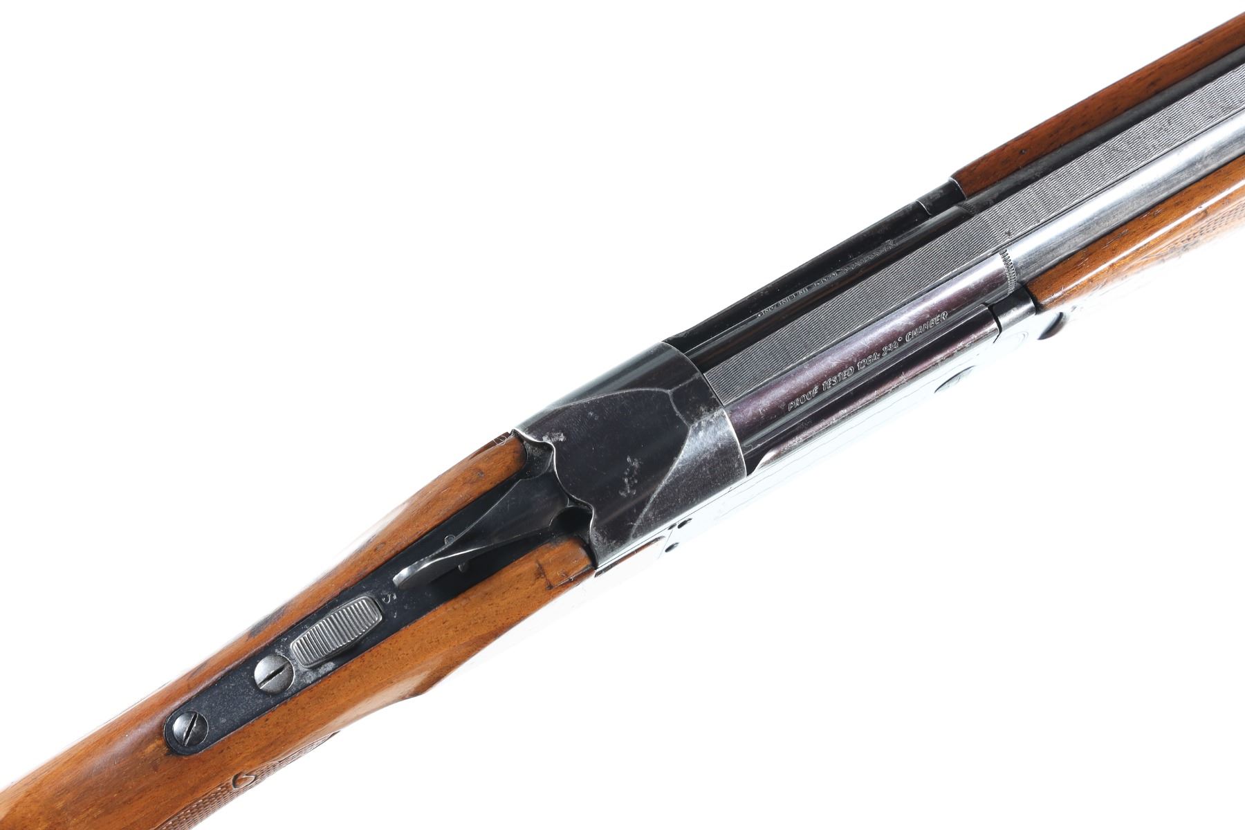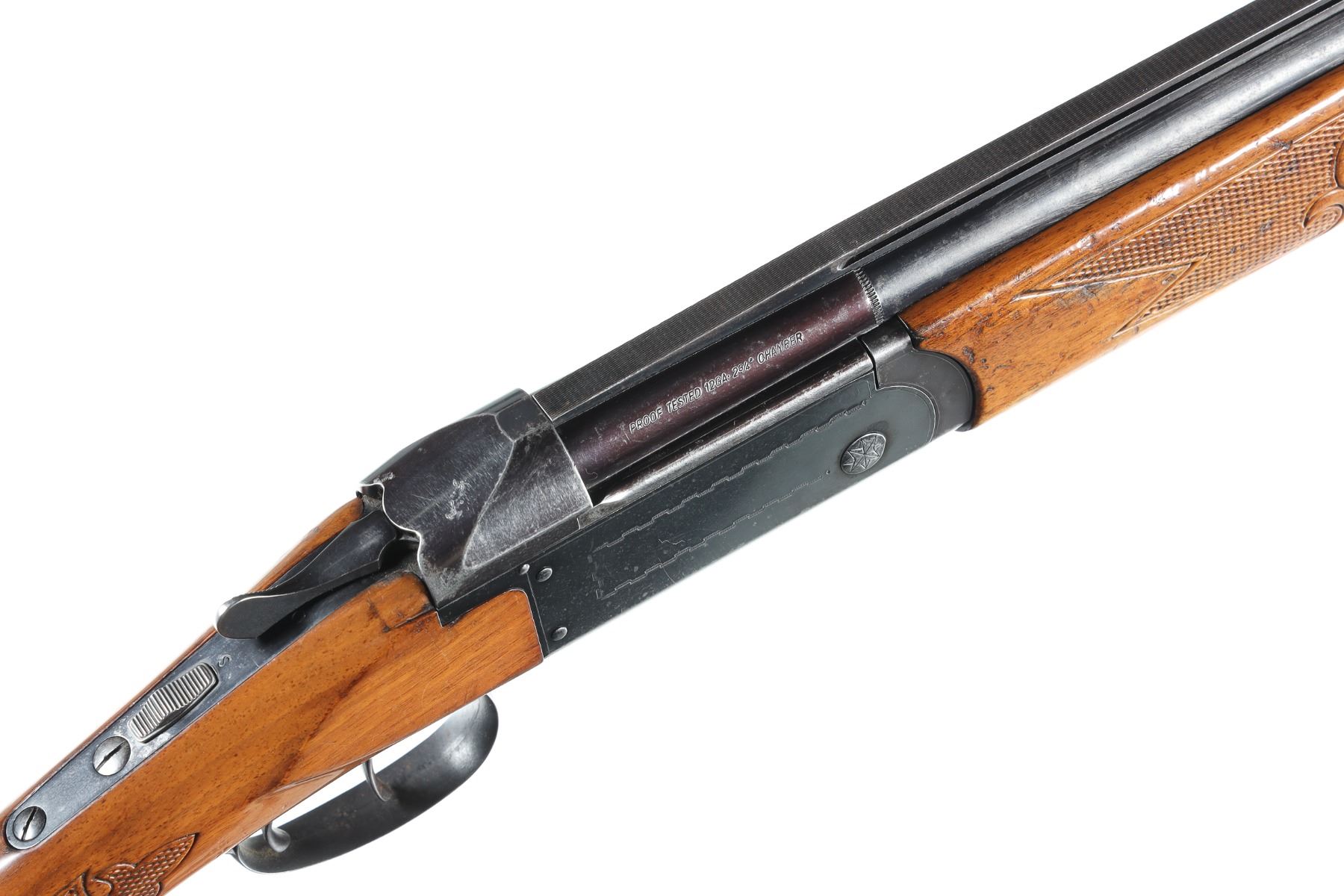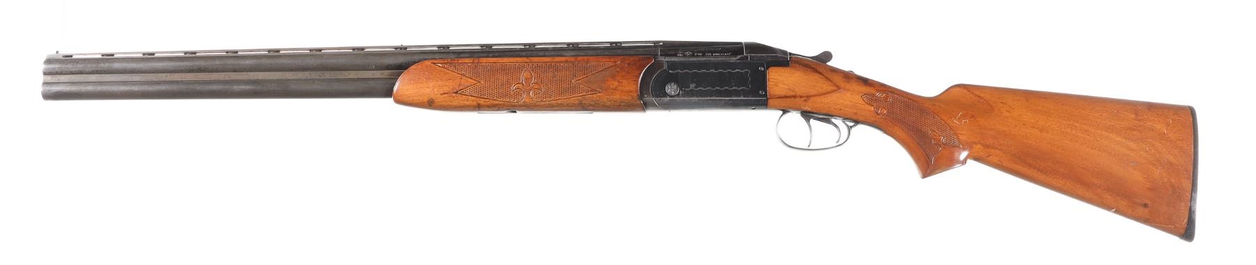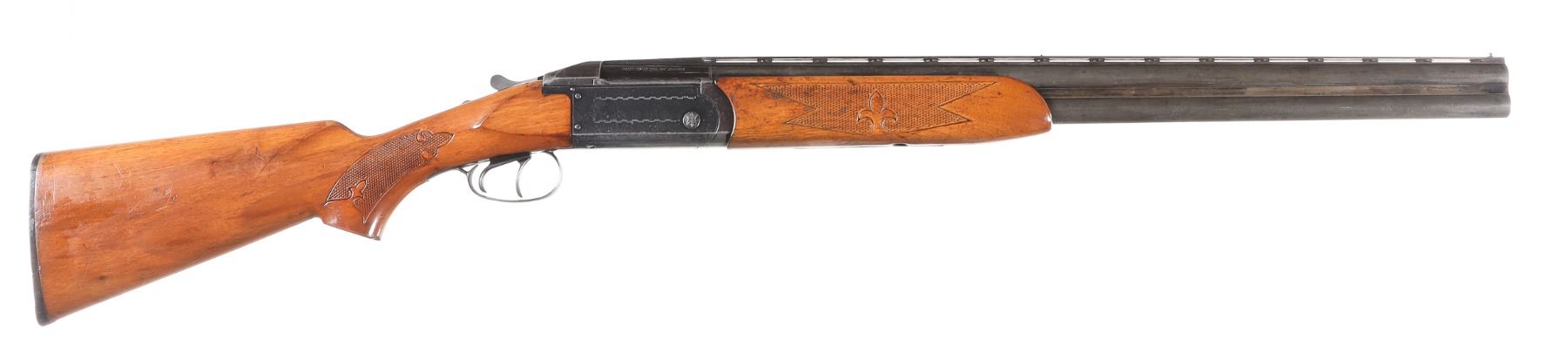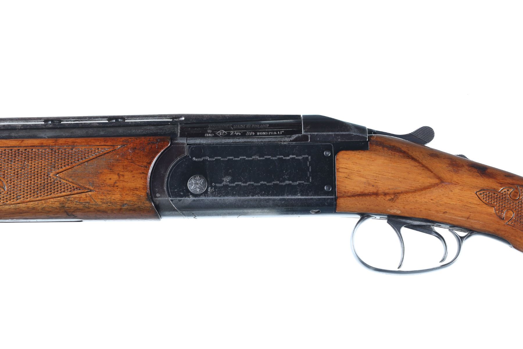 12ga Serial # 47417 Finnish Valmet over under 12 Ga. shotgun with 2 3/4" chamber and choked IC & Mod with lifter extractor and double triggers. Varnished wood stocks with factory butt plate. Condition. Good with 50% finish remaining balance toned to dove grey. Bright bores and mechanically fine. Barrel 26" 1970 C&R