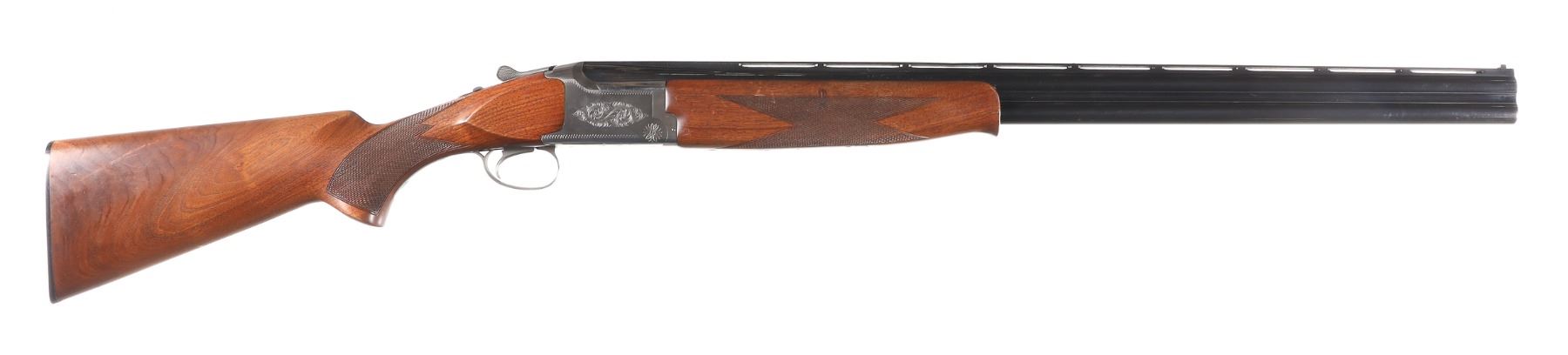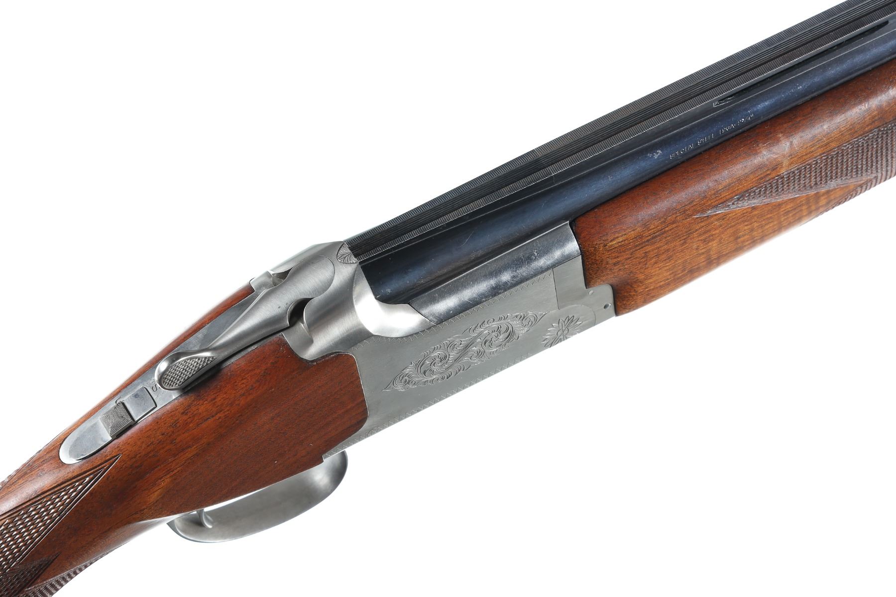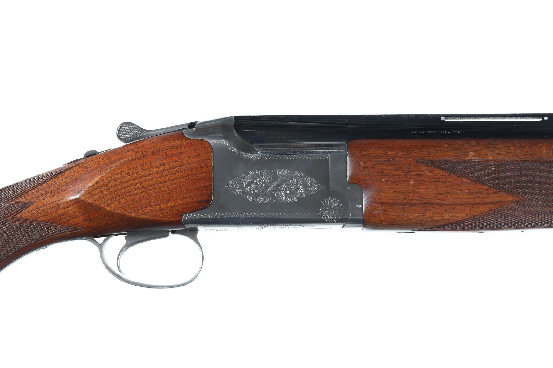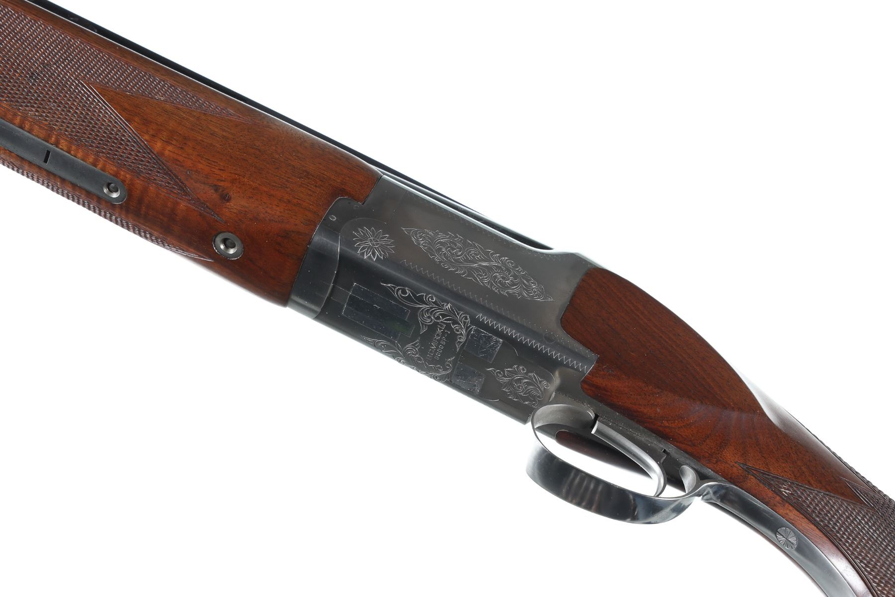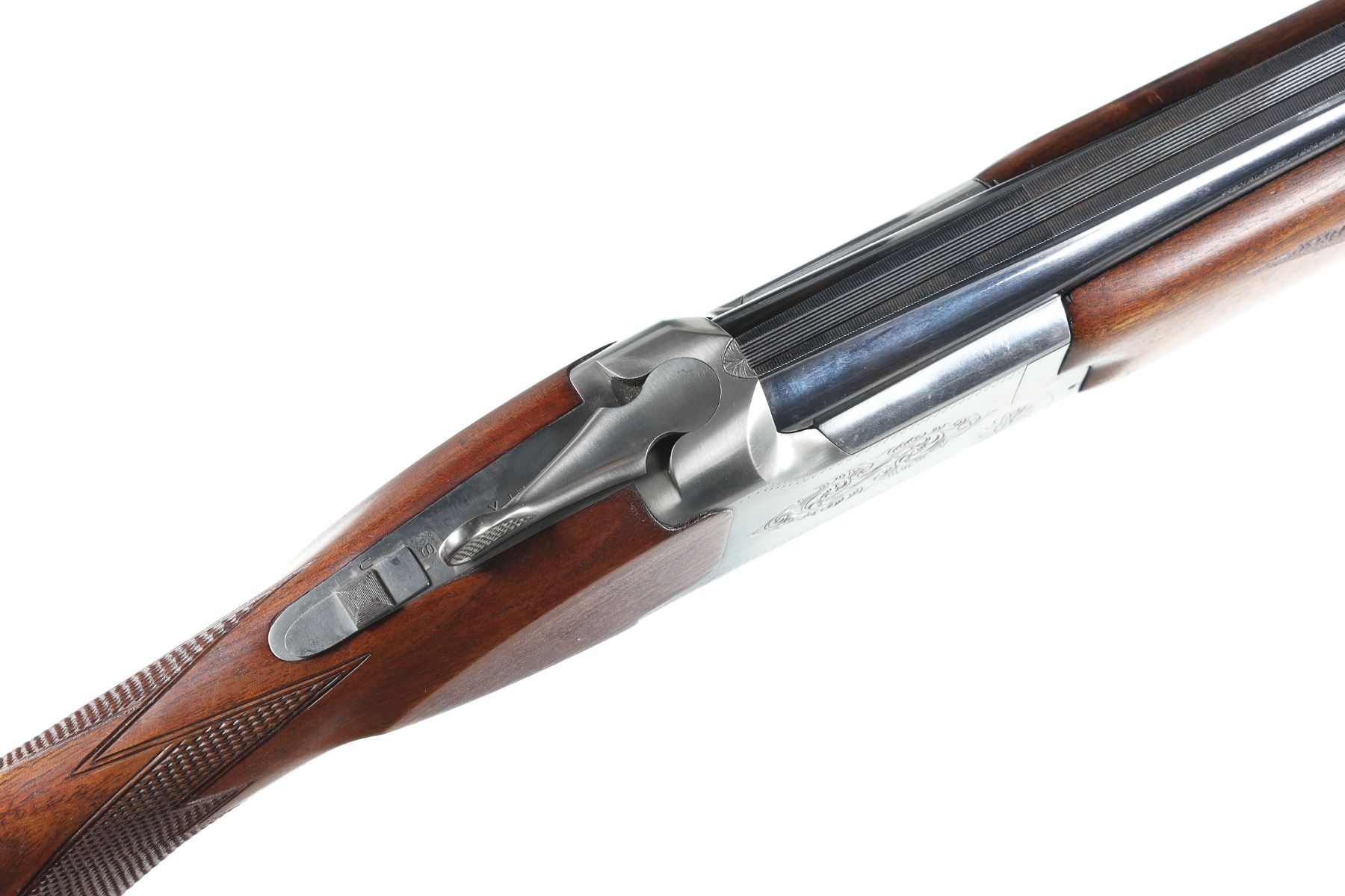 12ga Serial # 80362PX B.C Miroku 6000 SP over under 12 Ga with scroll engraved coin finished receiver. Choked Full & Mod with 2 3/4" chambers. Single selective trigger with ejectors. 14 1/4" LOP 1 1/2" DAC 2 1/5" DAH. Condition Very fine with some light finish loss at chamber and light oxidation marks on bbl. Bright bore. Receiver is excellent. stocks are very fine with light impressions. Barrel 29" 1983 Modern