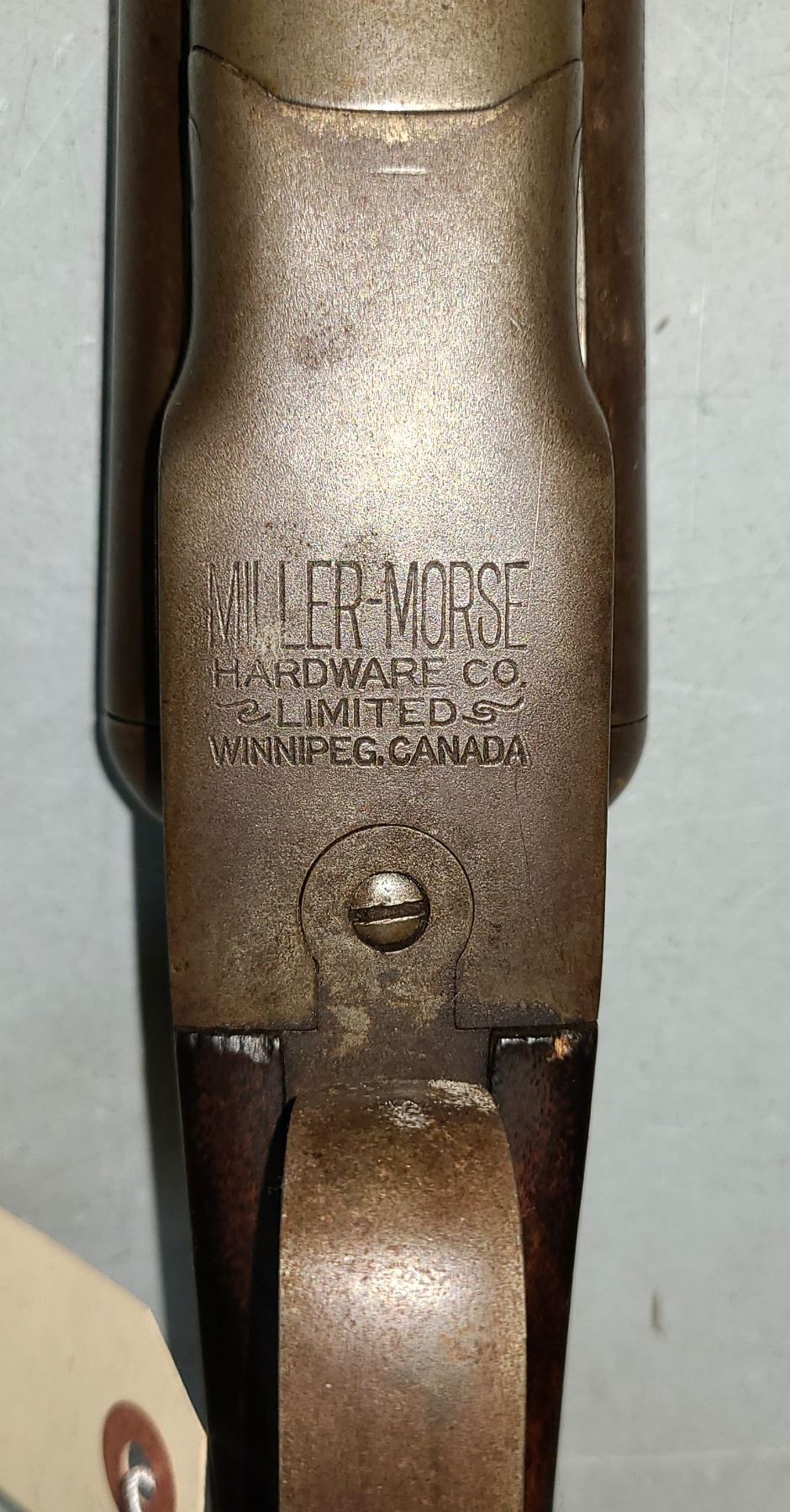 Miler Morse Hardware Co Winnipeg Canada is stamped undernear=th receiver on this interesting side by side Shotgun.