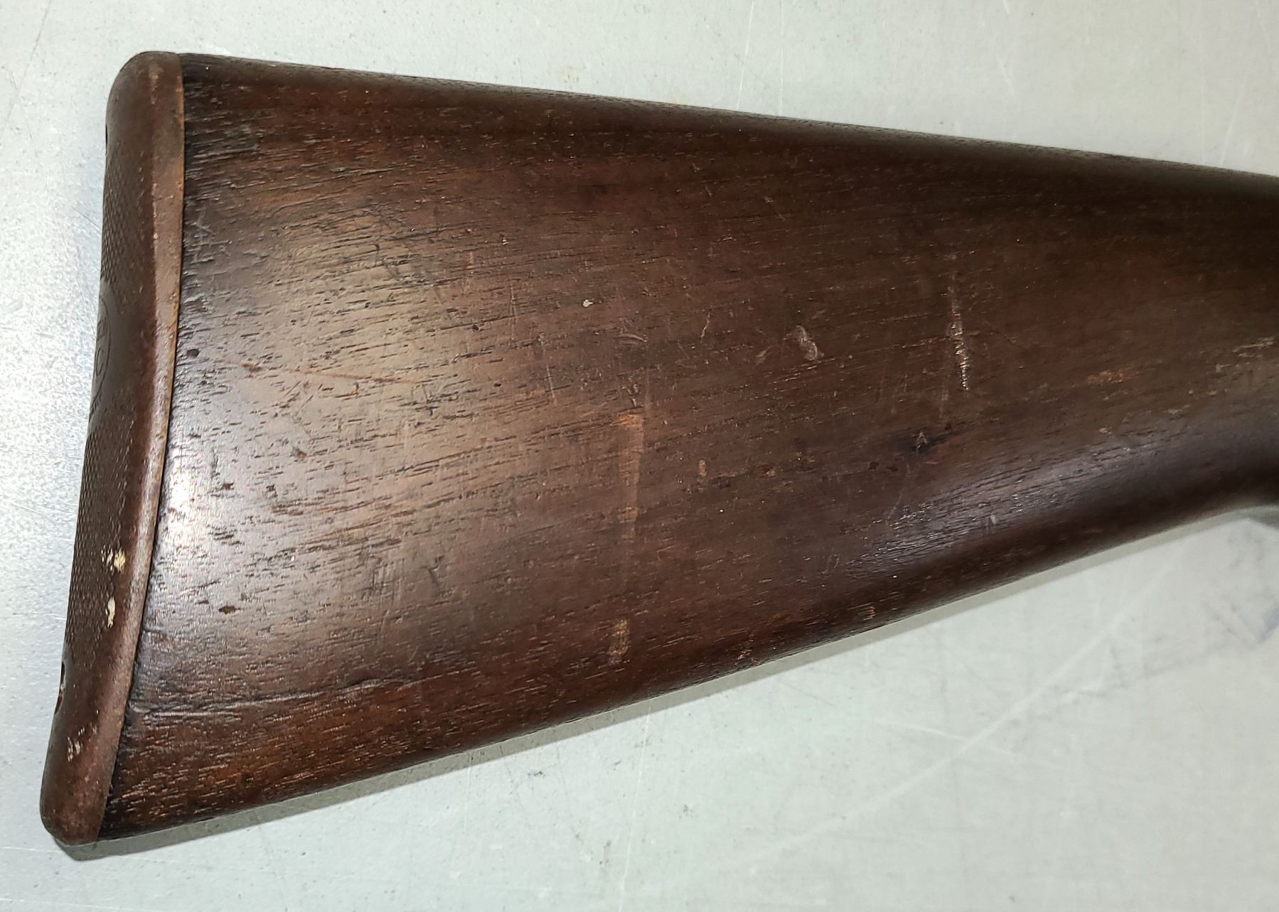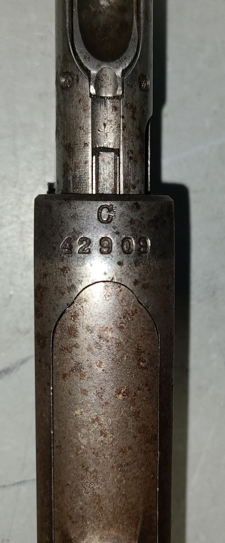 Barrel is 22 inch long.. Blued finish starting to fade with heavy speckling throughout..