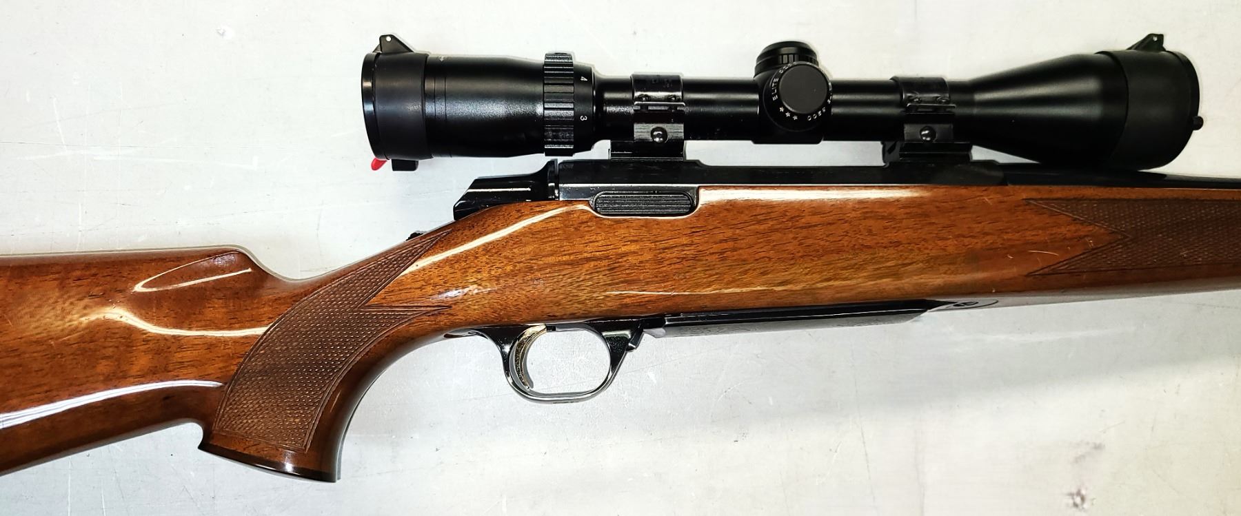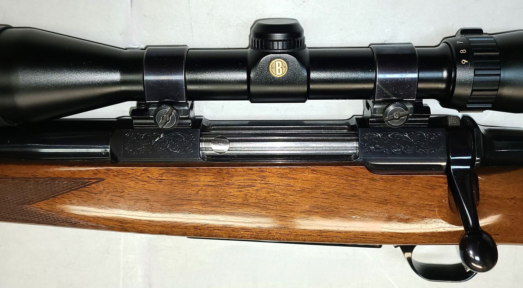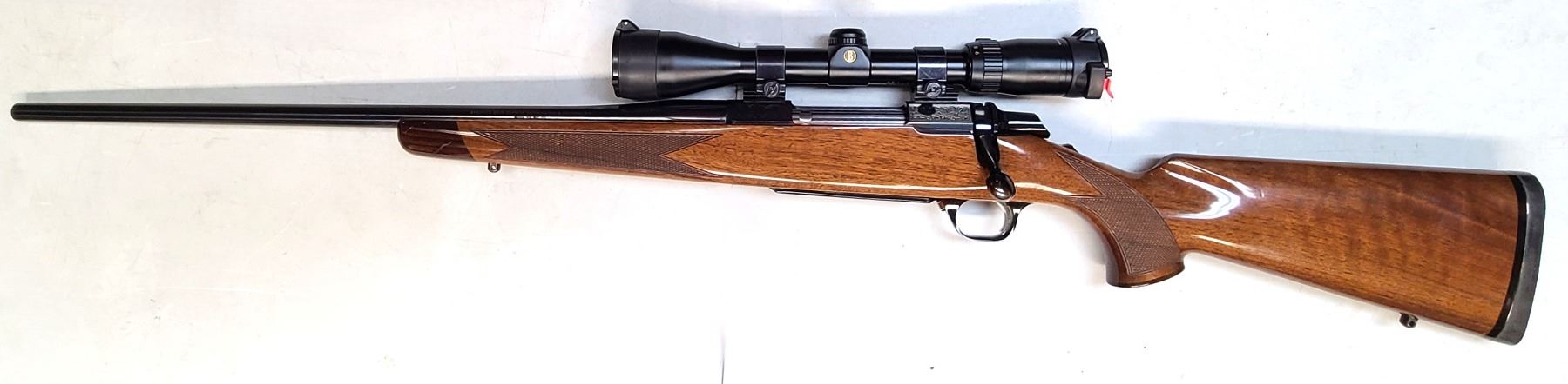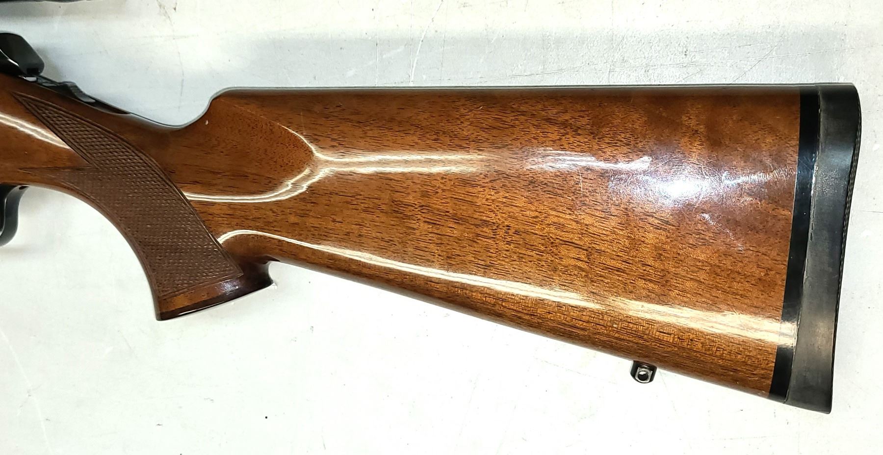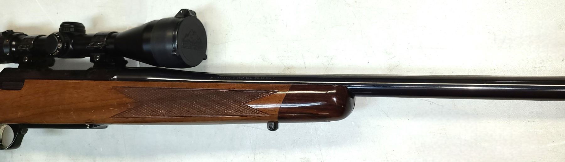 The rifle has a gloss-finish walnut stock with a rosewood grip and fore-end cap.