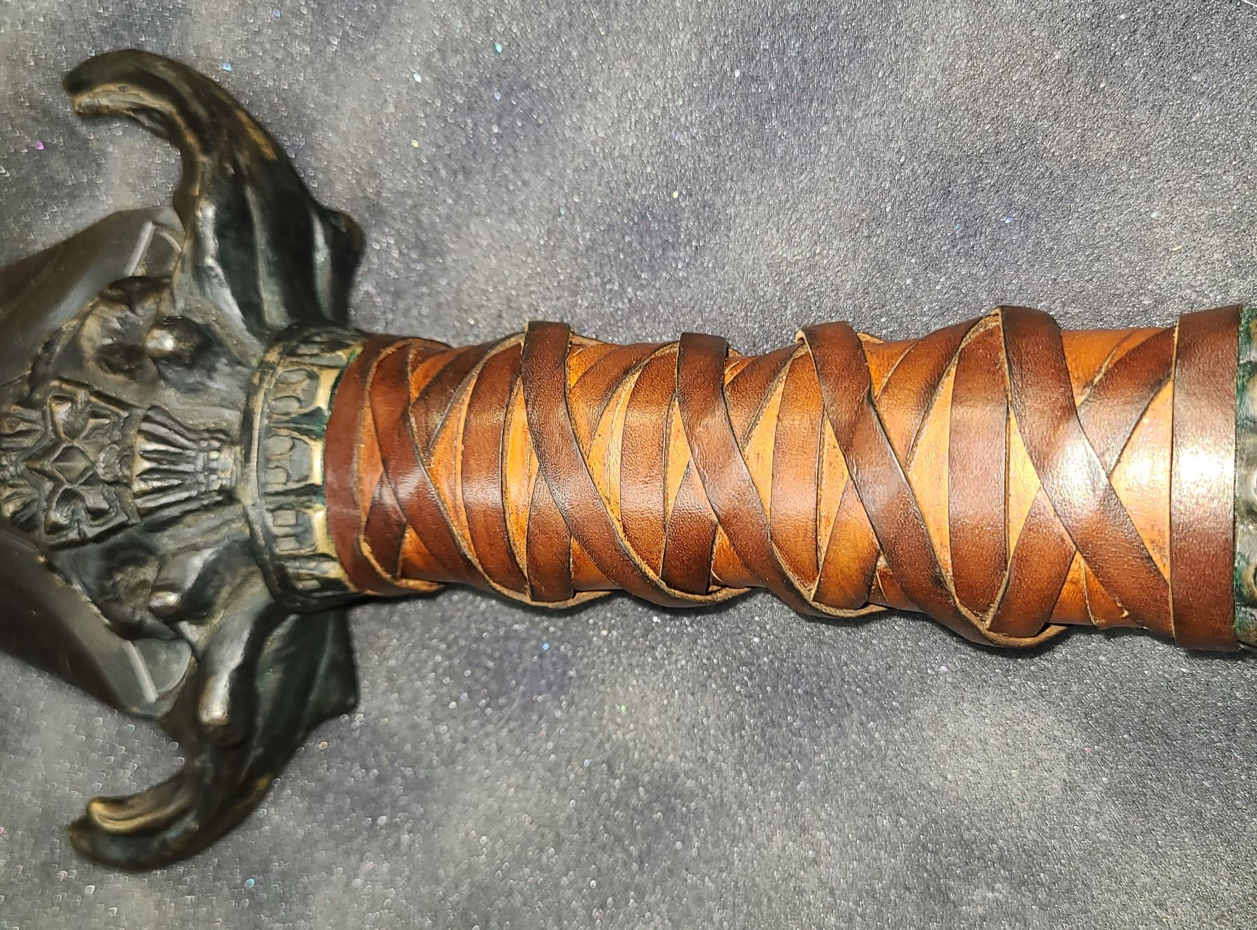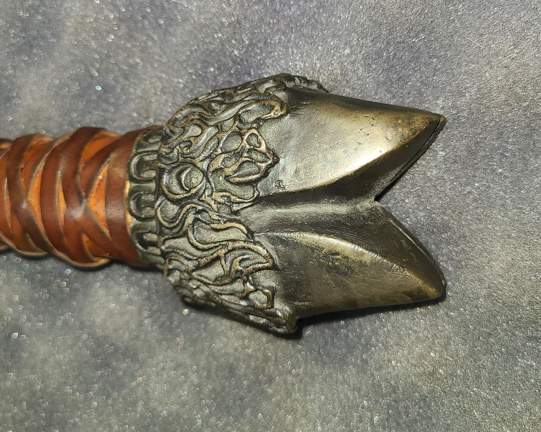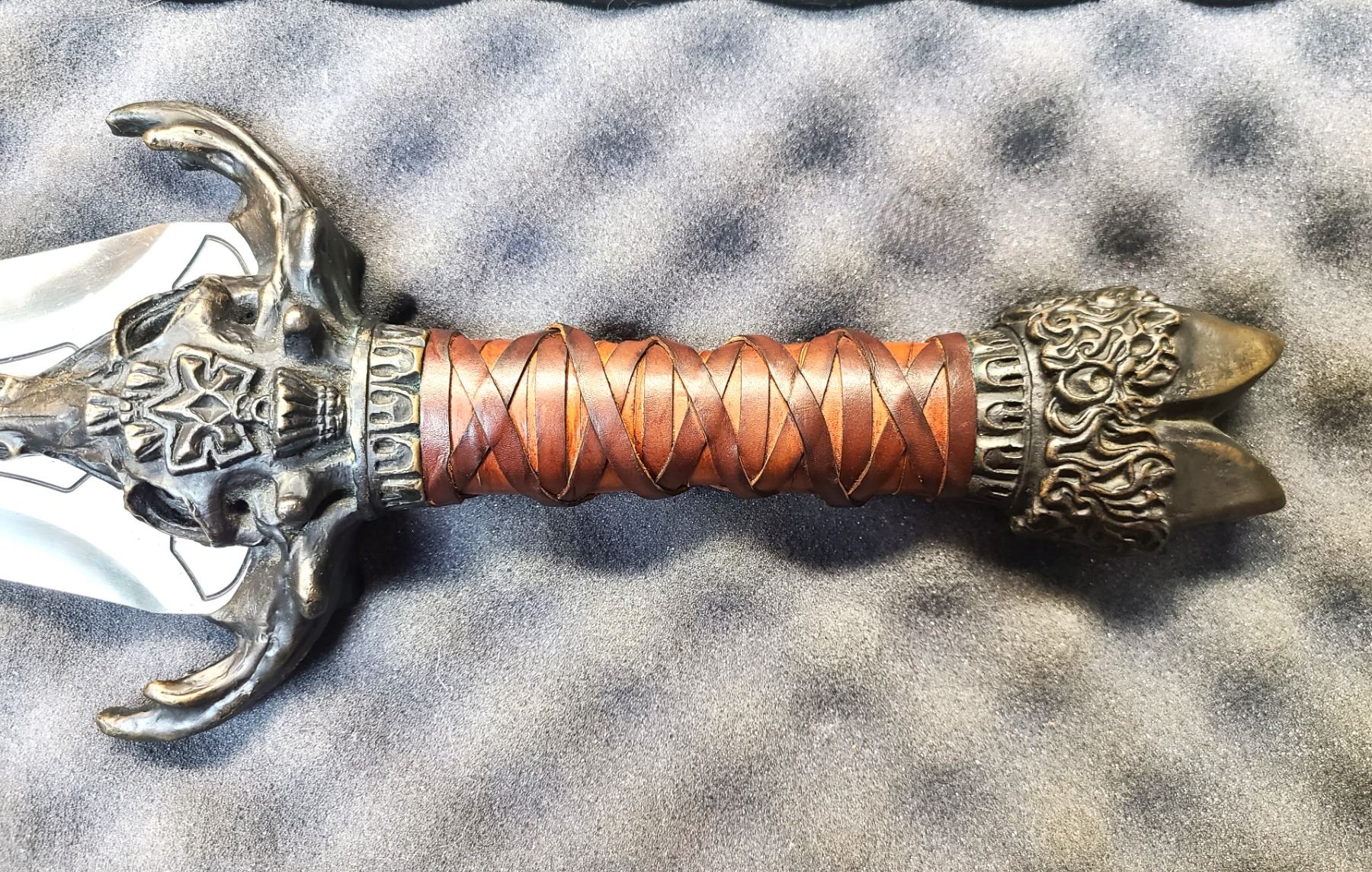 The grip is finished with wrapped brown leather with the Cloven Hoof pommel..