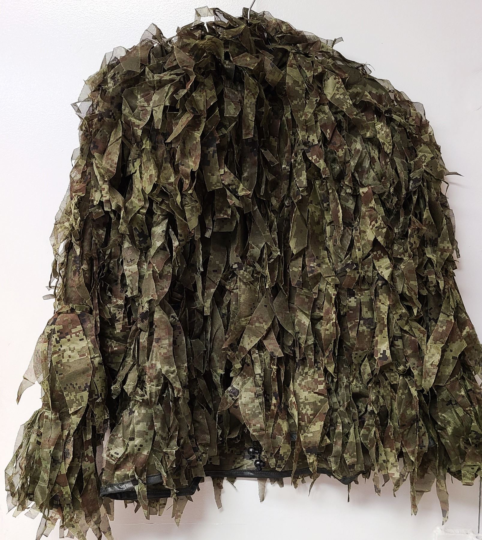The Ghillie Suit is two pieces and contains a jacket with a hood & snap -button down